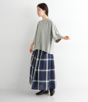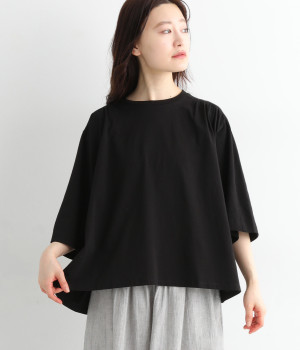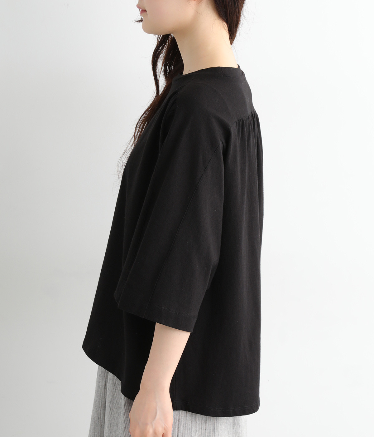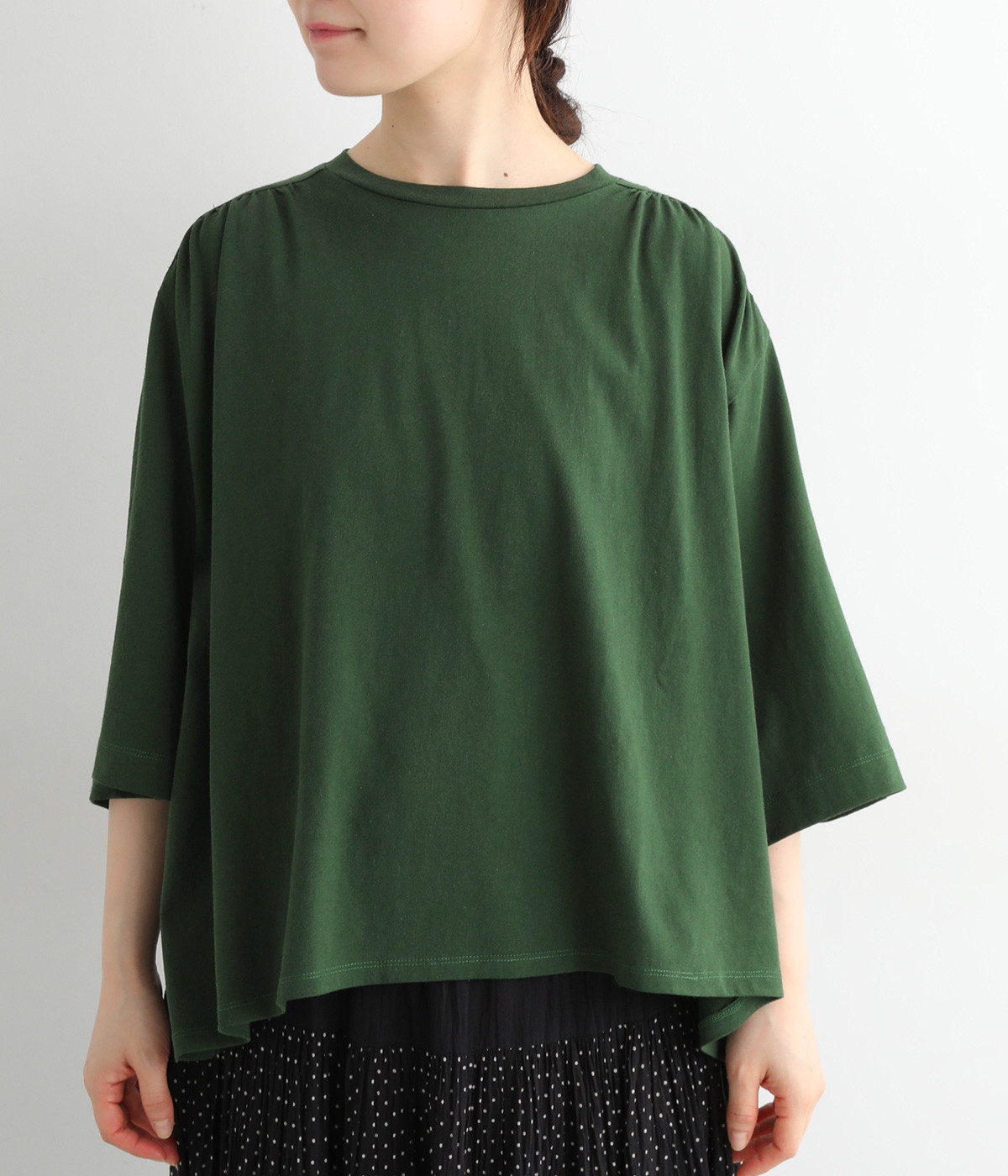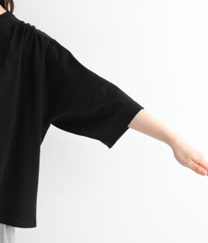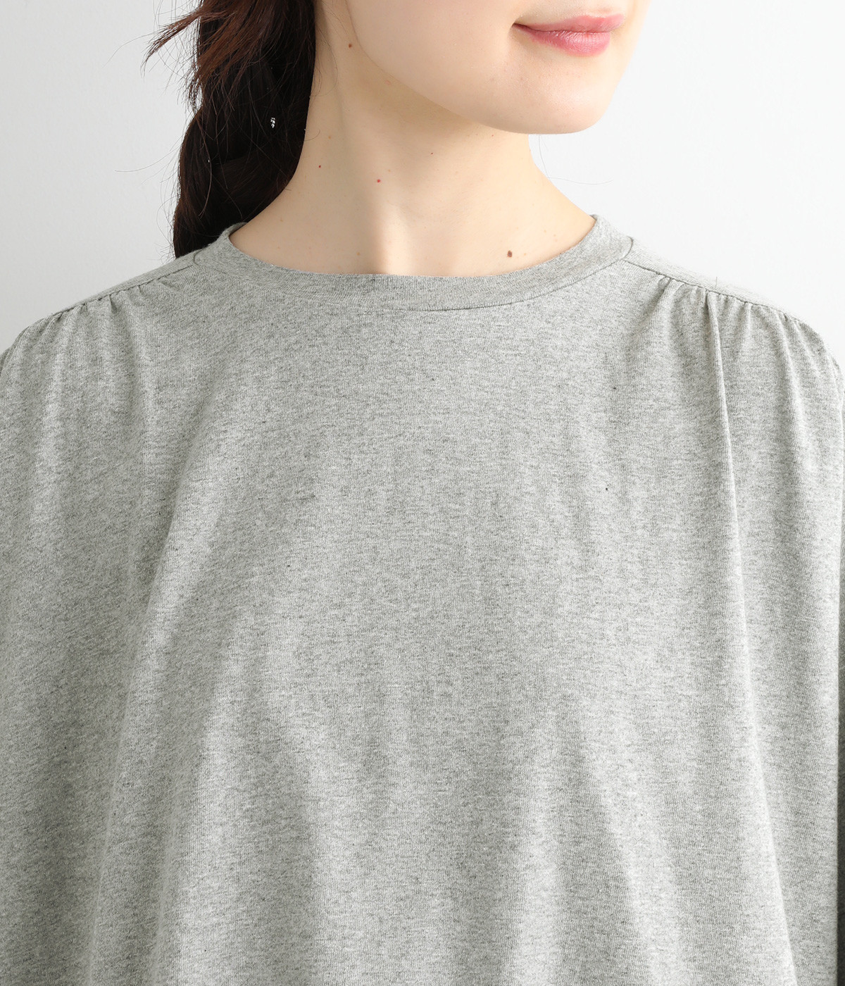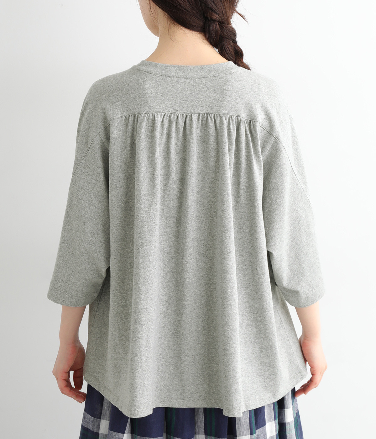 ショルダーラインとバックヨークにギャザーを入れて、ゆったりとしたフレアシルエットに。二の腕や体のラインを拾いにくく、さらりとコーディネートに合わせられます。着丈に前後差があるので、ボリューミーなボトムと好相性。