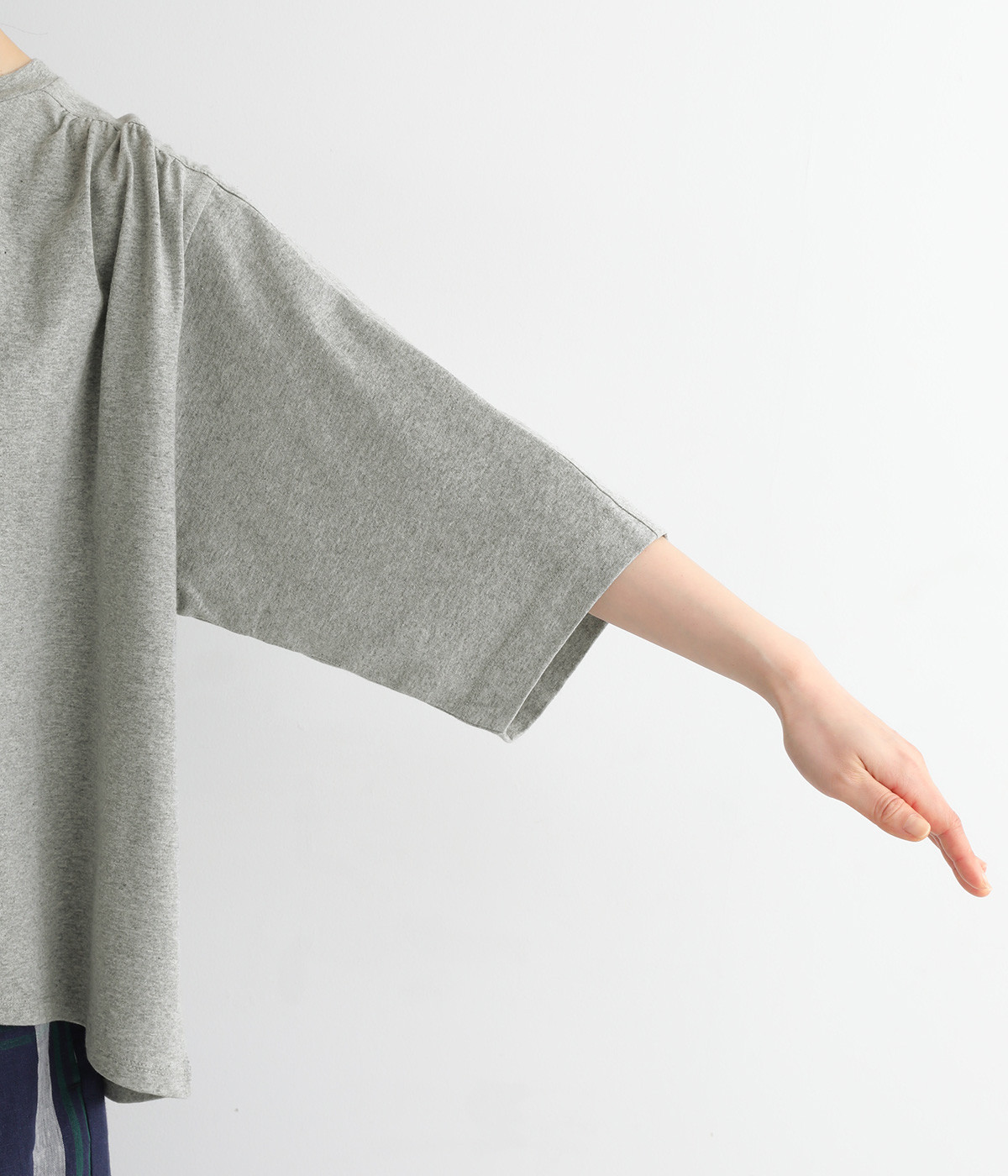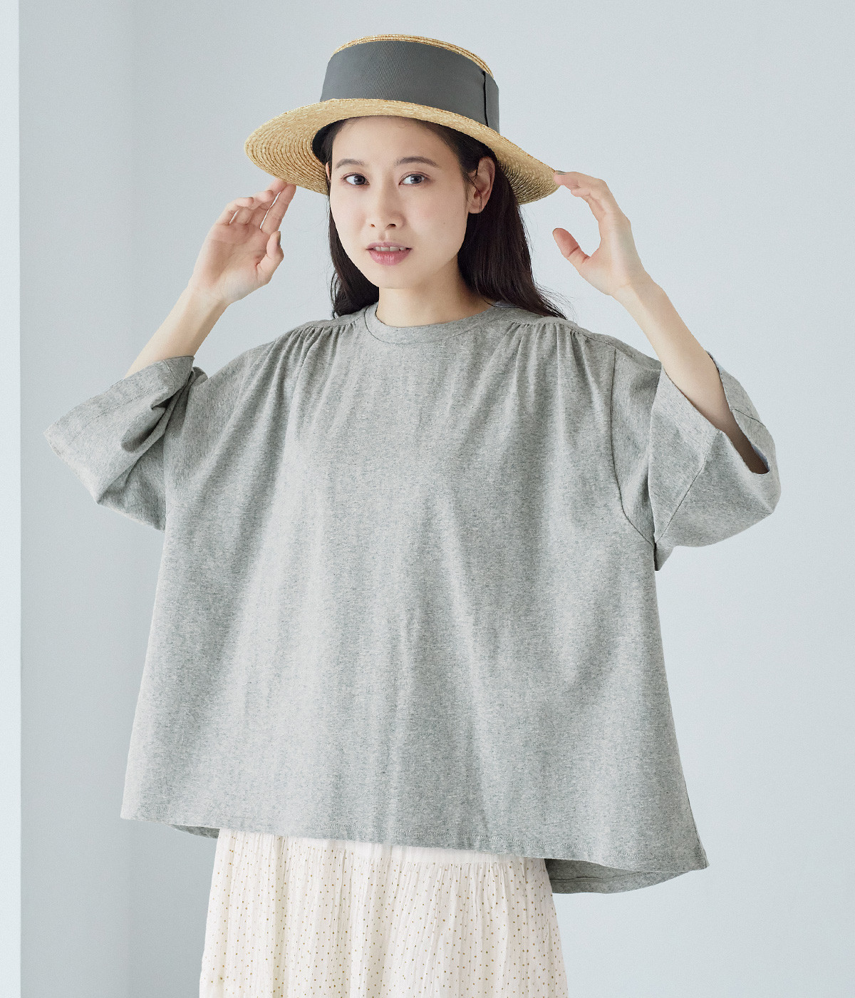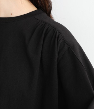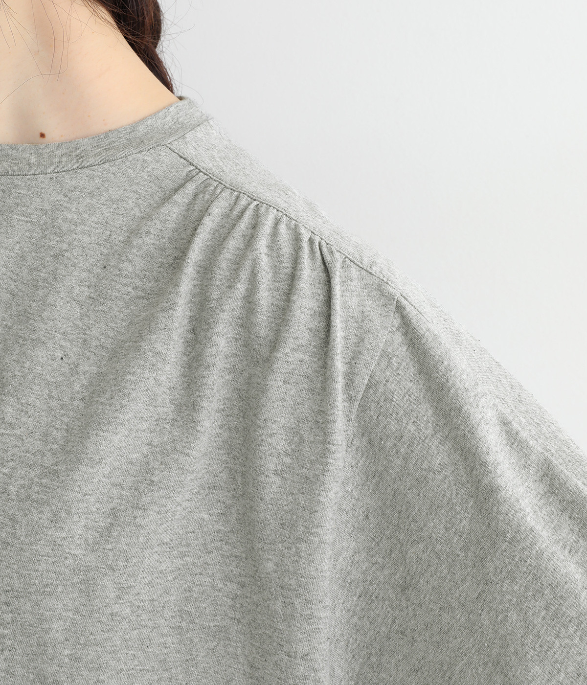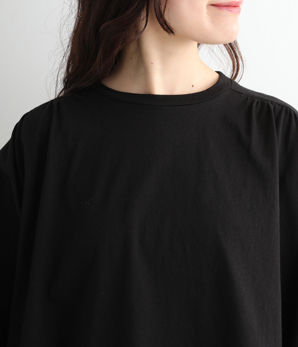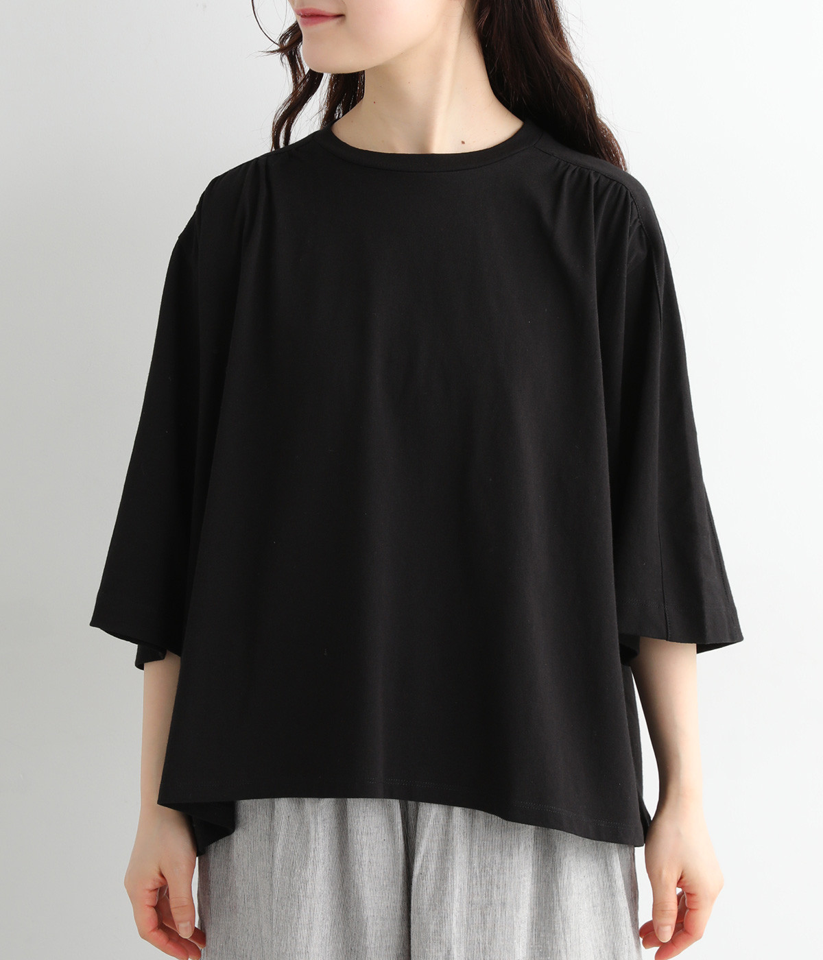 ショルダーラインとバックヨークにギャザーを入れて、ゆったりとしたフレアシルエットに。二の腕や体のラインを拾いにくく、さらりとコーディネートに合わせられます。着丈に前後差があるので、ボリューミーなボトムと好相性。