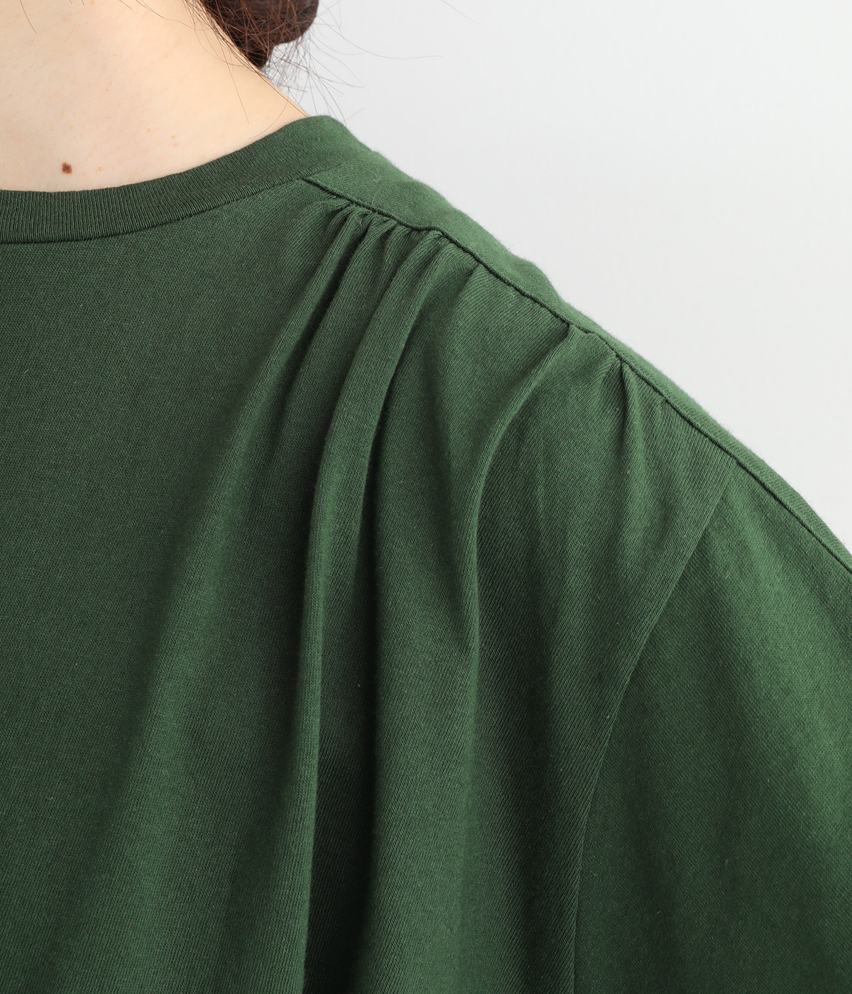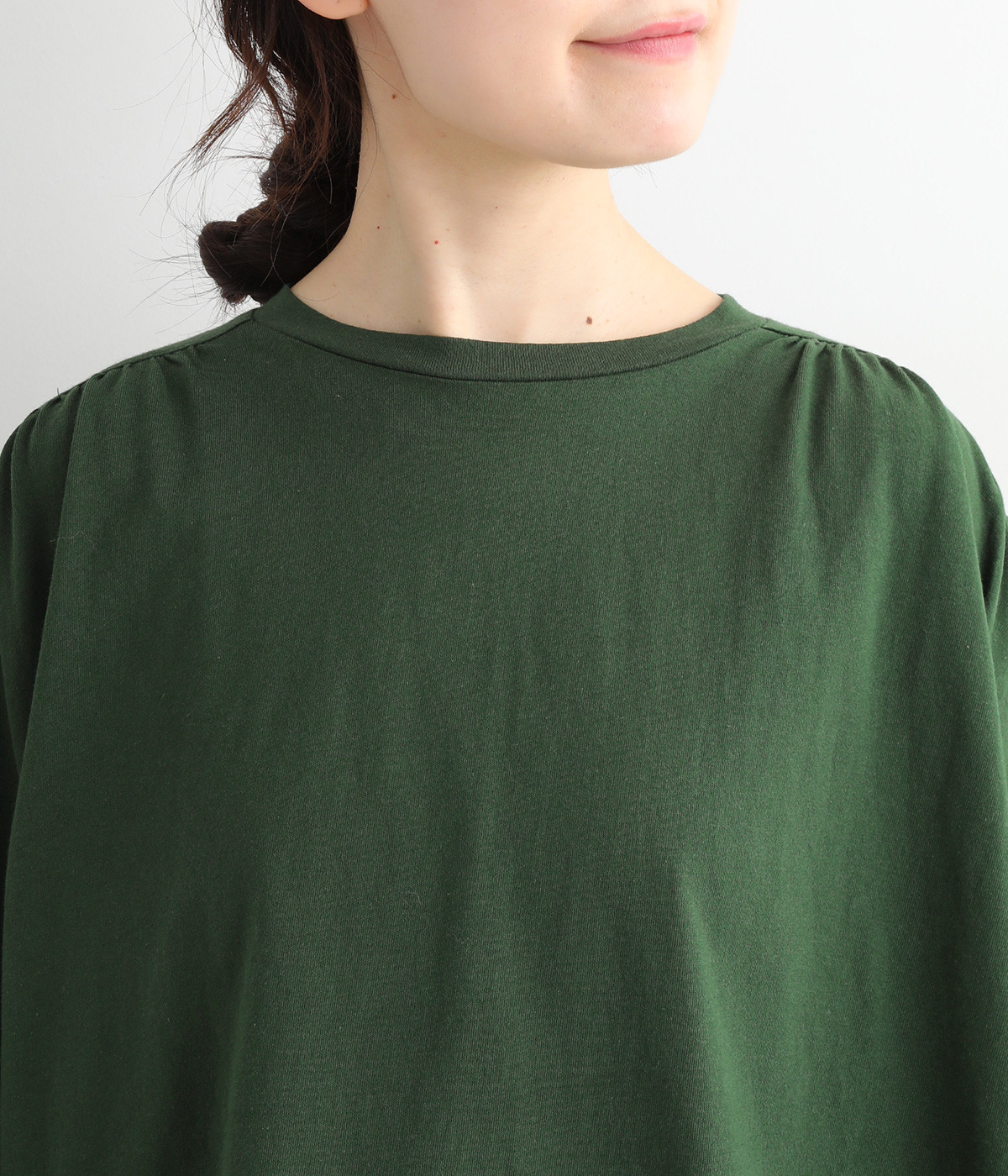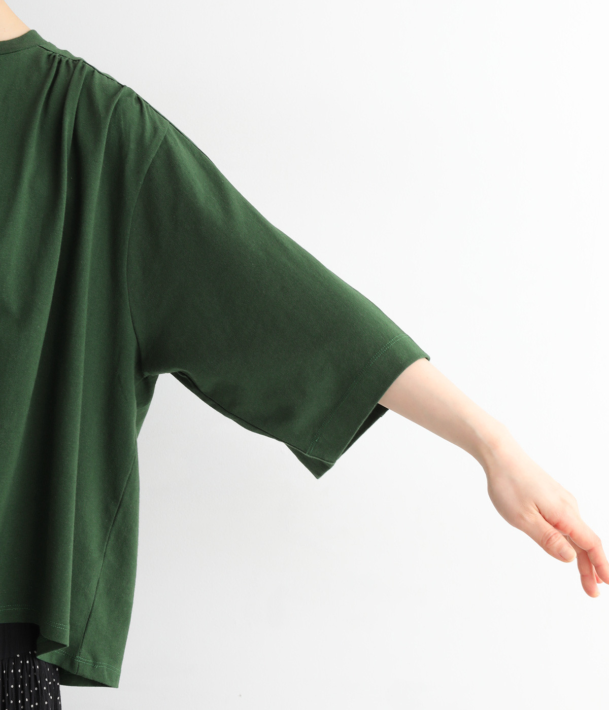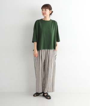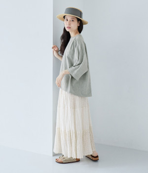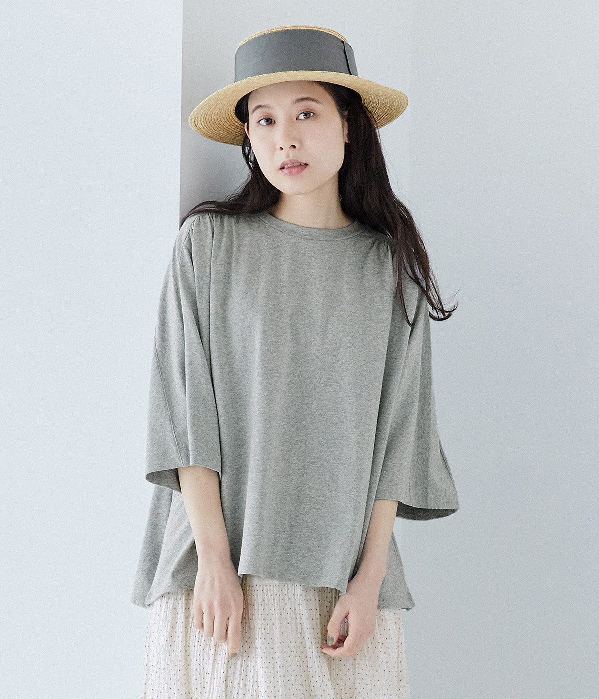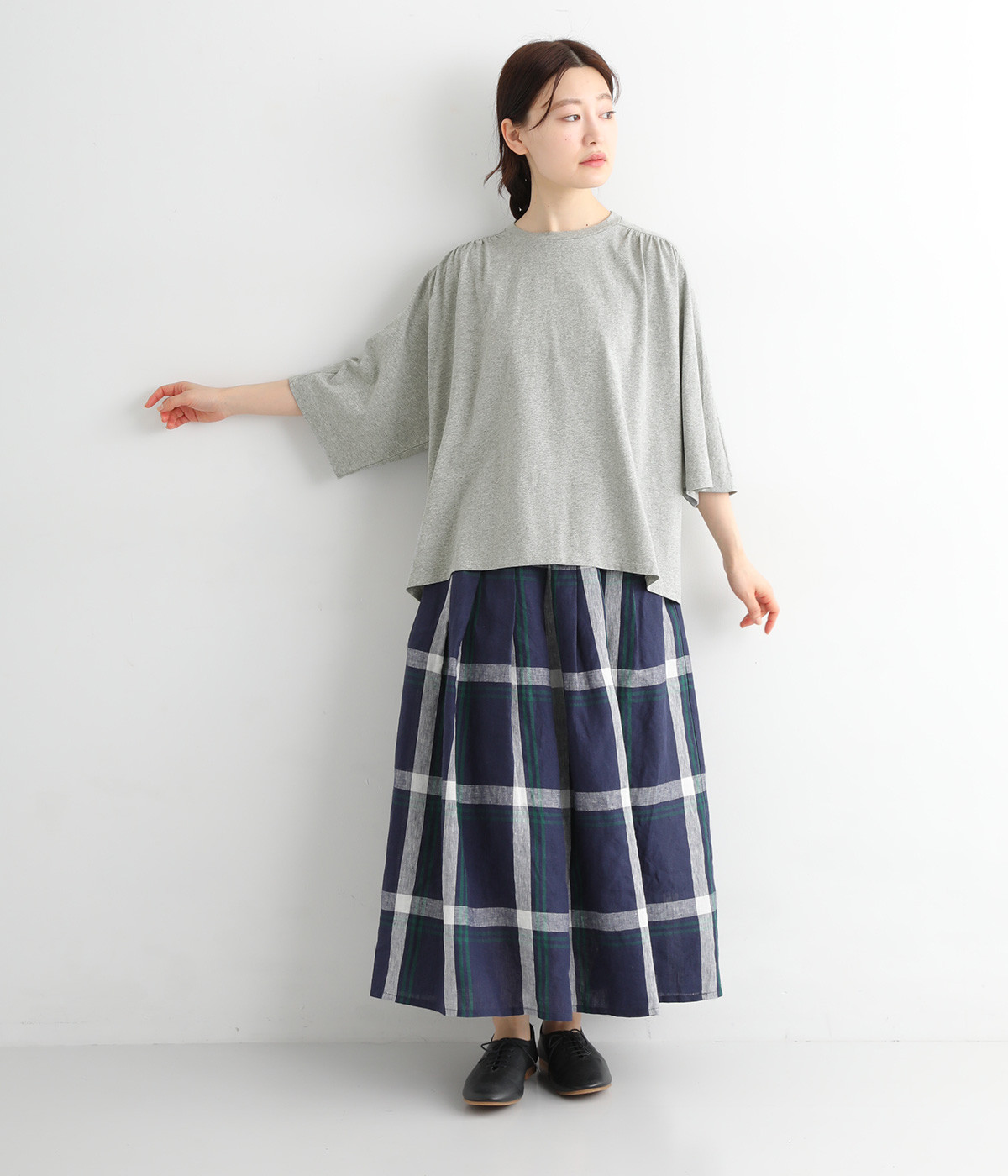 ショルダーラインとバックヨークにギャザーを入れて、ゆったりとしたフレアシルエットに。二の腕や体のラインを拾いにくく、さらりとコーディネートに合わせられます。着丈に前後差があるので、ボリューミーなボトムと好相性。