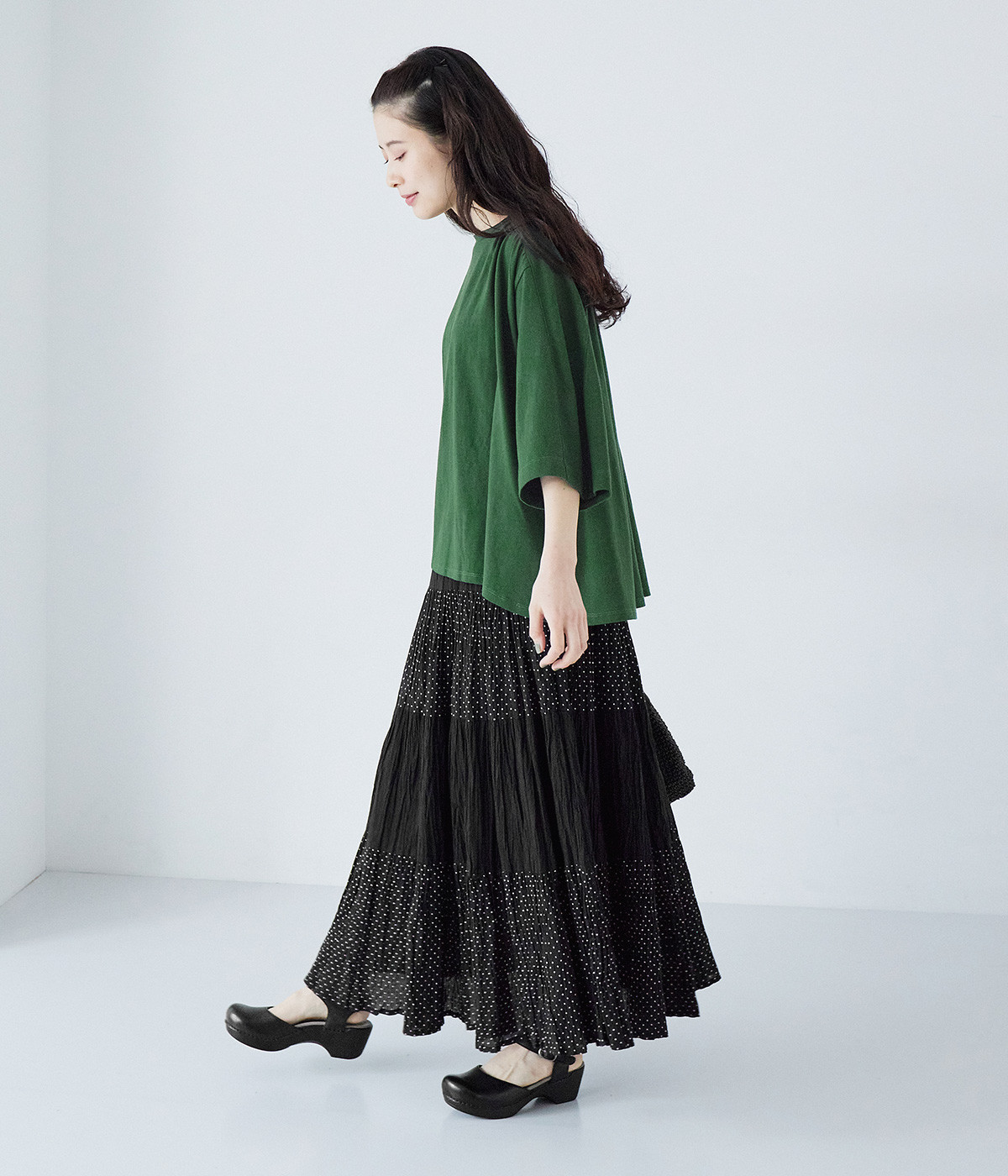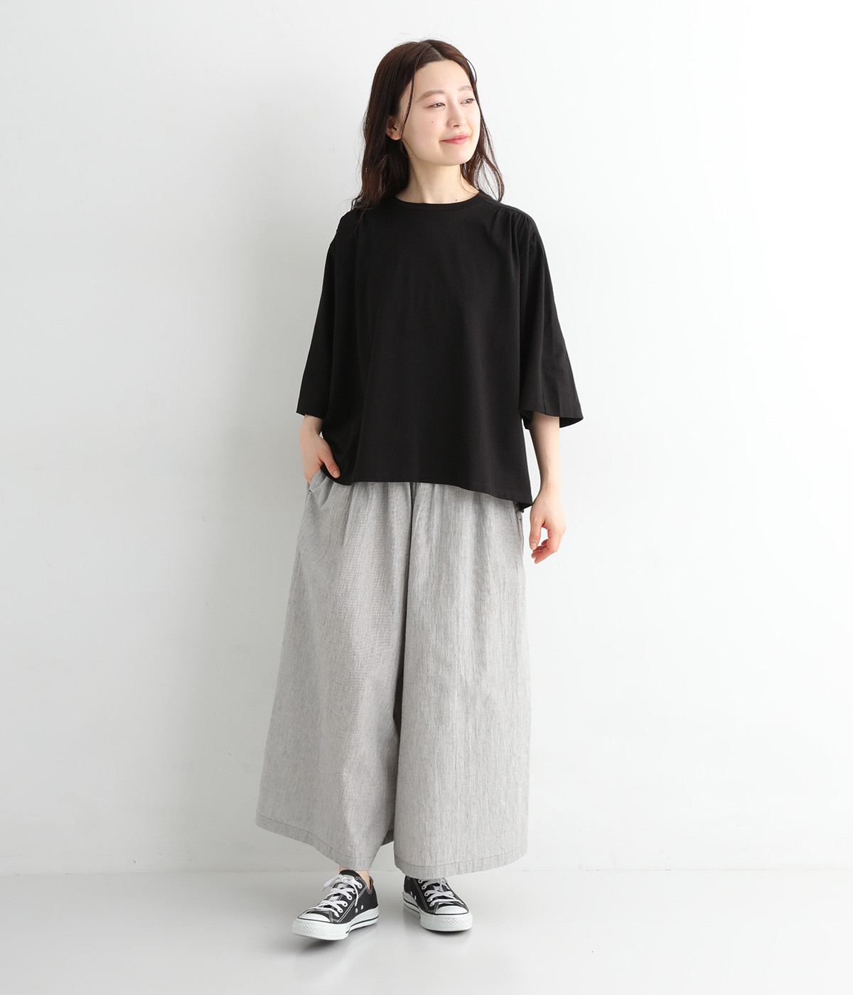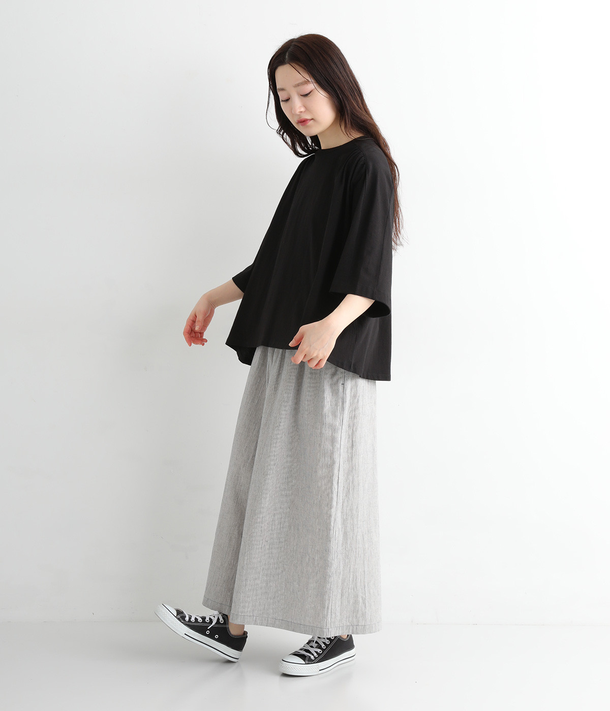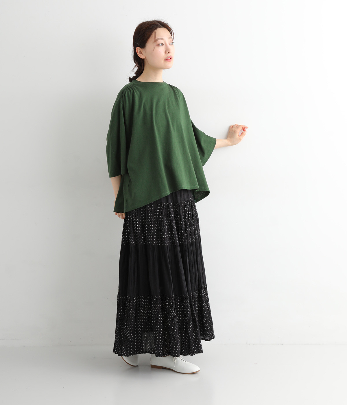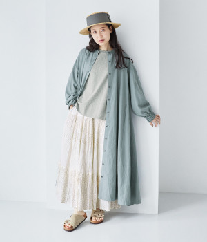 ショルダーラインとバックヨークにギャザーを入れて、ゆったりとしたフレアシルエットに。二の腕や体のラインを拾いにくく、さらりとコーディネートに合わせられます。着丈に前後差があるので、ボリューミーなボトムと好相性。