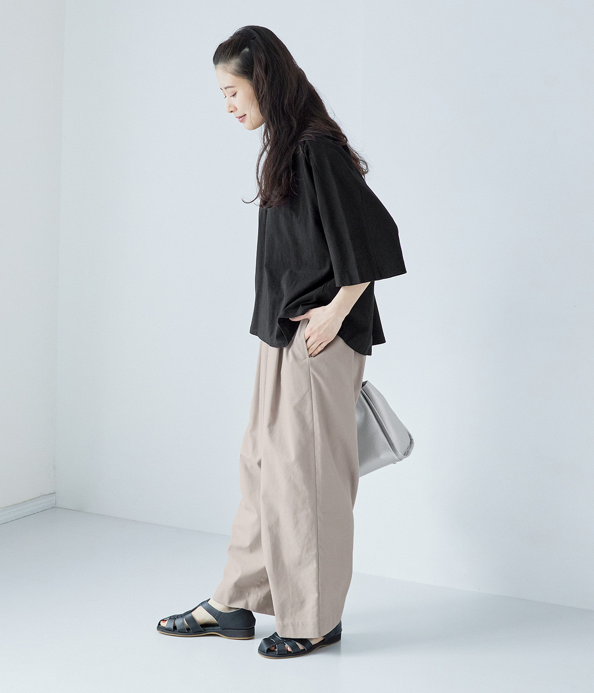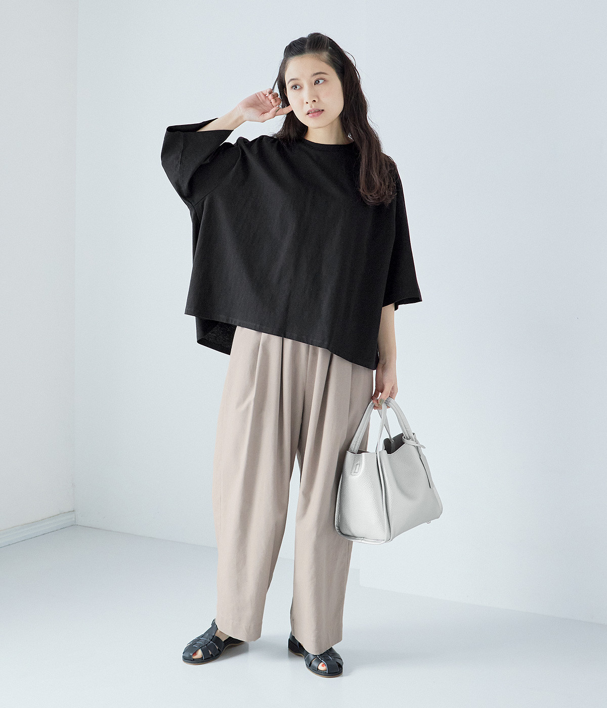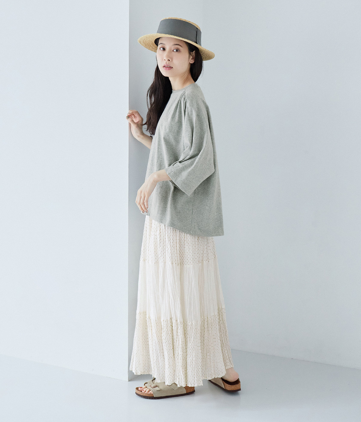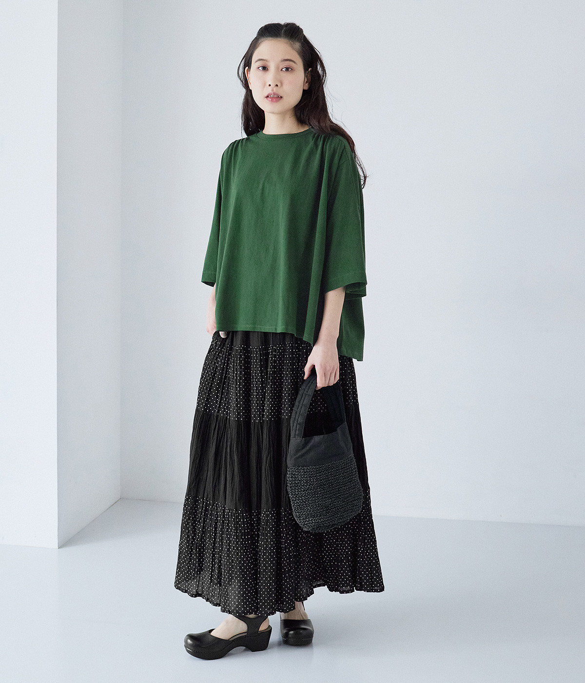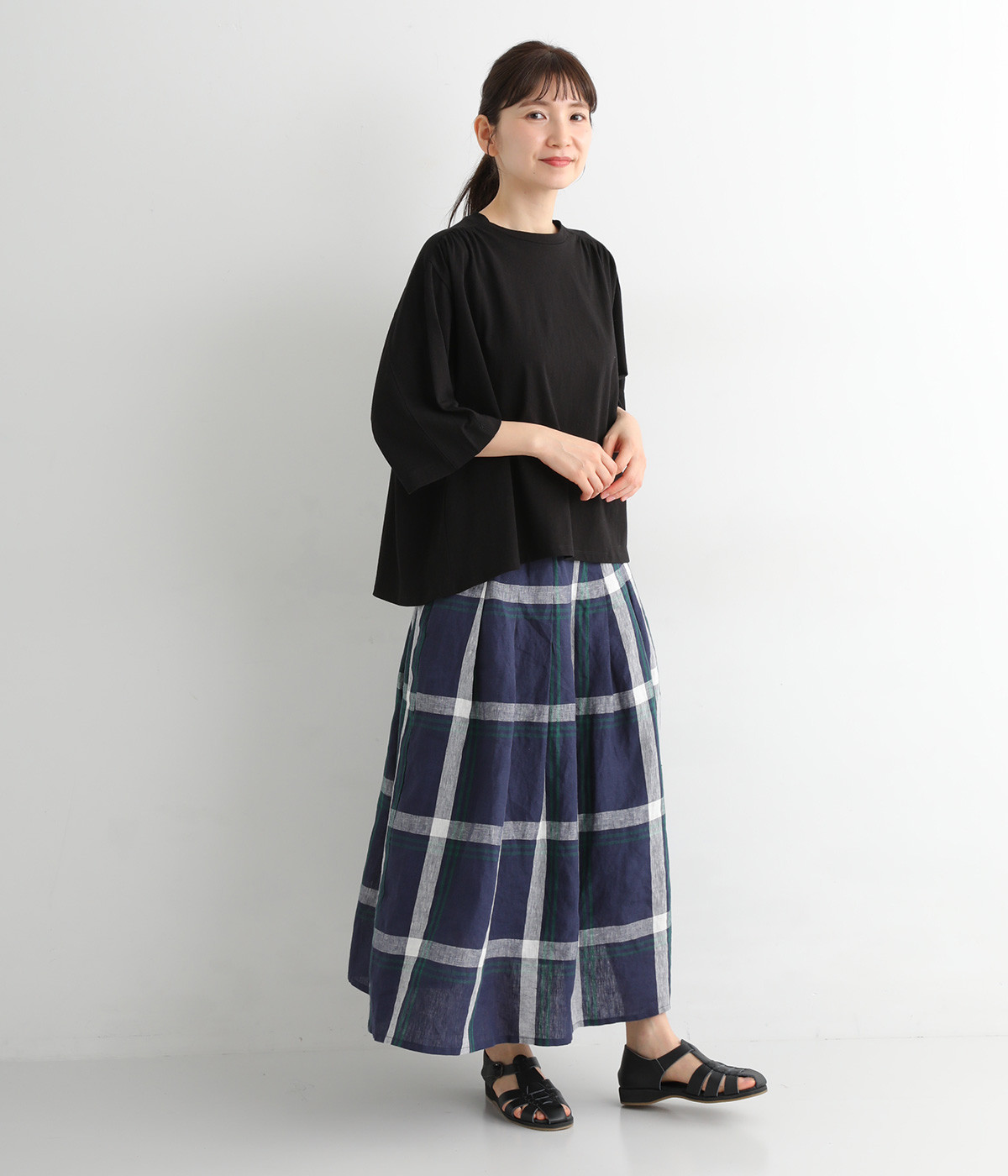 ショルダーラインとバックヨークにギャザーを入れて、ゆったりとしたフレアシルエットに。二の腕や体のラインを拾いにくく、さらりとコーディネートに合わせられます。着丈に前後差があるので、ボリューミーなボトムと好相性。