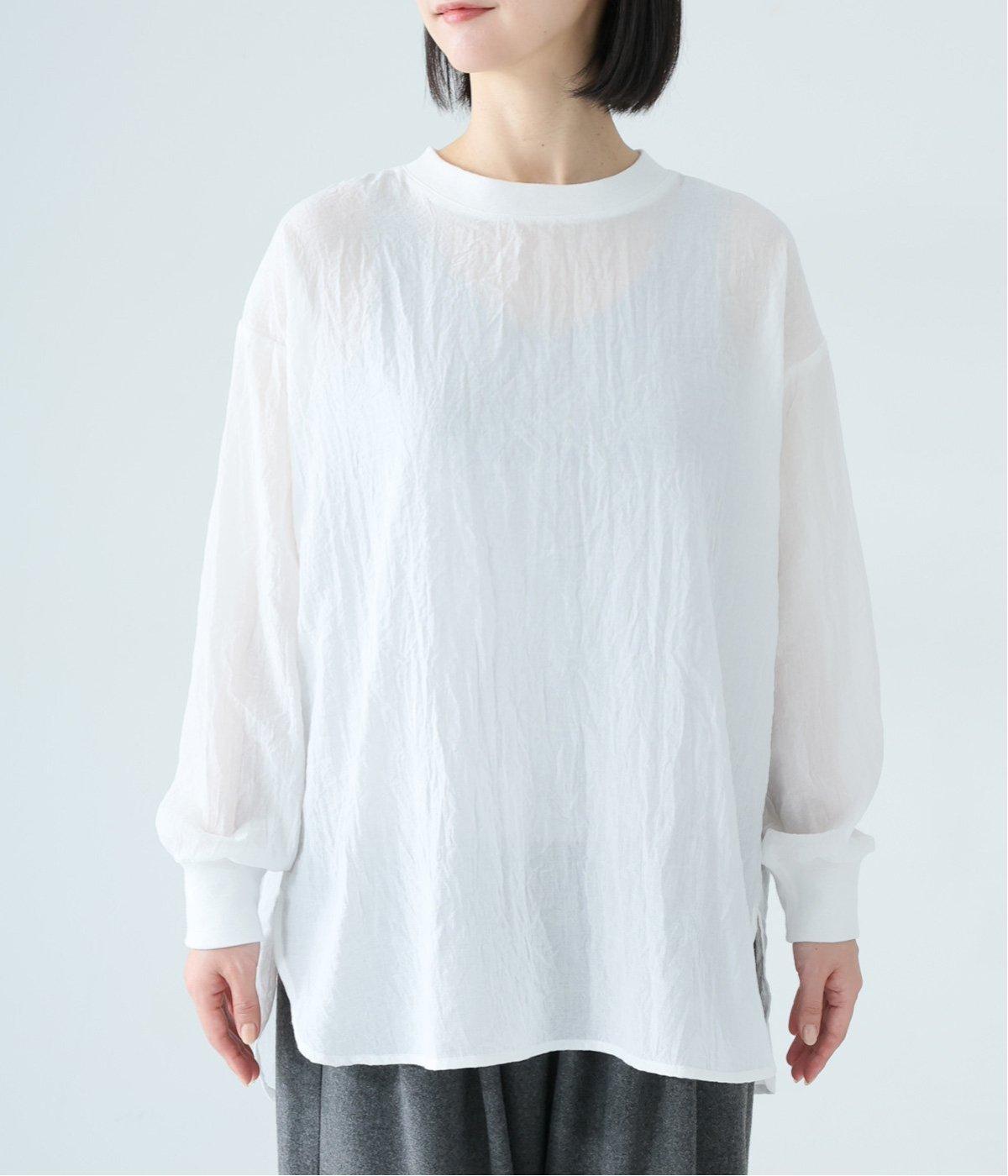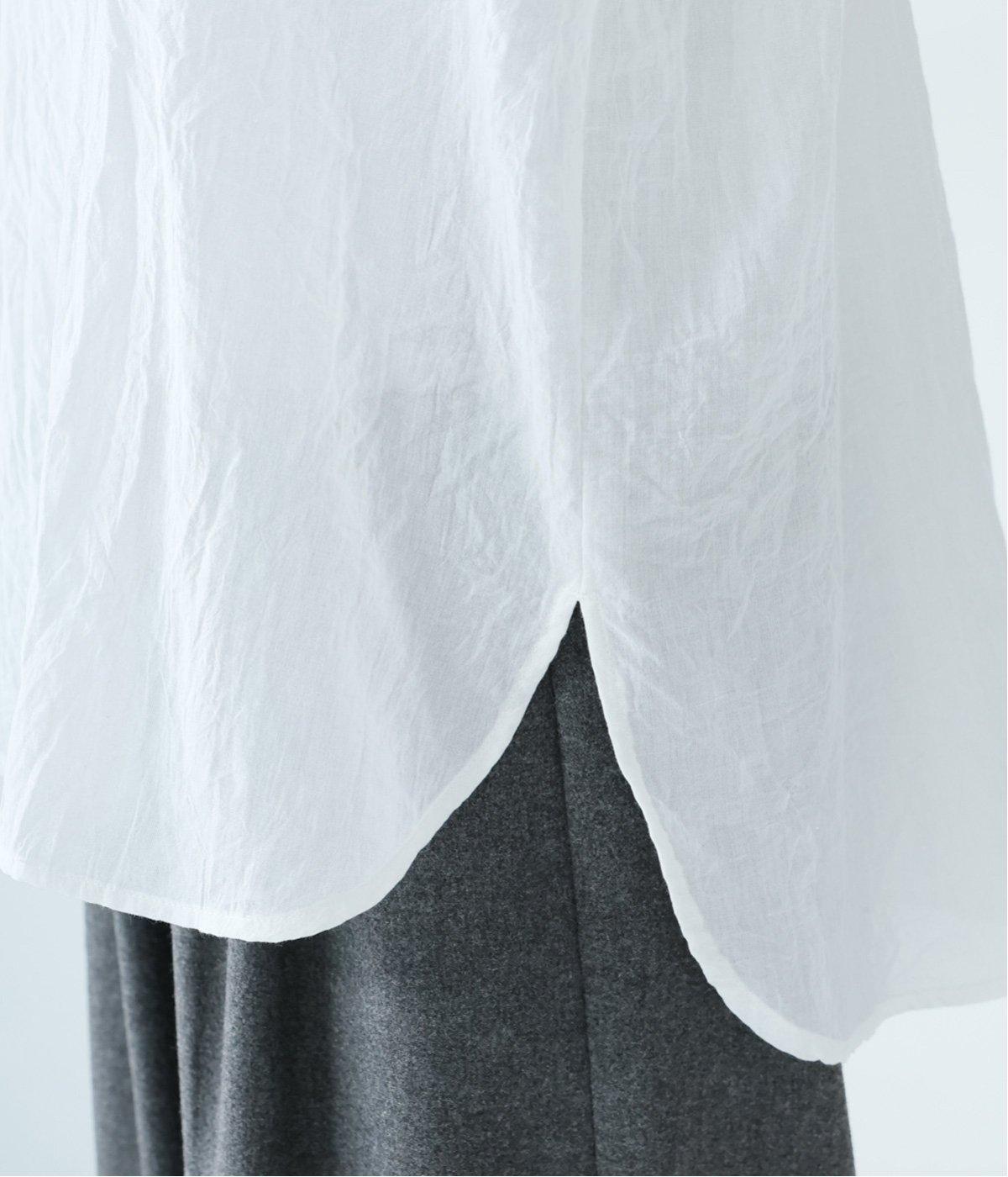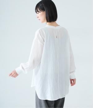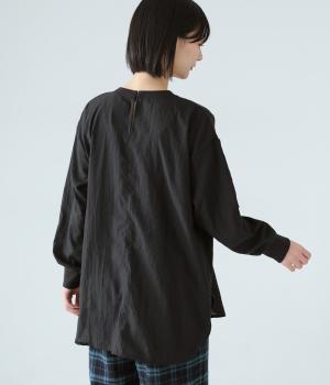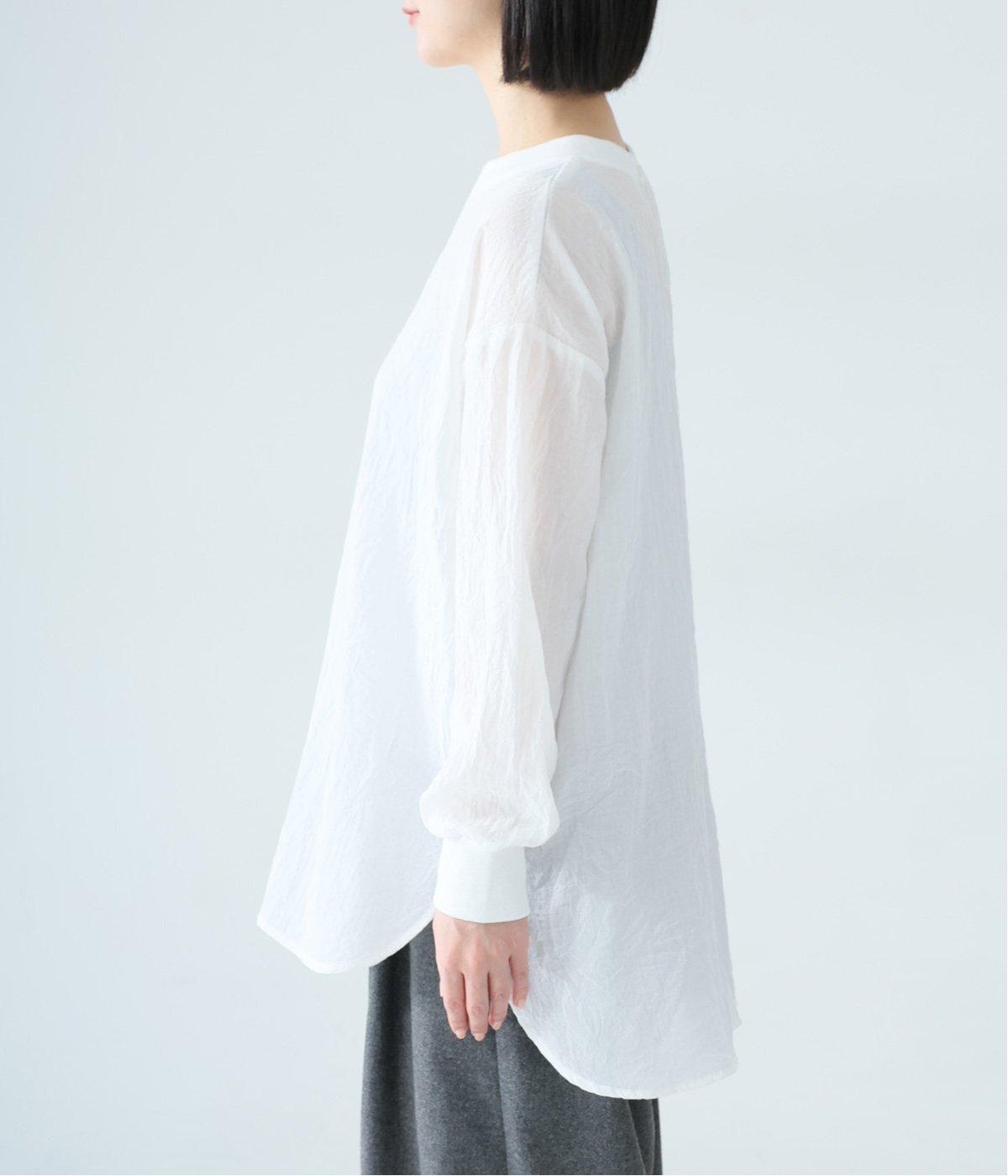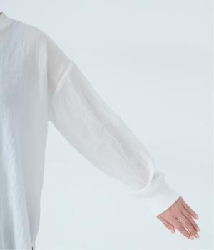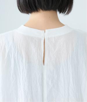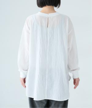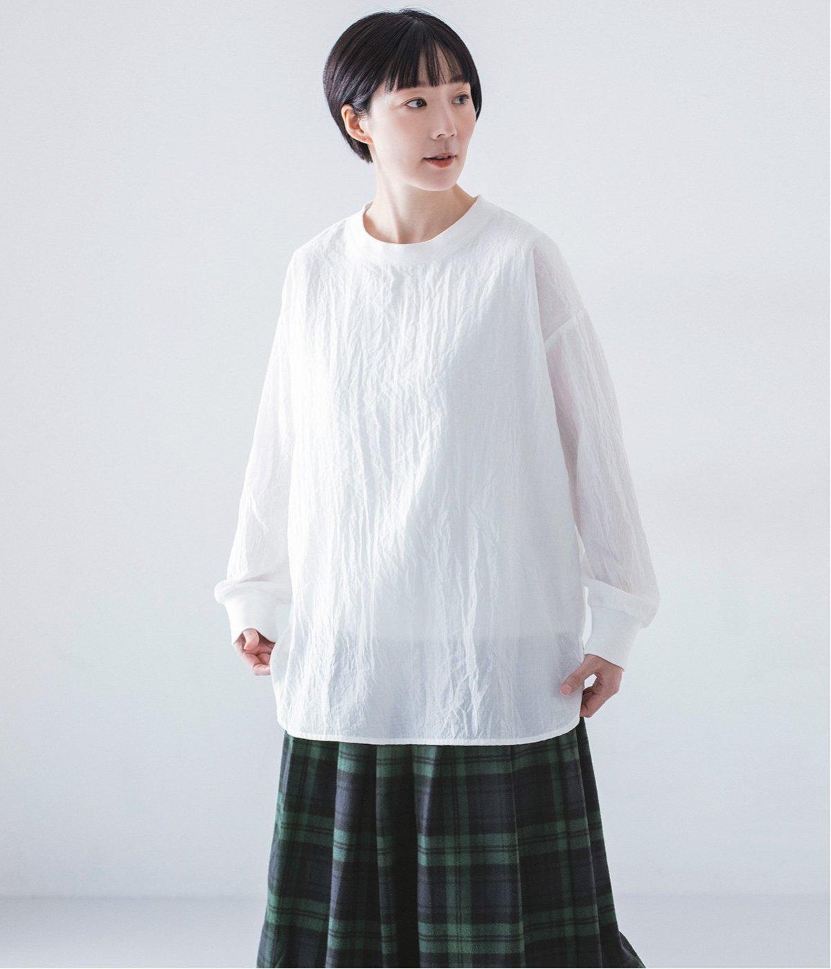 上品な透け感のあるとても軽やかな風合いのコットン混生地を使用しています。洗いざらしのようなシワ感がナチュラルなムードを演出。首まわりと袖口に伸縮性のあるリブをプラスしました。