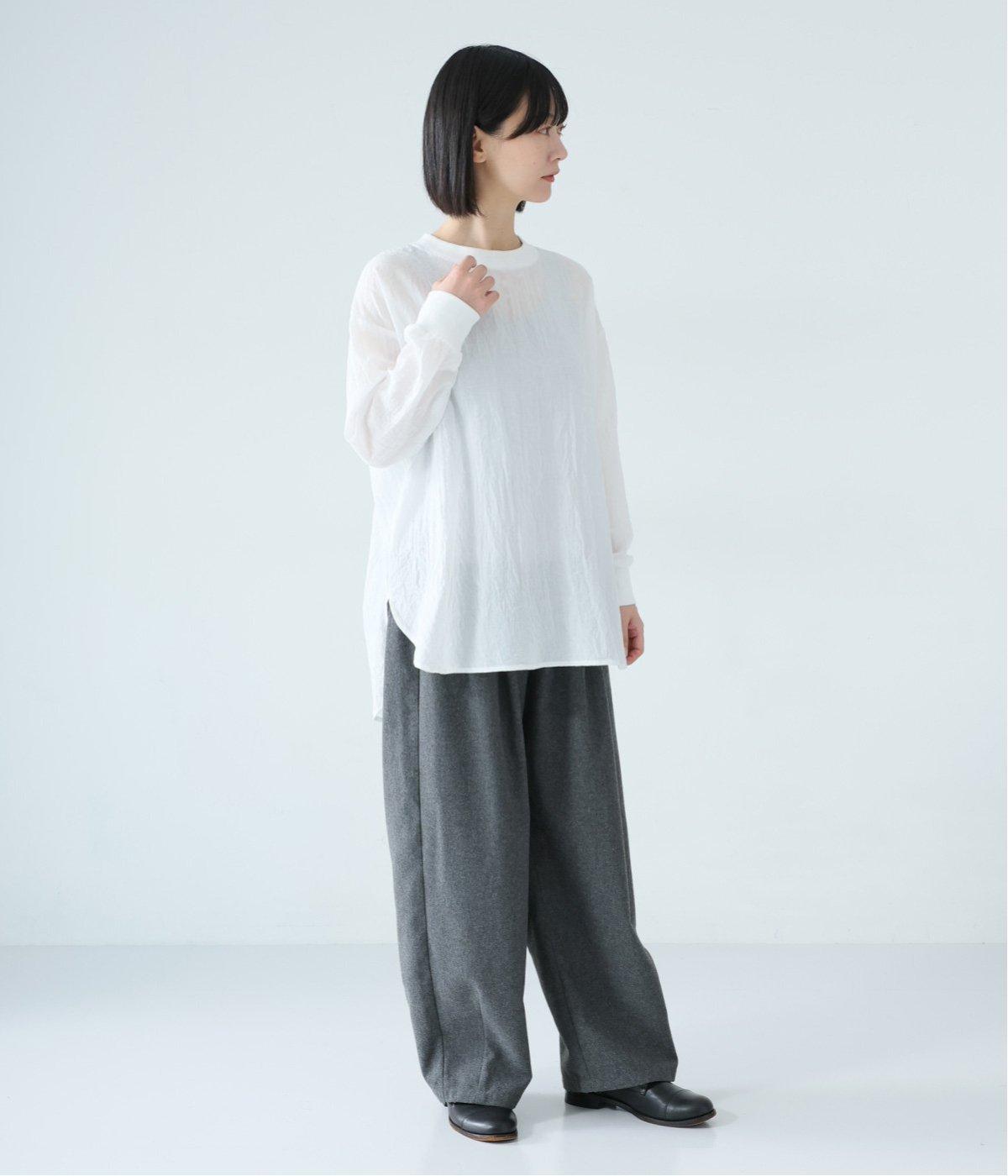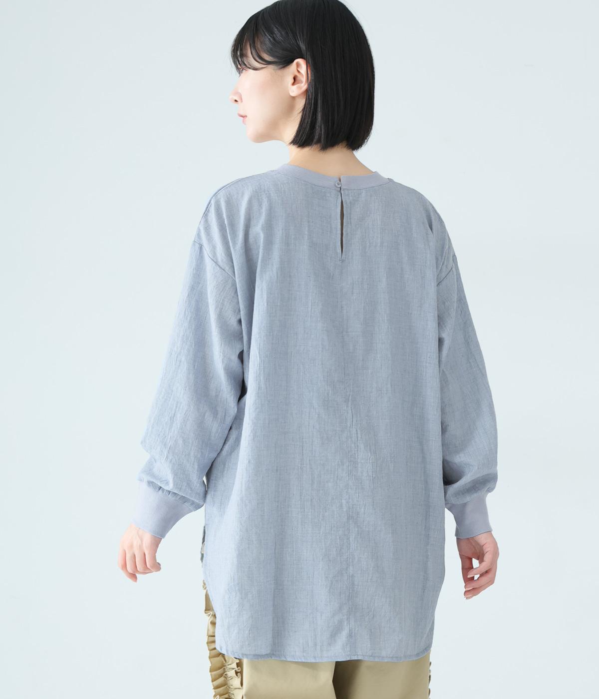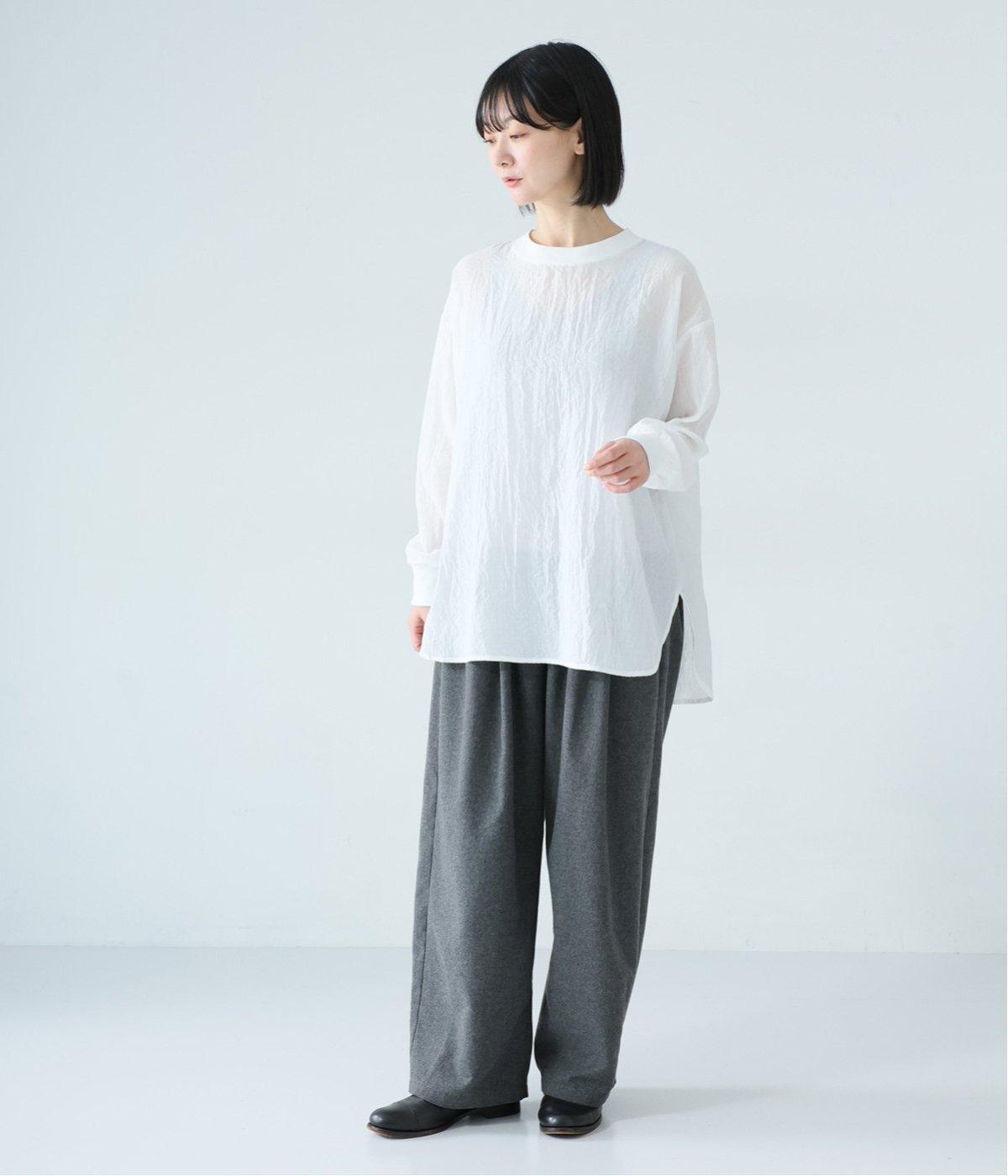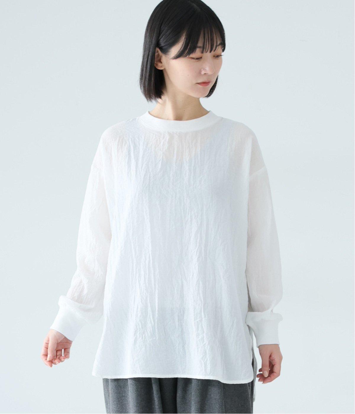 上品な透け感のあるとても軽やかな風合いのコットン混生地を使用しています。洗いざらしのようなシワ感がナチュラルなムードを演出。首まわりと袖口に伸縮性のあるリブをプラスしました。