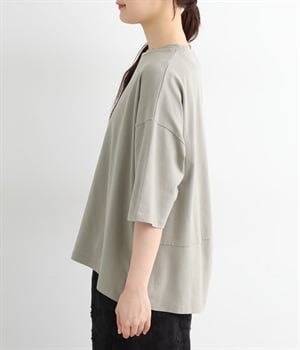 ベーシックなTシャツのかたちですが、身幅をゆったり、袖丈もやや長めに。後ろに切り替えを入れた、ふんわり丸みのあるシルエットが特徴です。