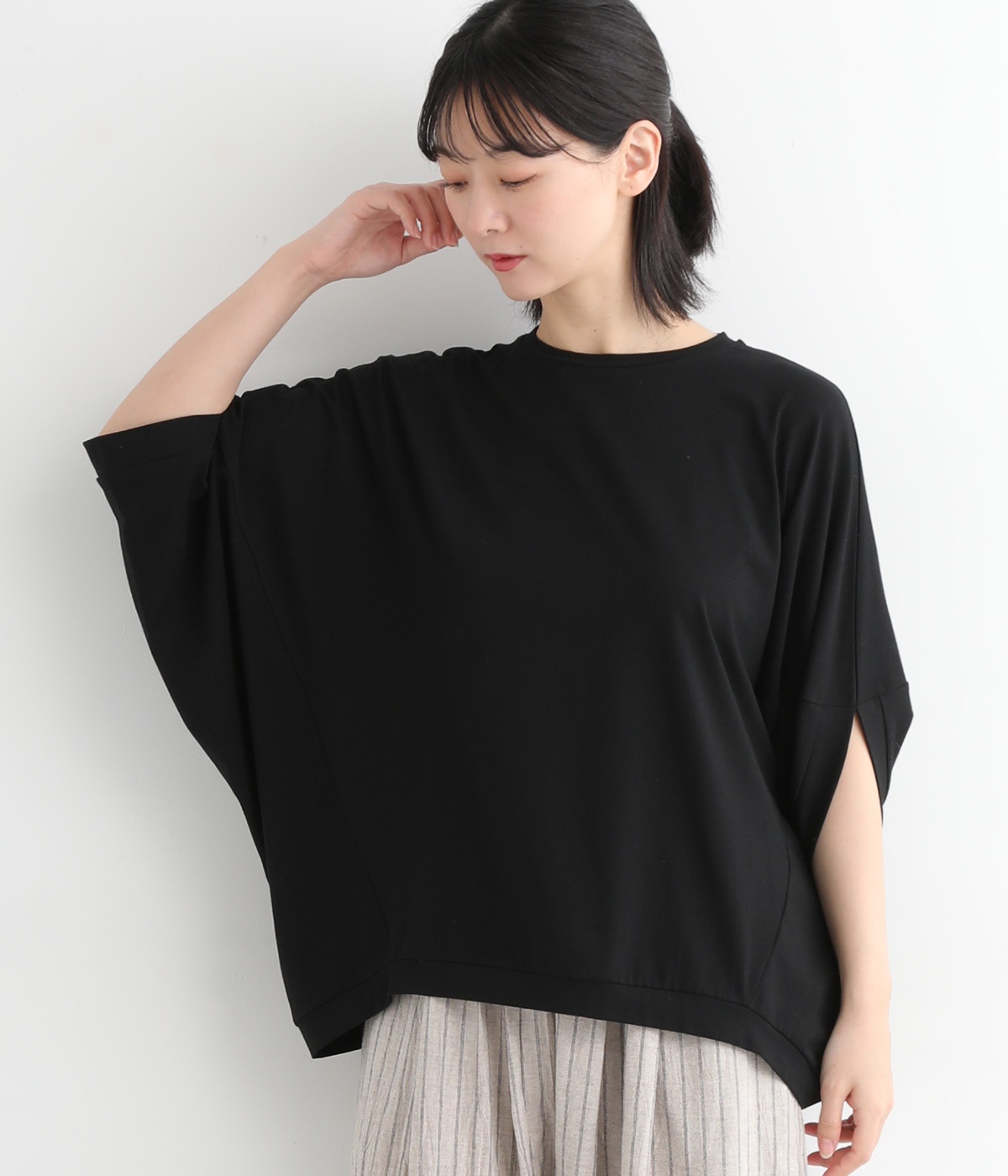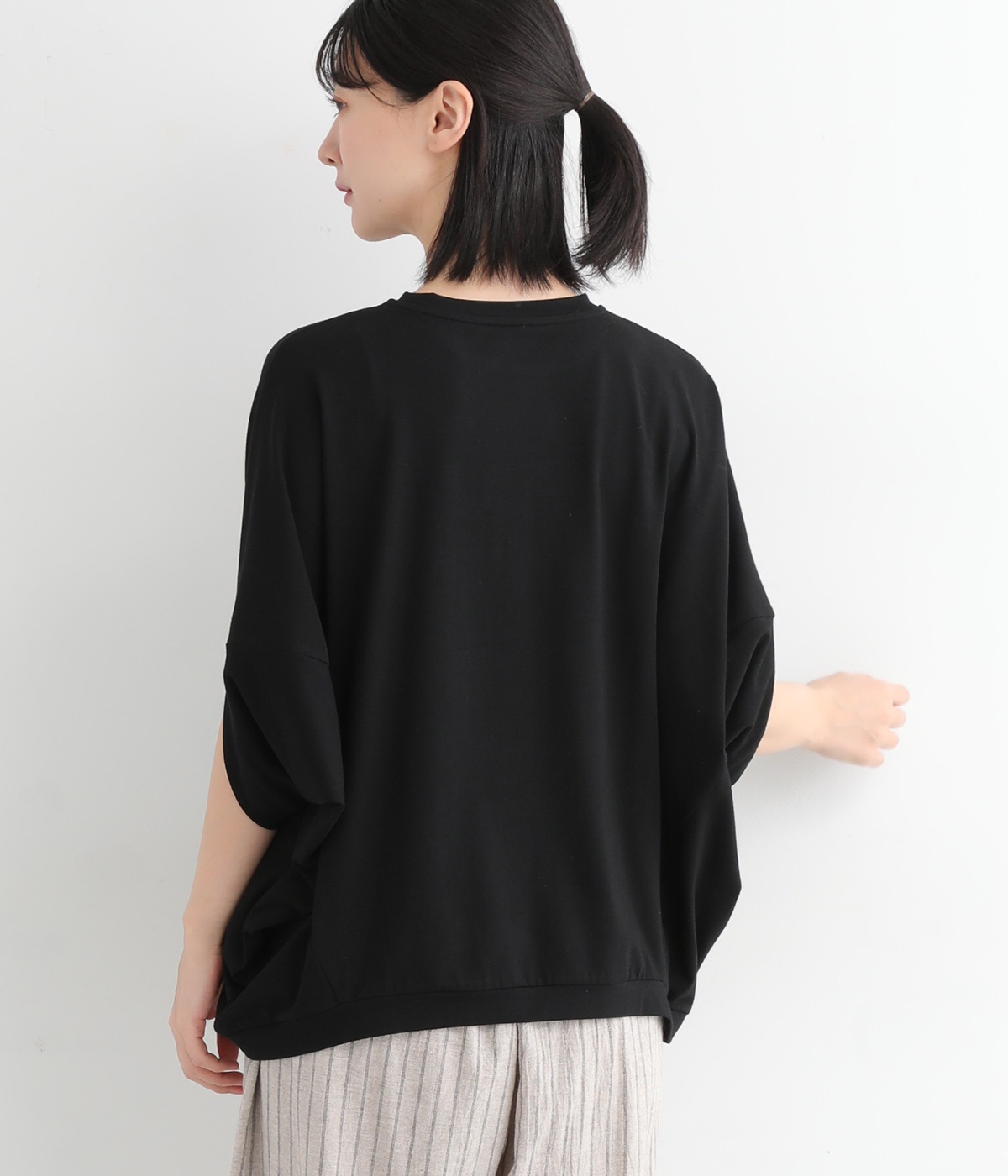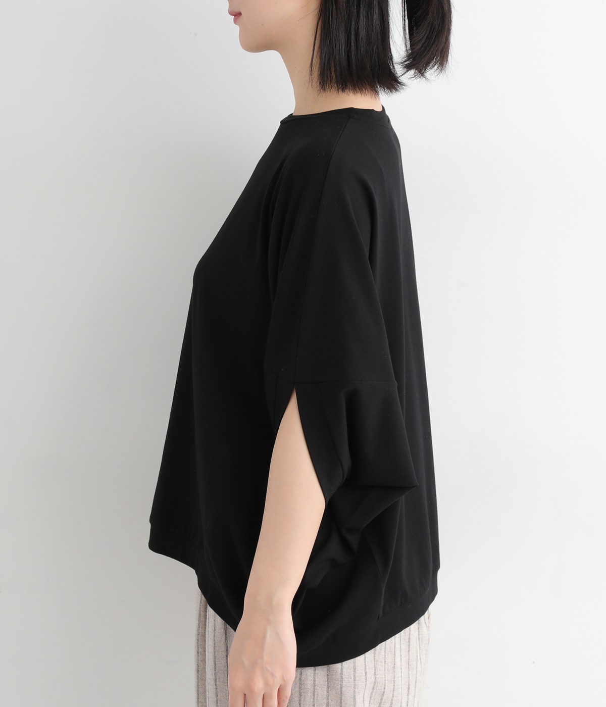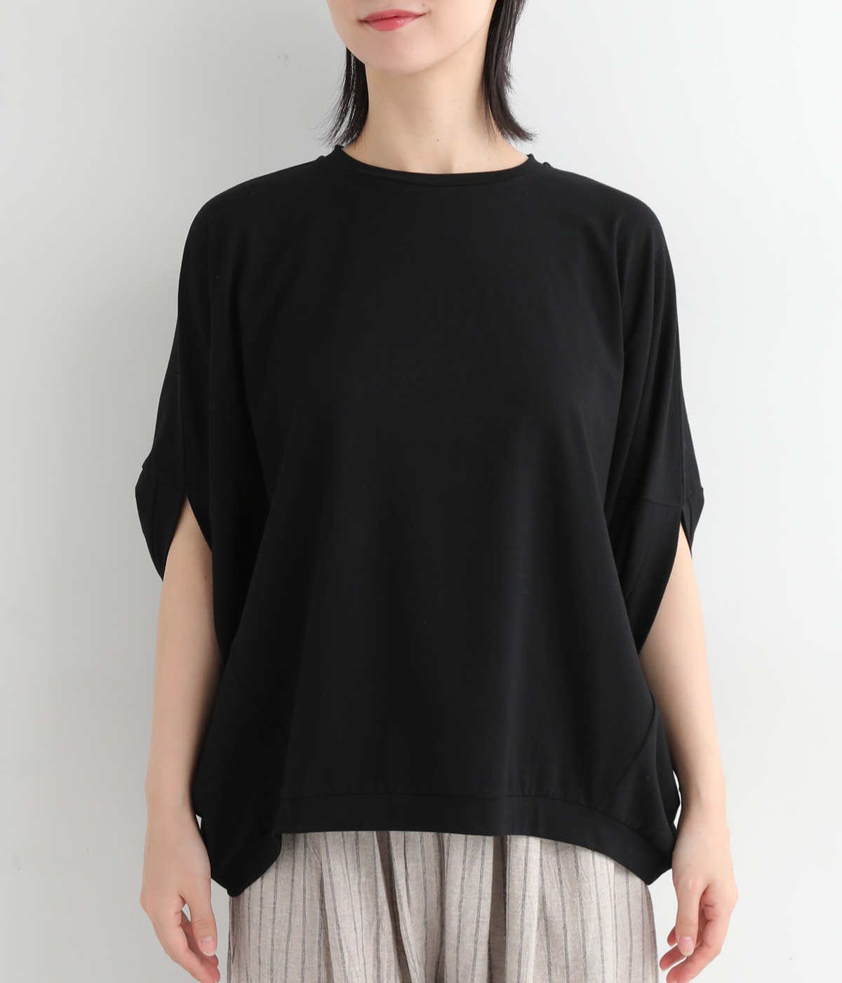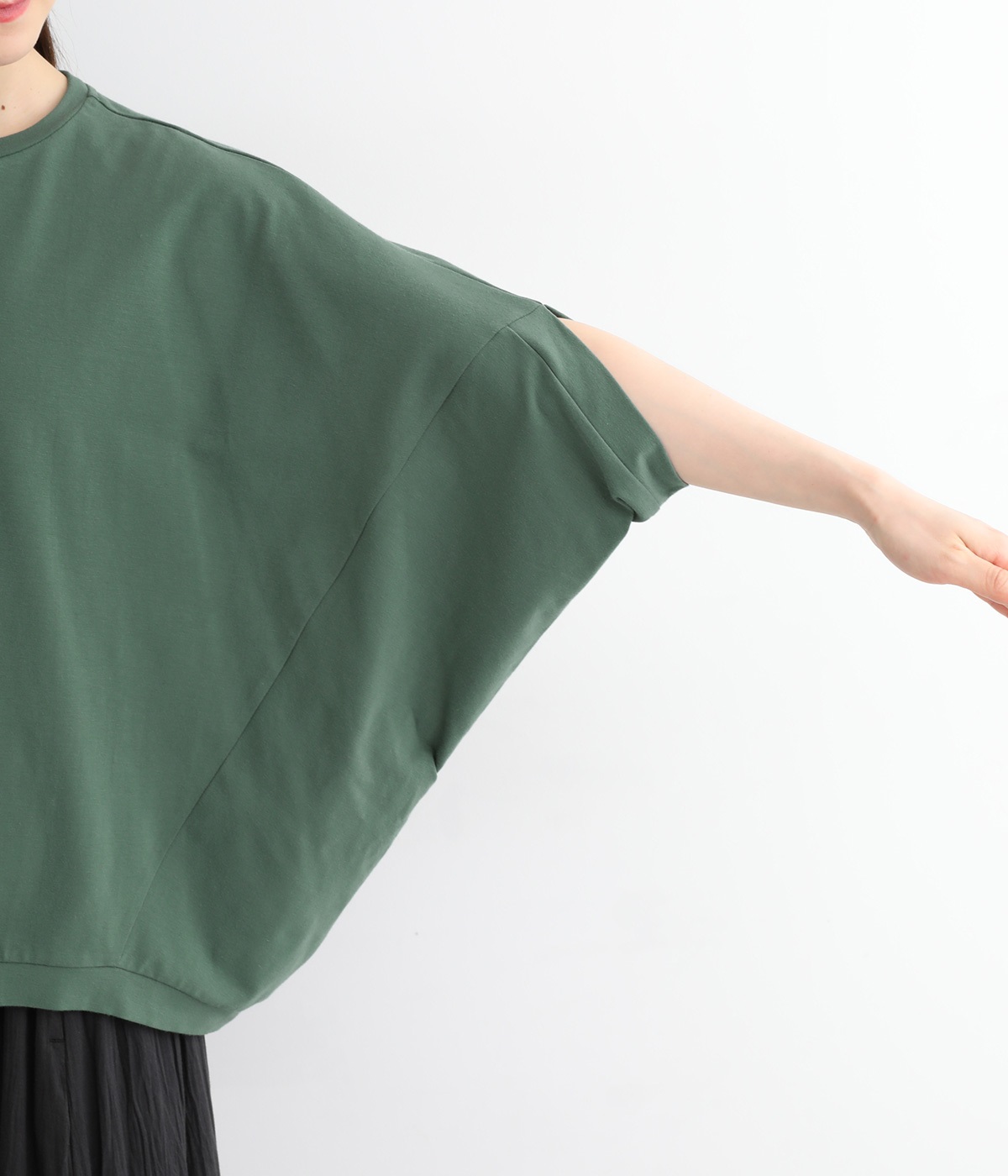 ゆったりとしたシルエットにポンチョスリーブが特徴的なプルオーバーです。着用すると脇下からサイドが自然と垂れるつくりに。カジュアルテイストな素材ながらドレープが生まれて、大人顔なスタイリングがたのしめる一枚です。