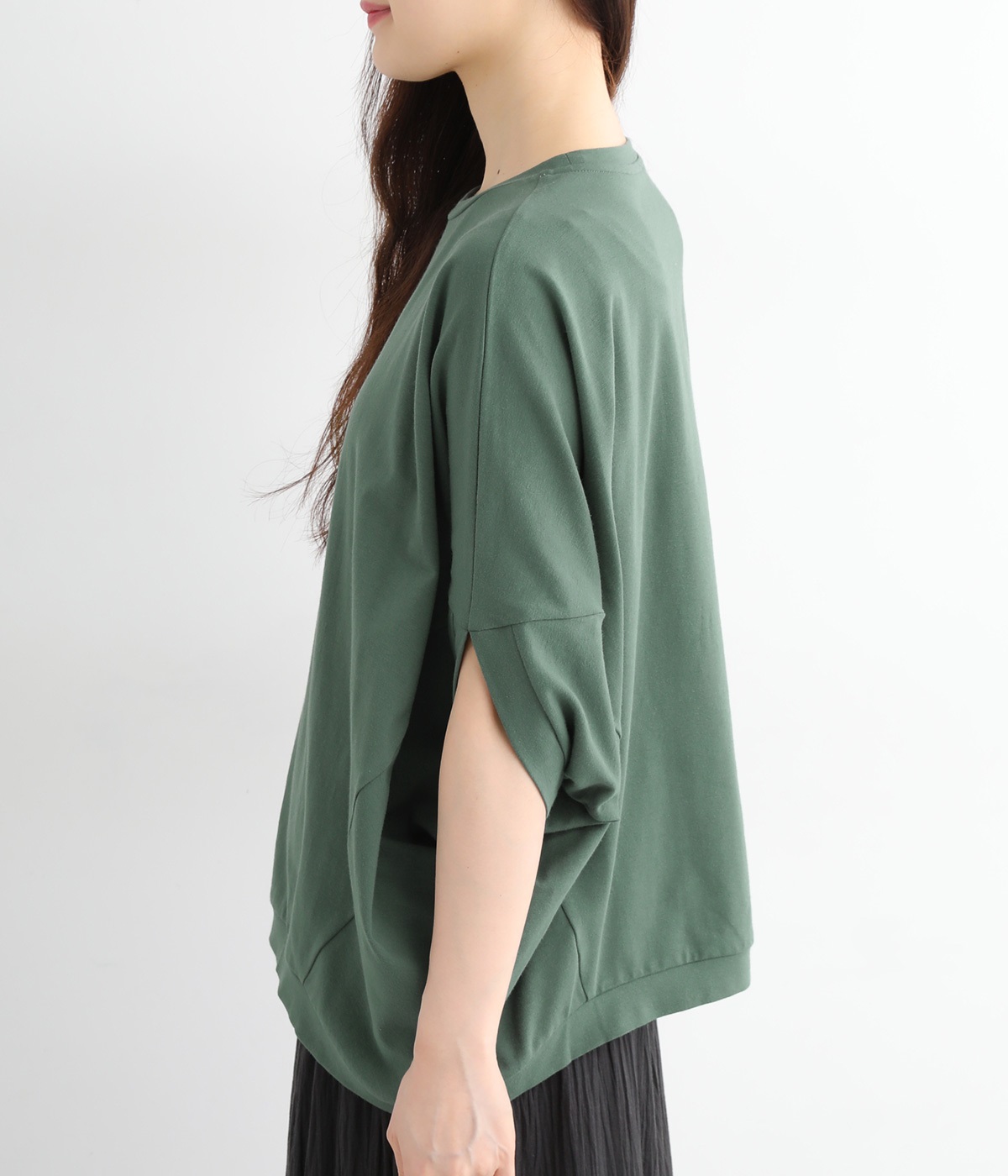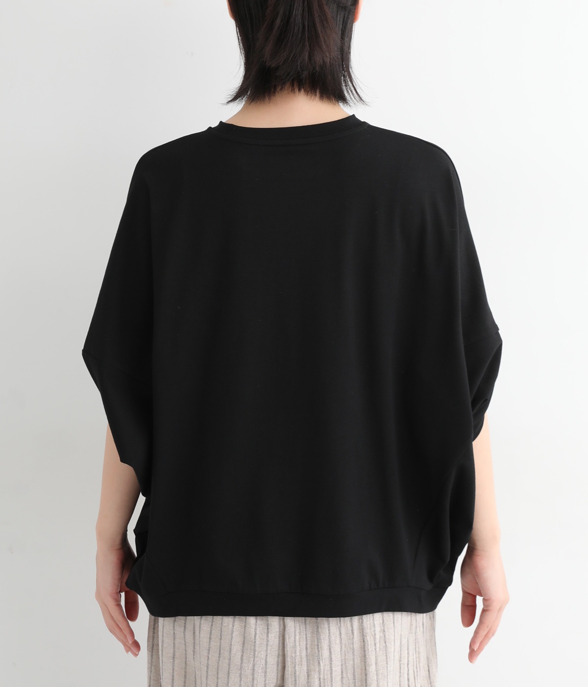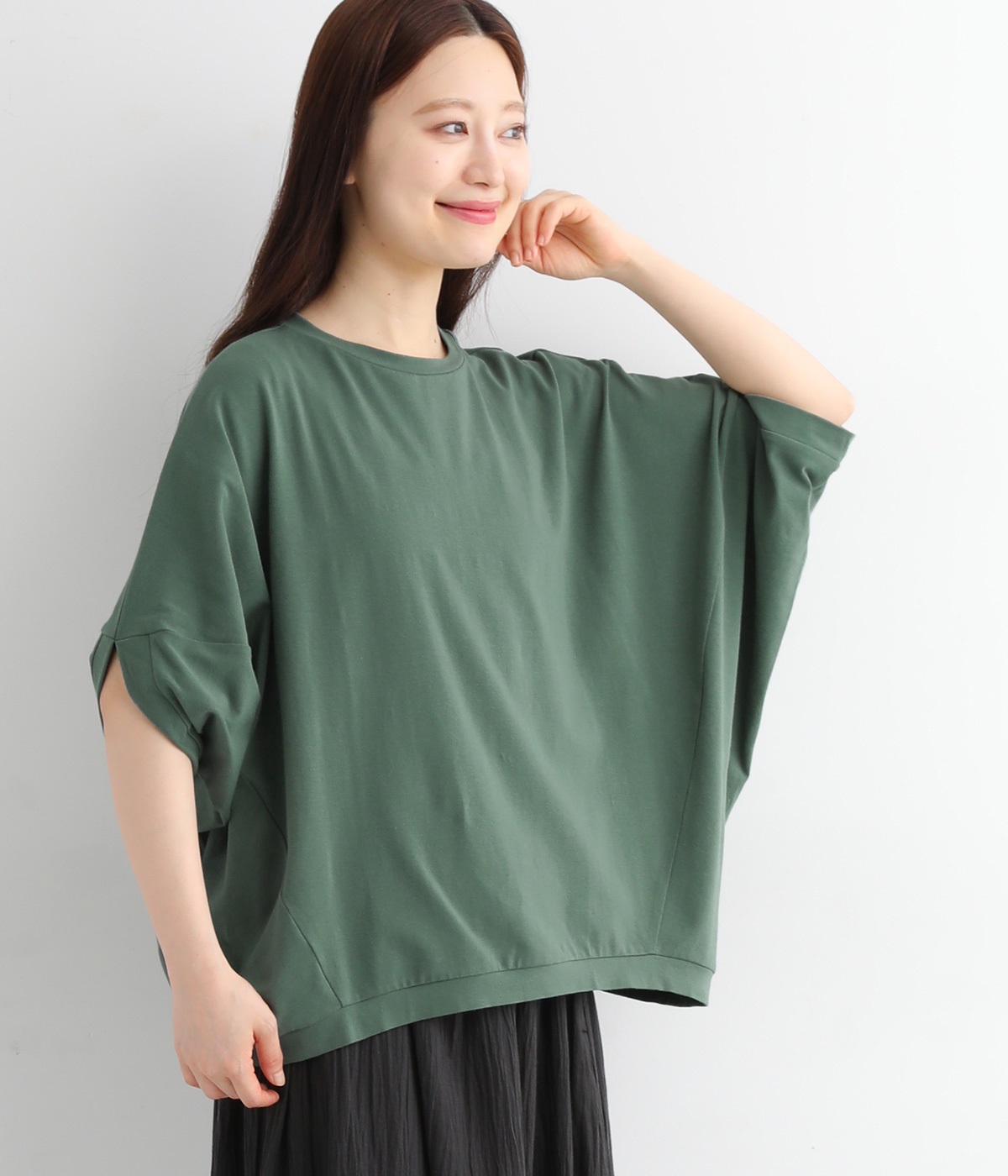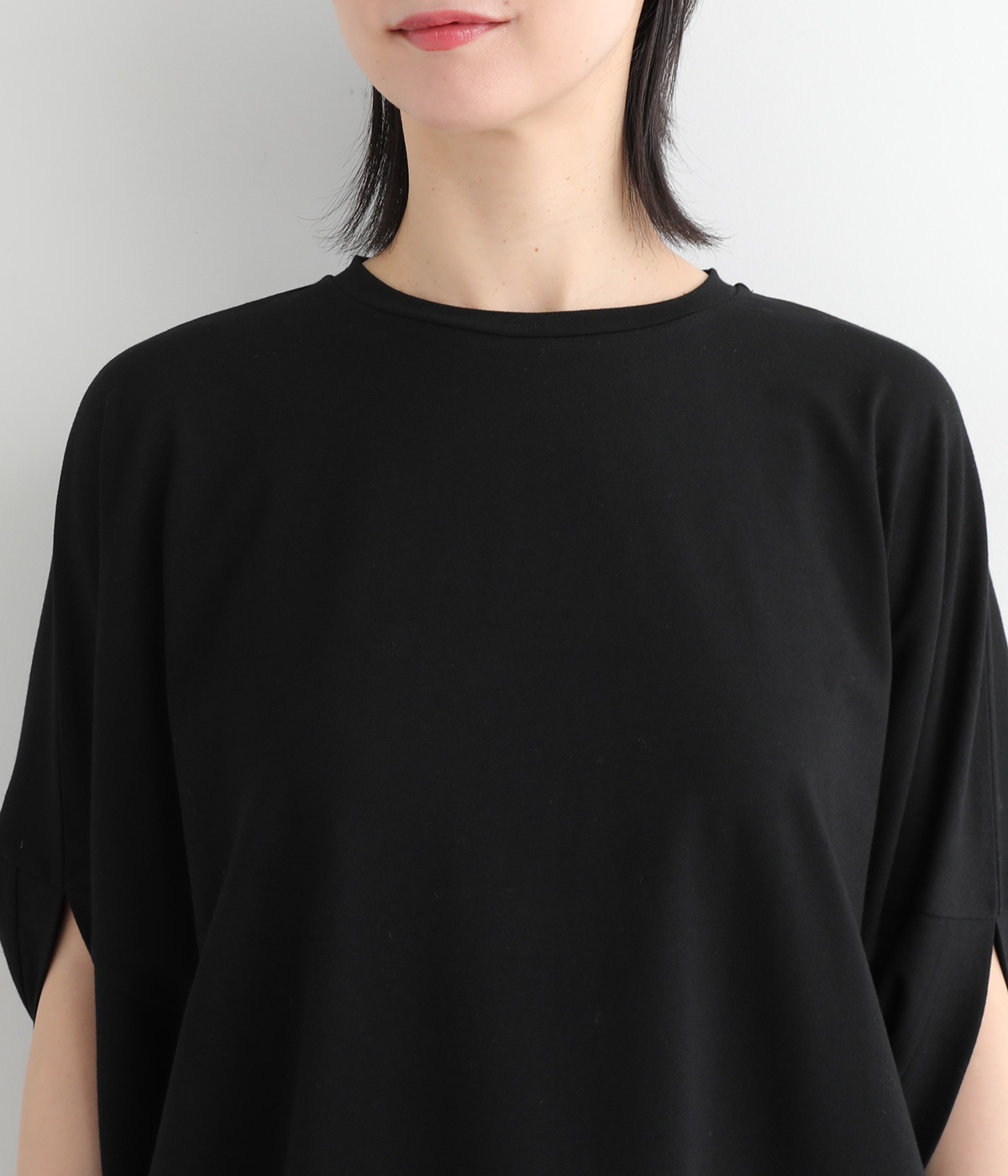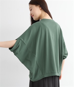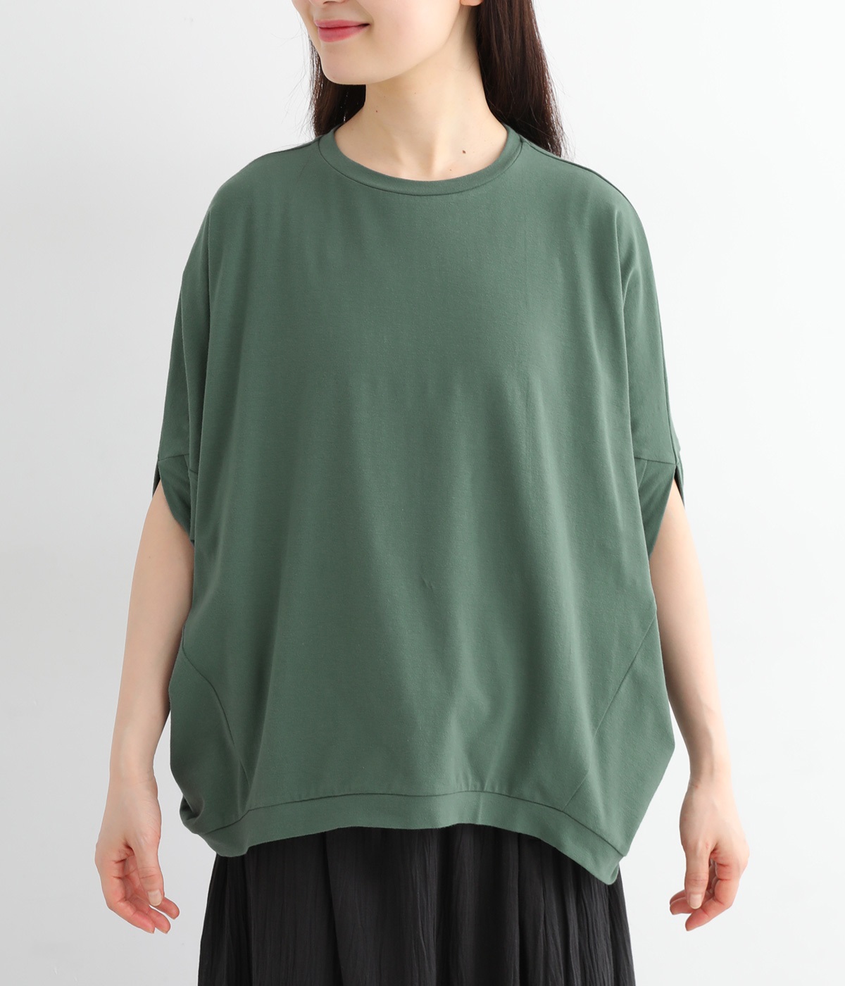 ゆったりとしたシルエットにポンチョスリーブが特徴的なプルオーバーです。着用すると脇下からサイドが自然と垂れるつくりに。カジュアルテイストな素材ながらドレープが生まれて、大人顔なスタイリングがたのしめる一枚です。
