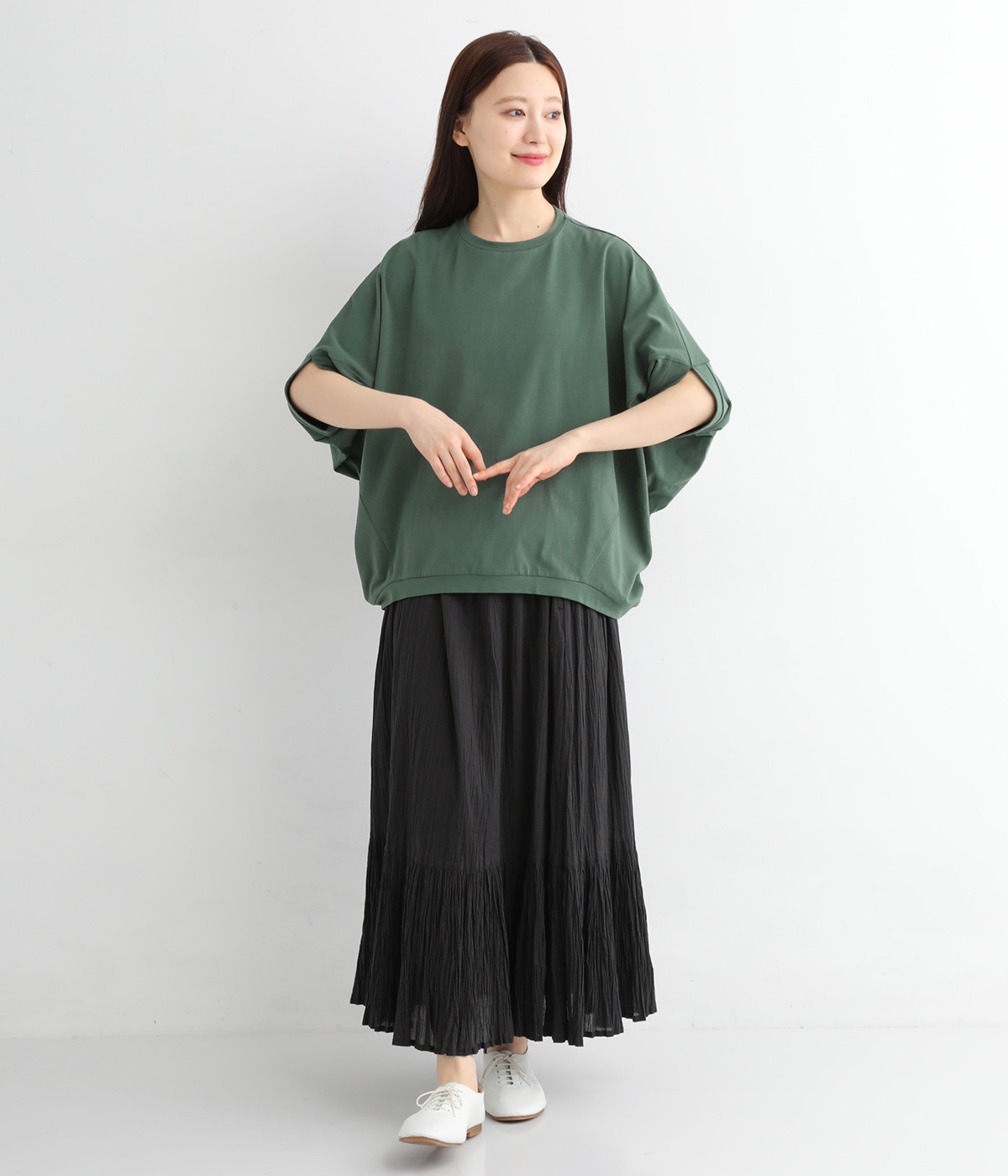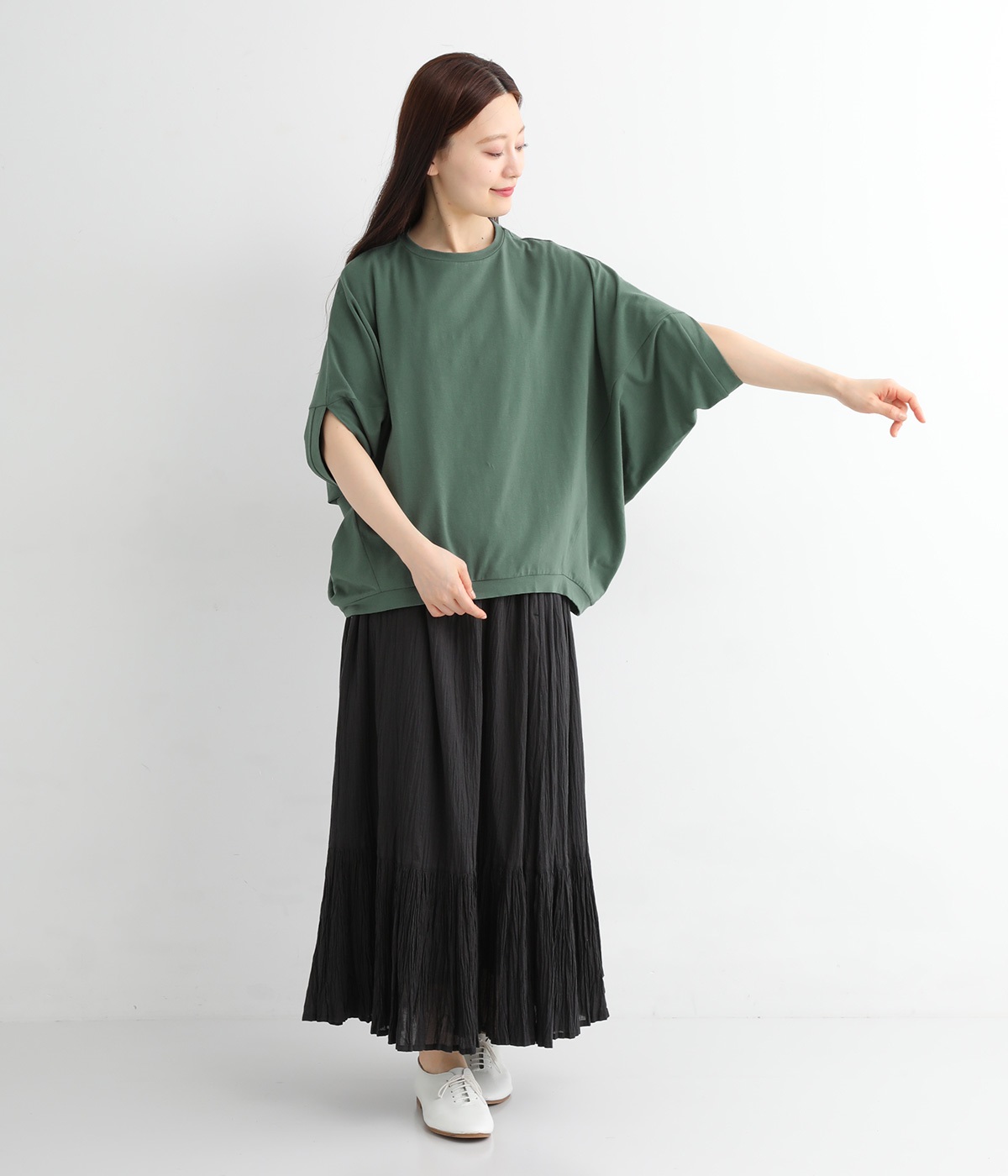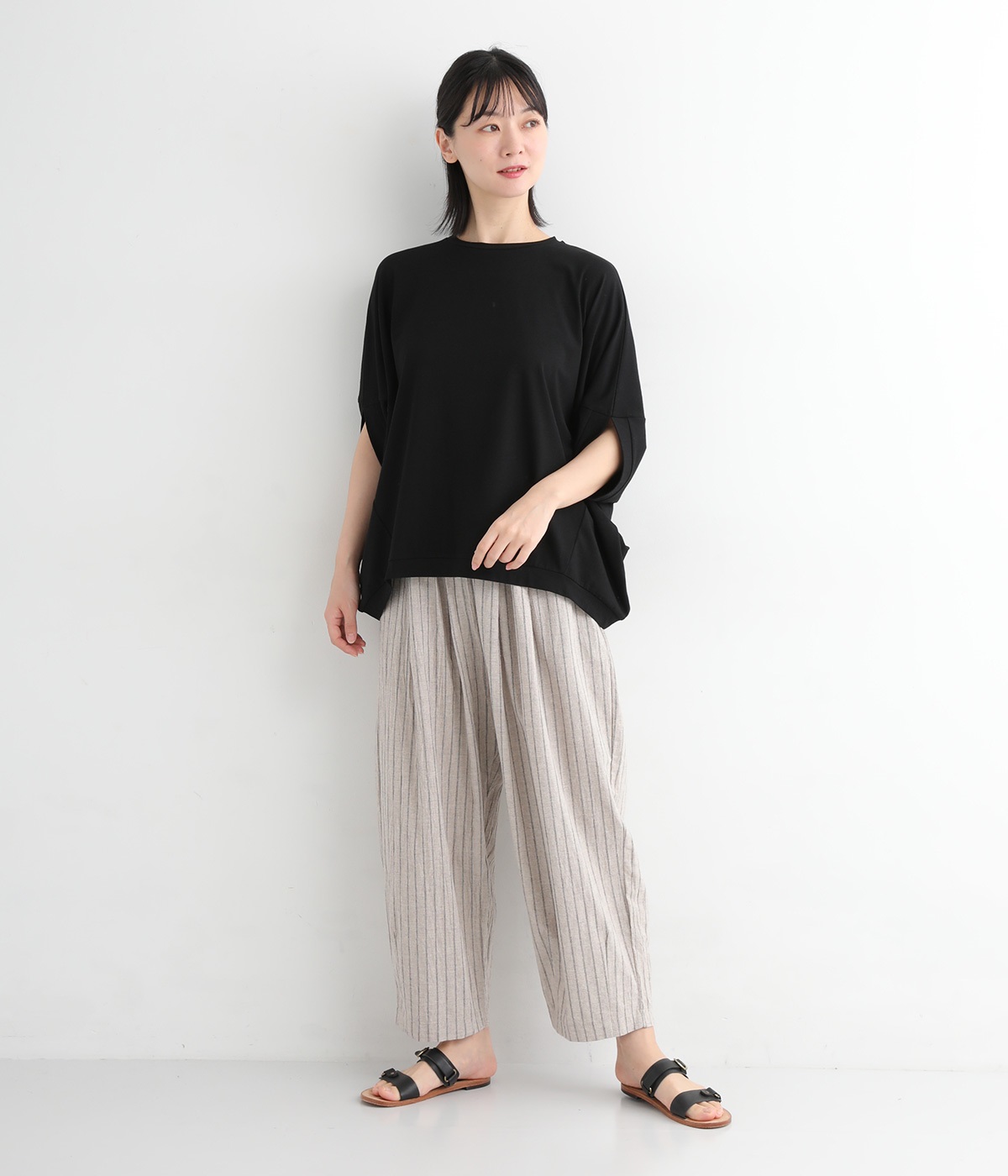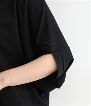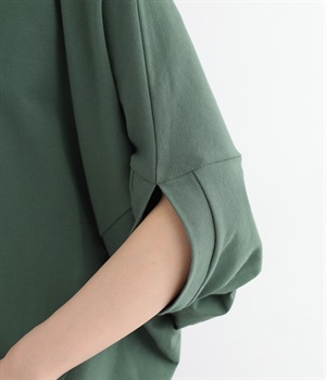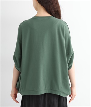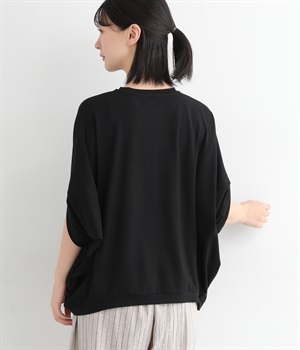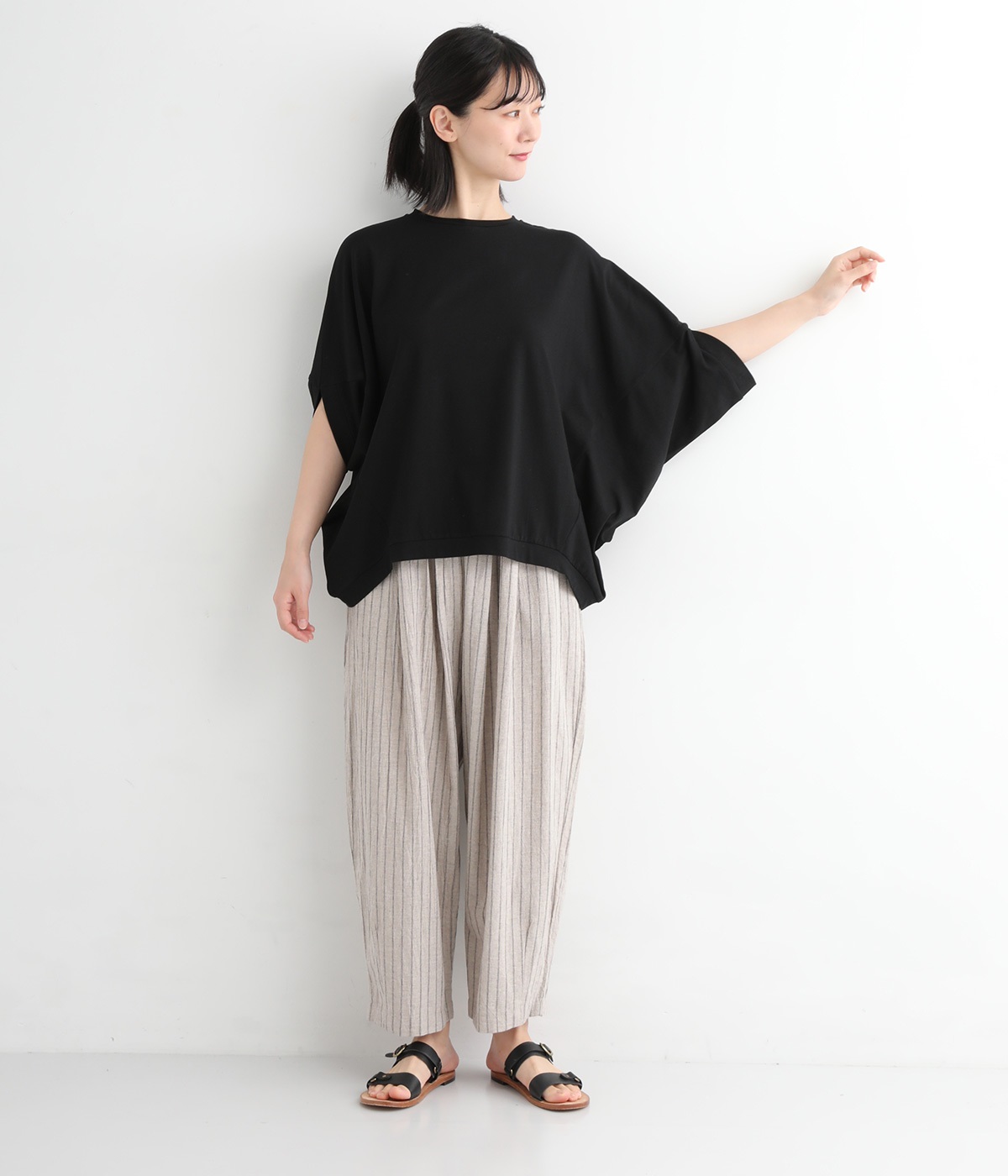 ゆったりとしたシルエットにポンチョスリーブが特徴的なプルオーバーです。着用すると脇下からサイドが自然と垂れるつくりに。カジュアルテイストな素材ながらドレープが生まれて、大人顔なスタイリングがたのしめる一枚です。