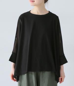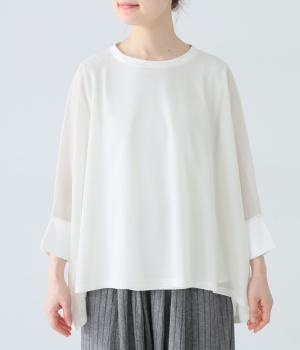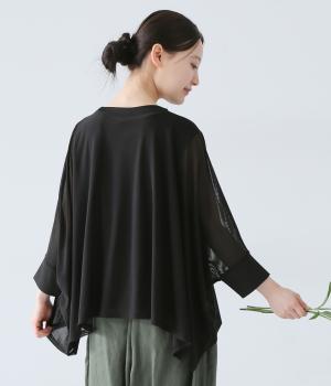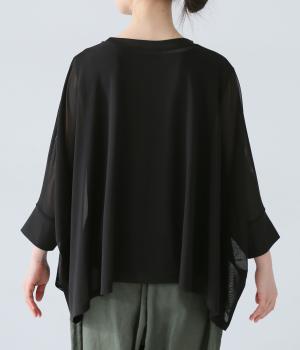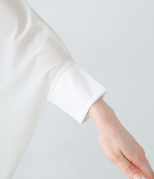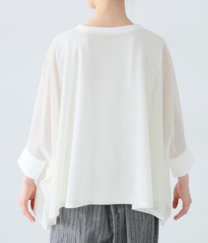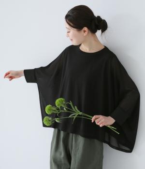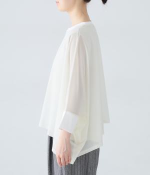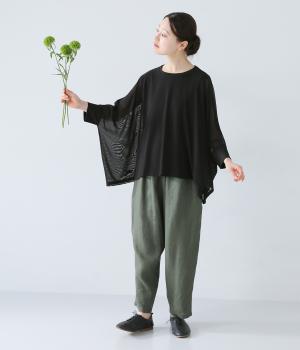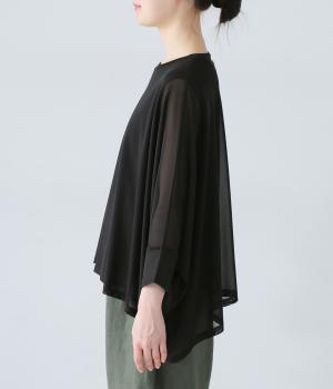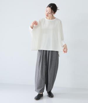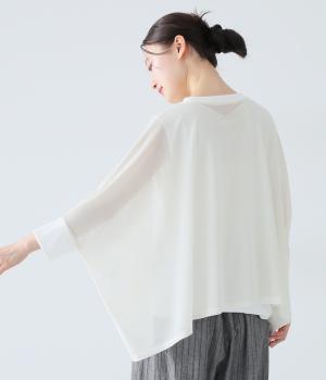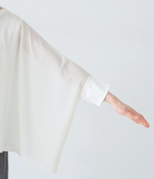 たっぷりととった身幅とドルマンスリーブが特徴的なプルオーバー。生地の落ち感も手伝って美しいドレープがうまれます。腕をおろすと両サイドの丈が長くなるシルエットが素敵。合わせるインナー次第で異なる表情をたのしめます。