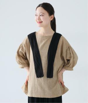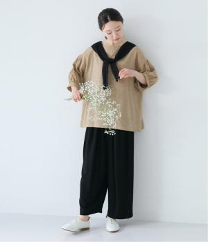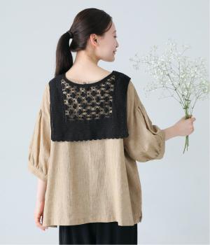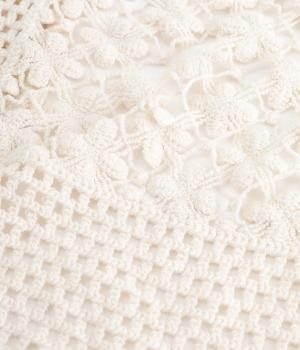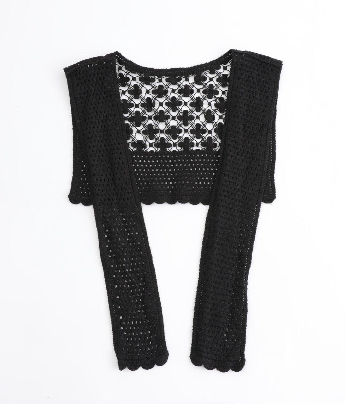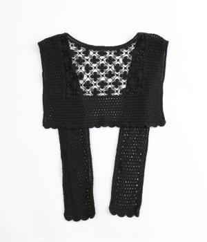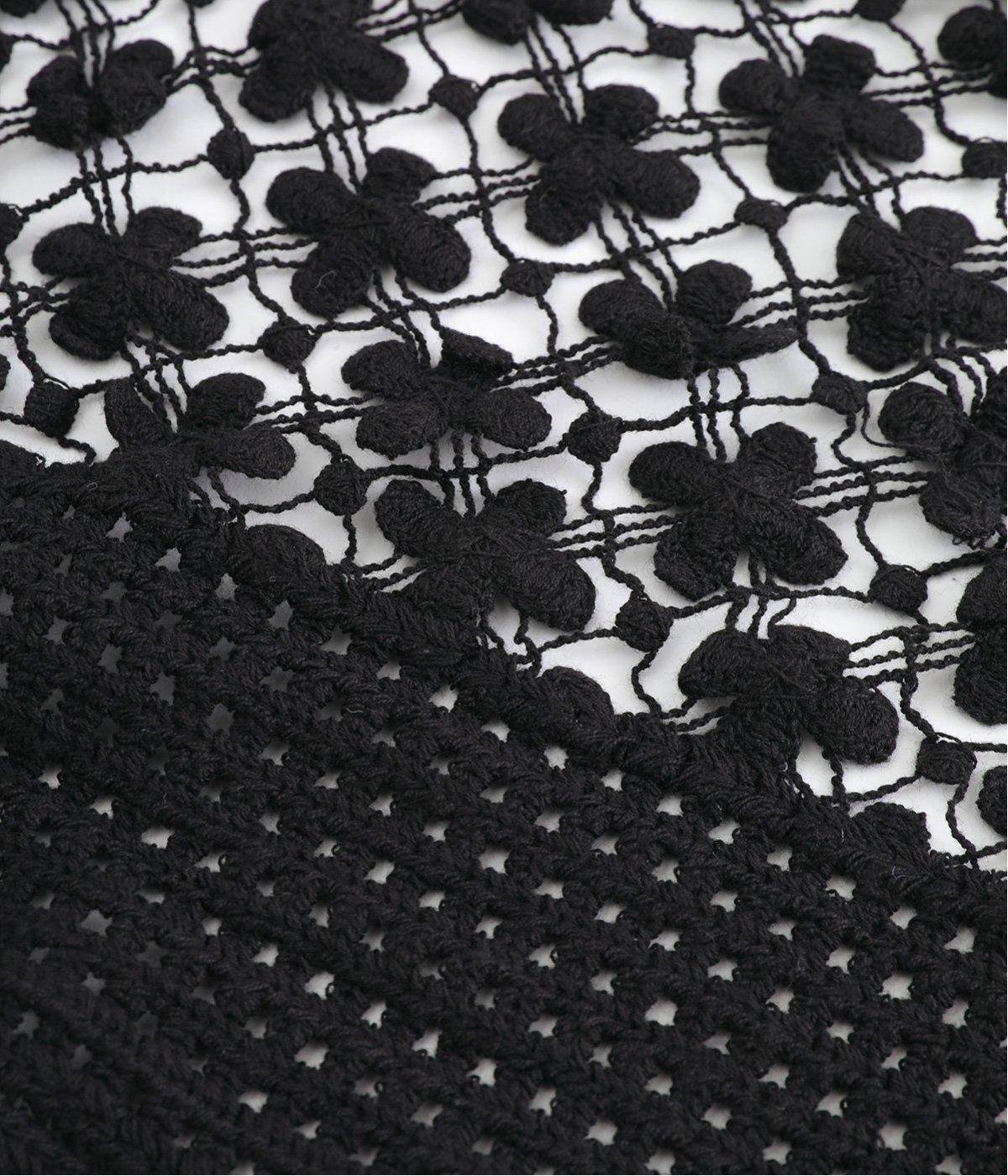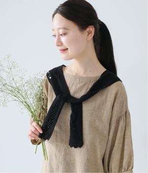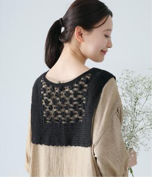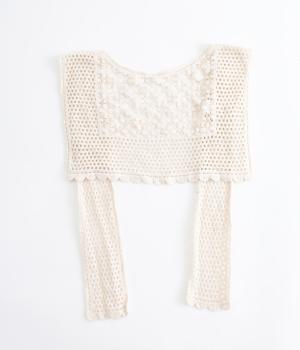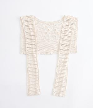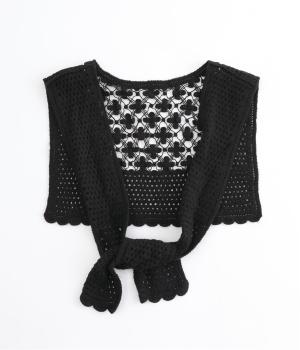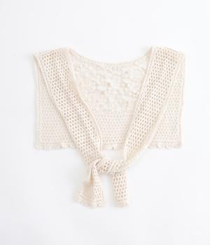 プルオーバーやワンピースにさっとプラスするだけでおしゃれなアクセントになるニットショール。お花の編み模様のかわいいセーラーカラーのような後ろ姿が華やかです。ニットトップスを肩にかけるよりももたつかず、軽やかな透け感をたのしめるのがグッド。