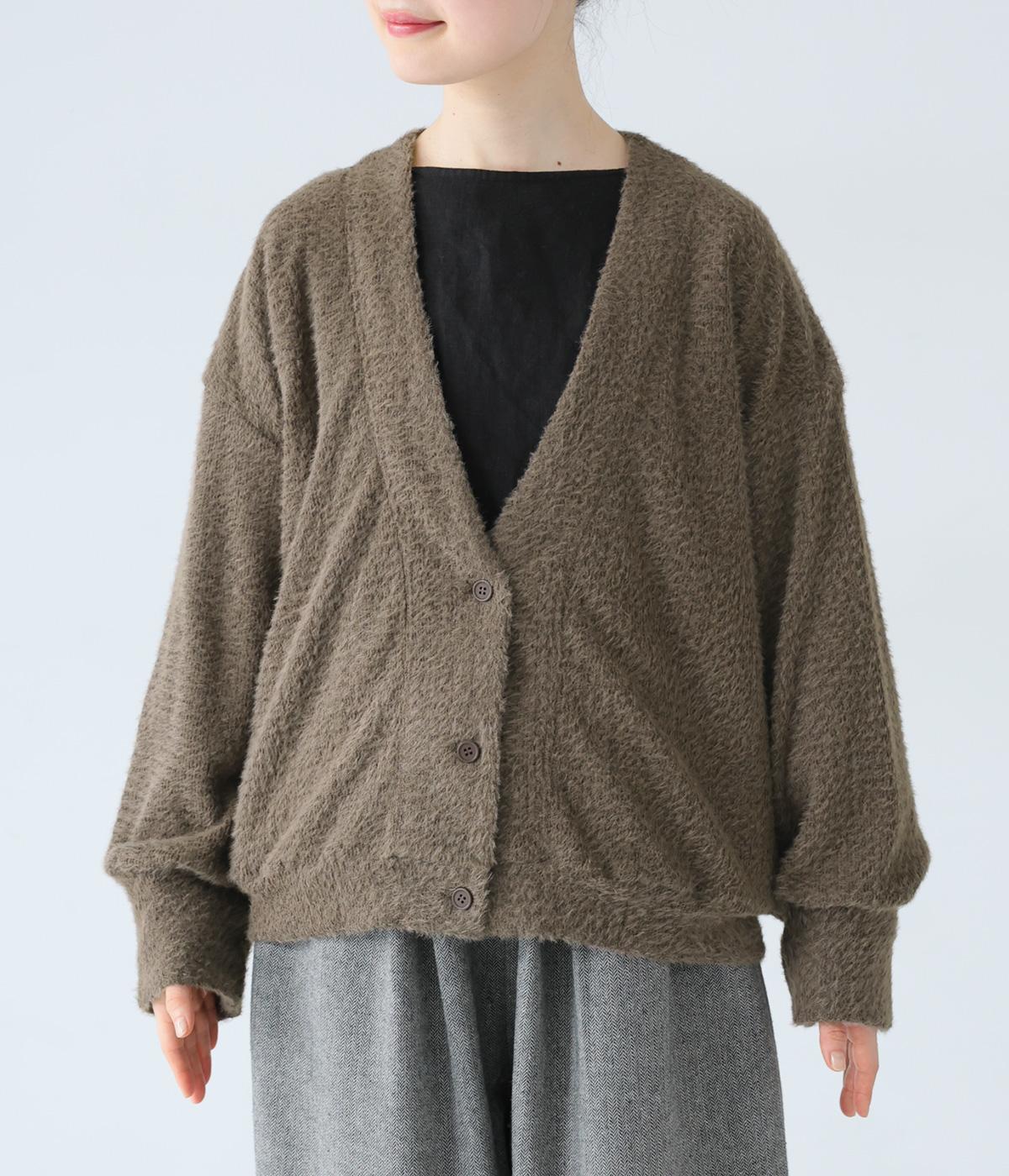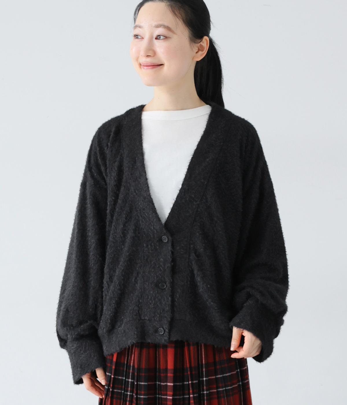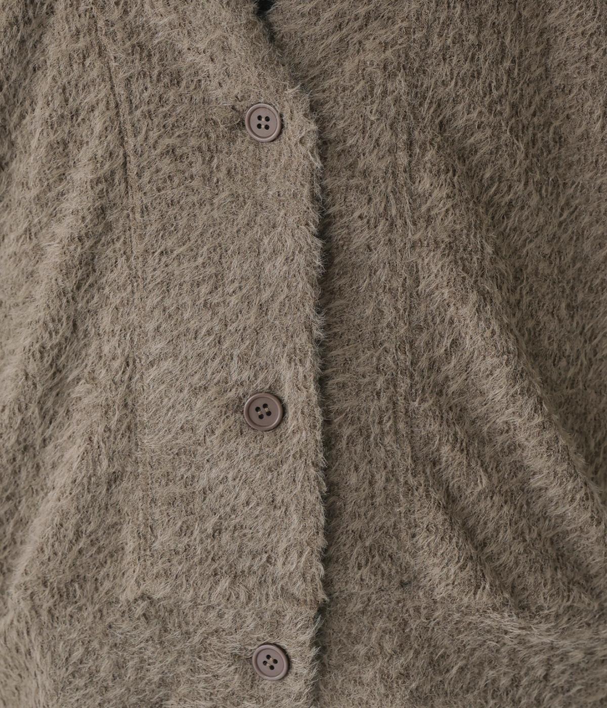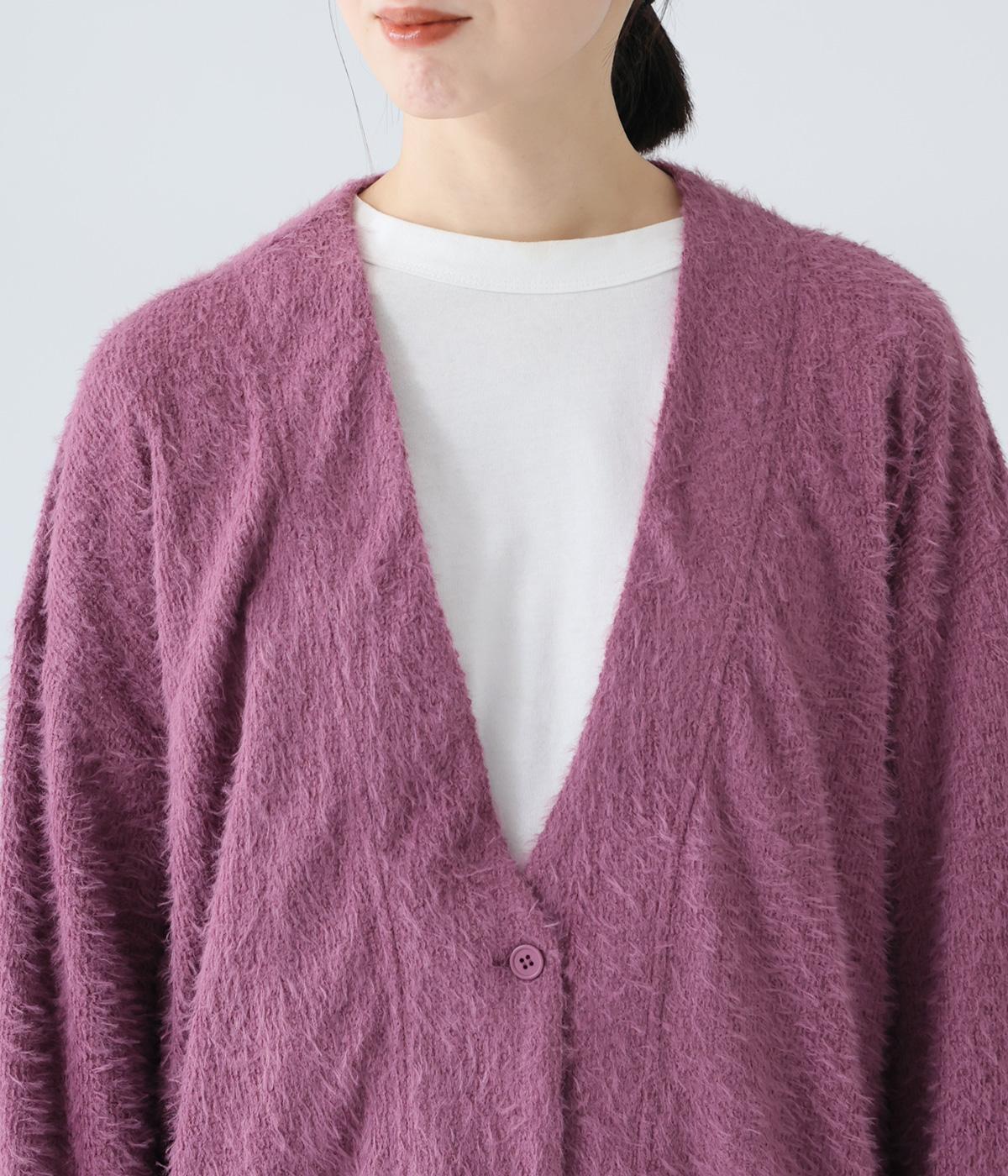 シンプルなデザインながらも、長い毛足が装いに華やかさを添えるシャギー素材のカーディガン。ふんわりと丸みを帯びた愛らしいシルエットに仕上げました。深く開いたVネックが顔まわりをすっきりと印象づけ。合わせるインナー次第で異なる表情をたのしめます。