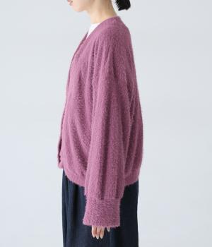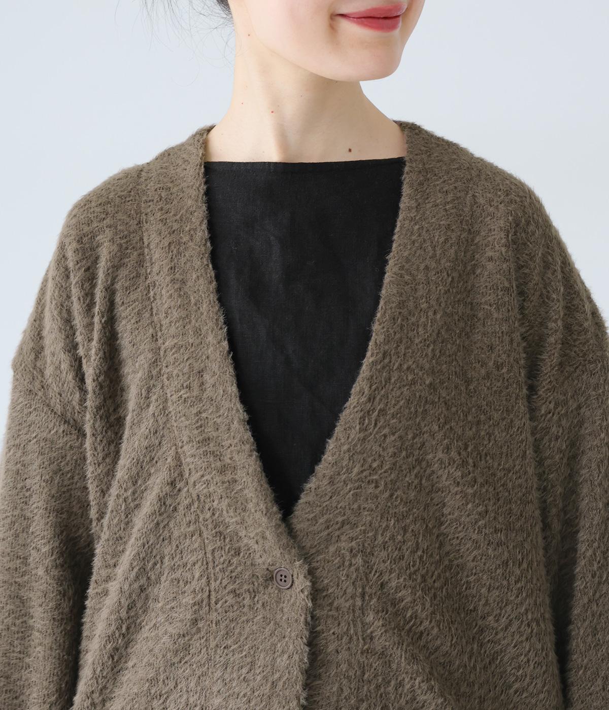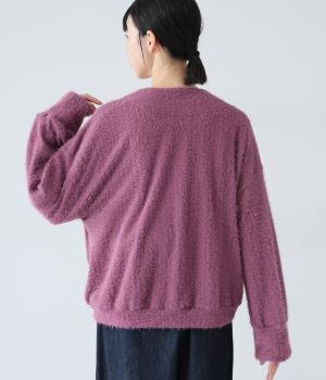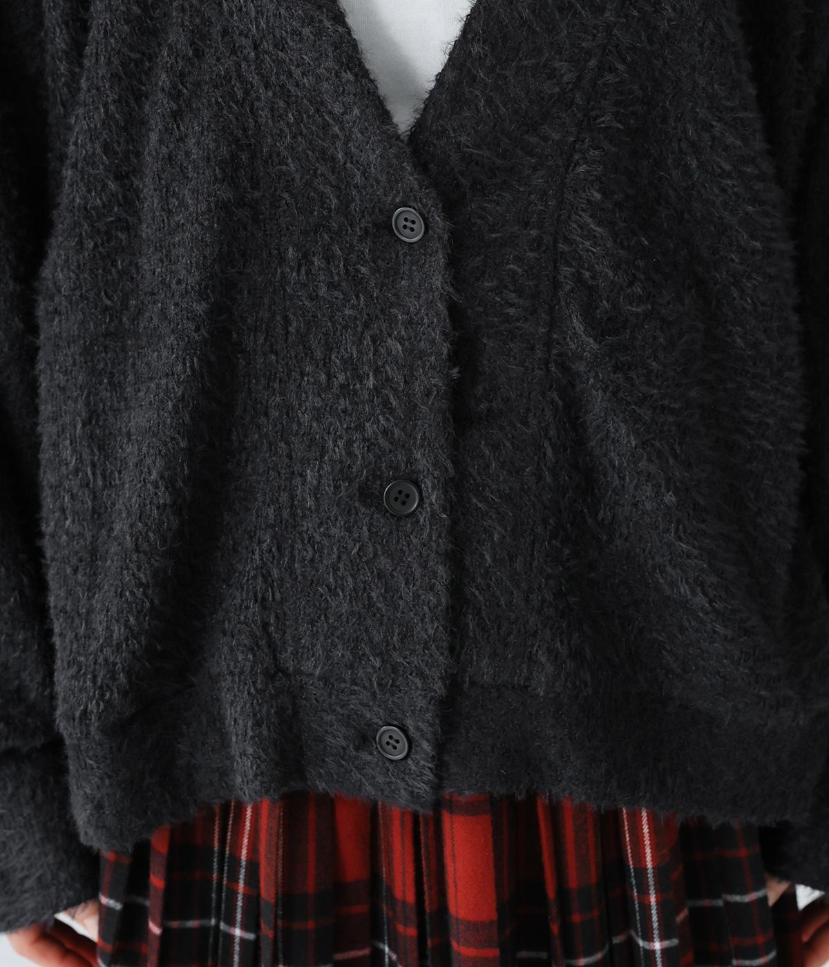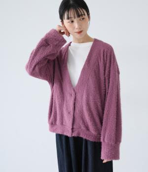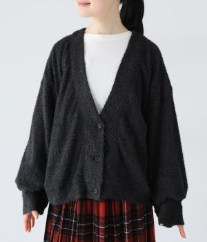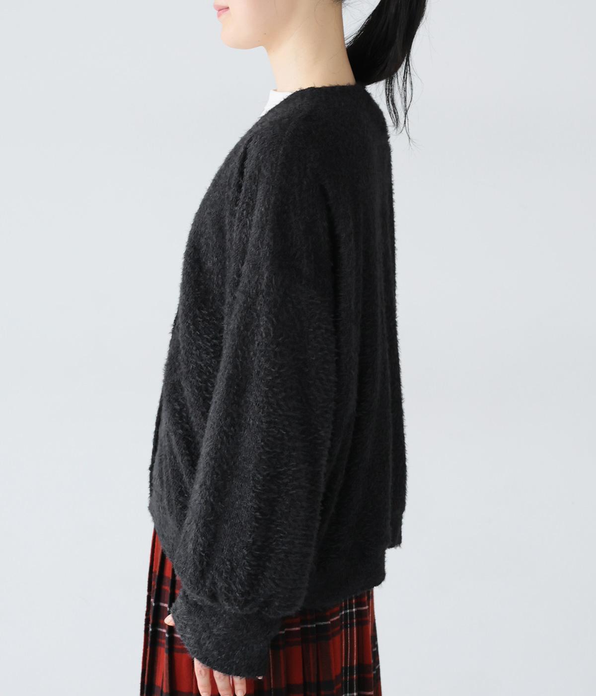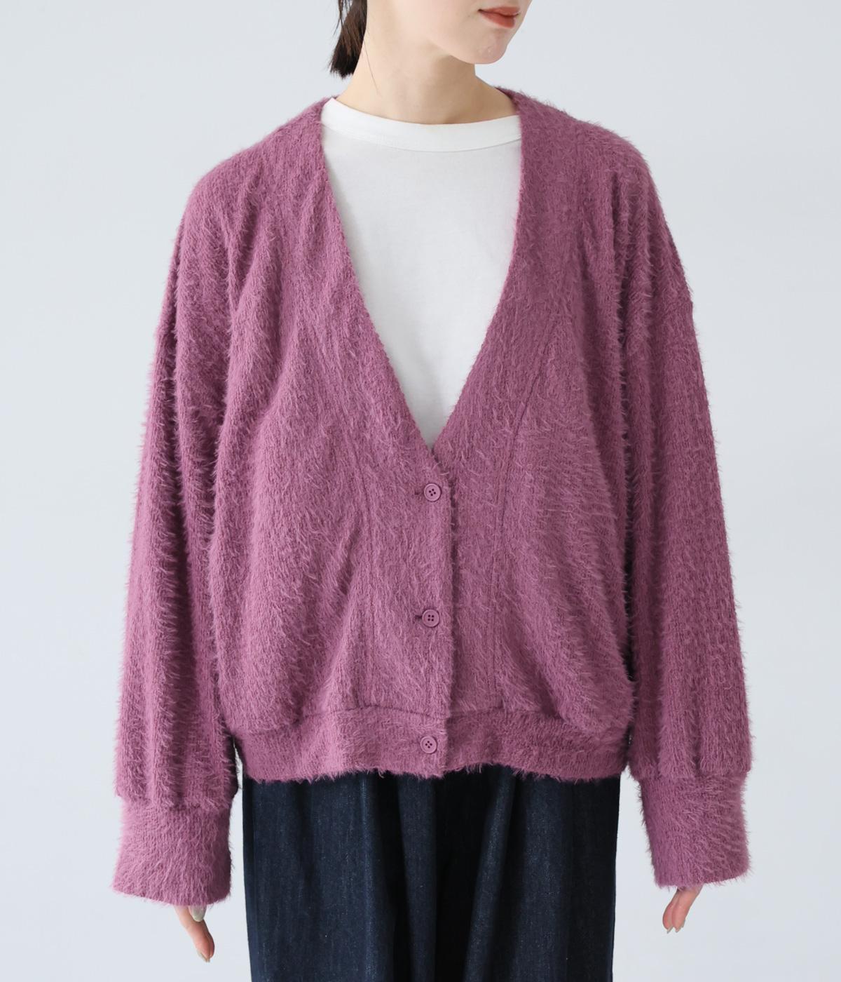 シンプルなデザインながらも、長い毛足が装いに華やかさを添えるシャギー素材のカーディガン。ふんわりと丸みを帯びた愛らしいシルエットに仕上げました。深く開いたVネックが顔まわりをすっきりと印象づけ。合わせるインナー次第で異なる表情をたのしめます。