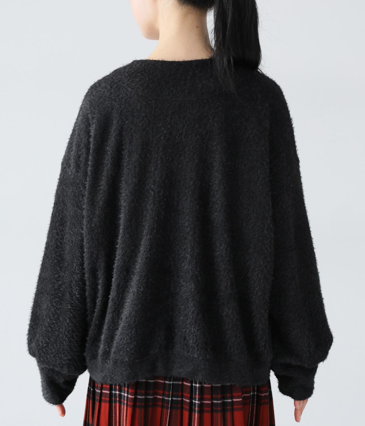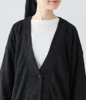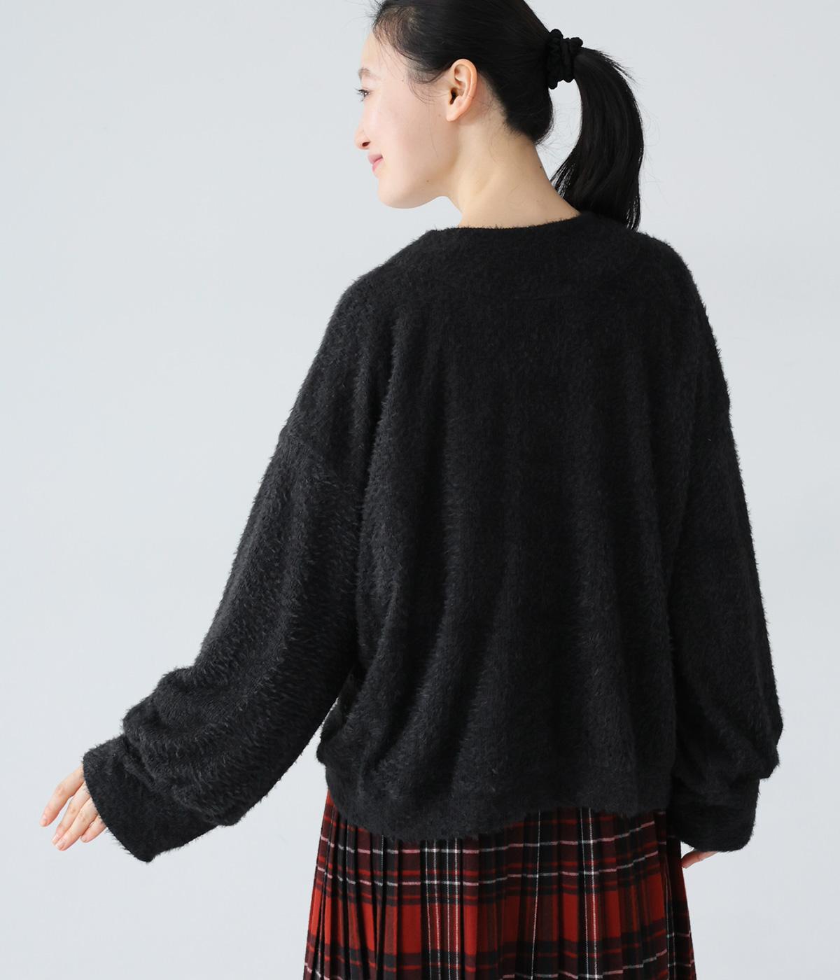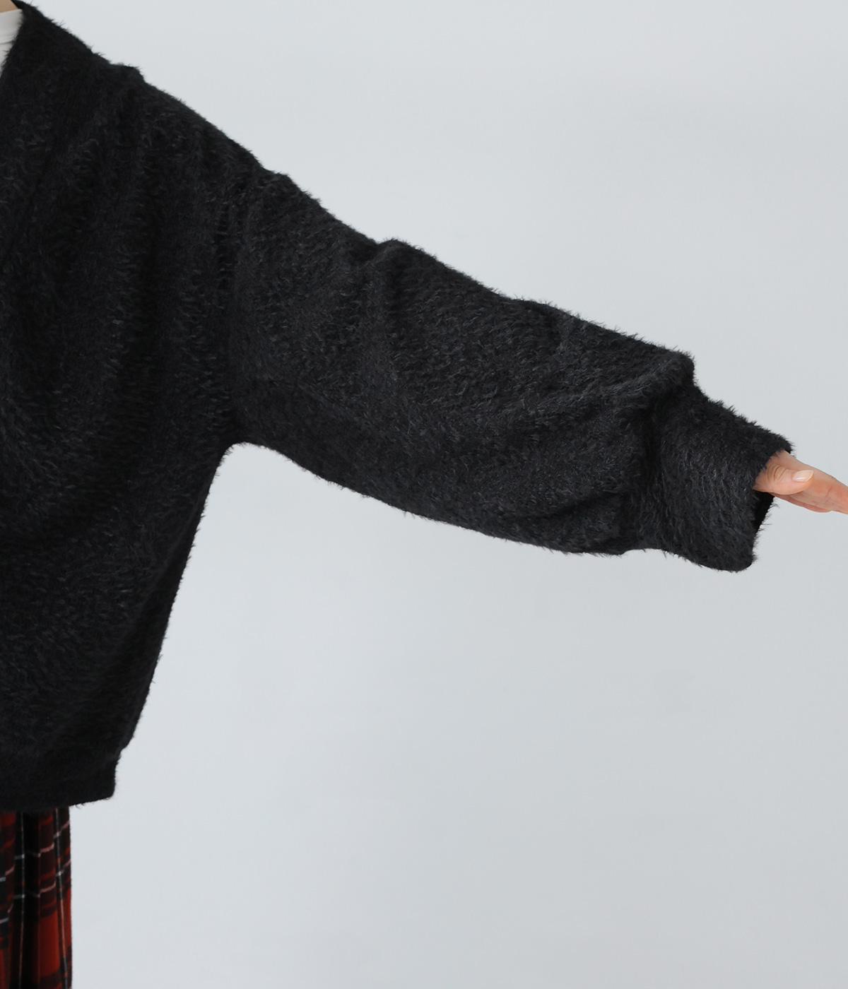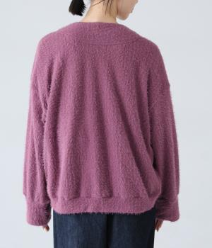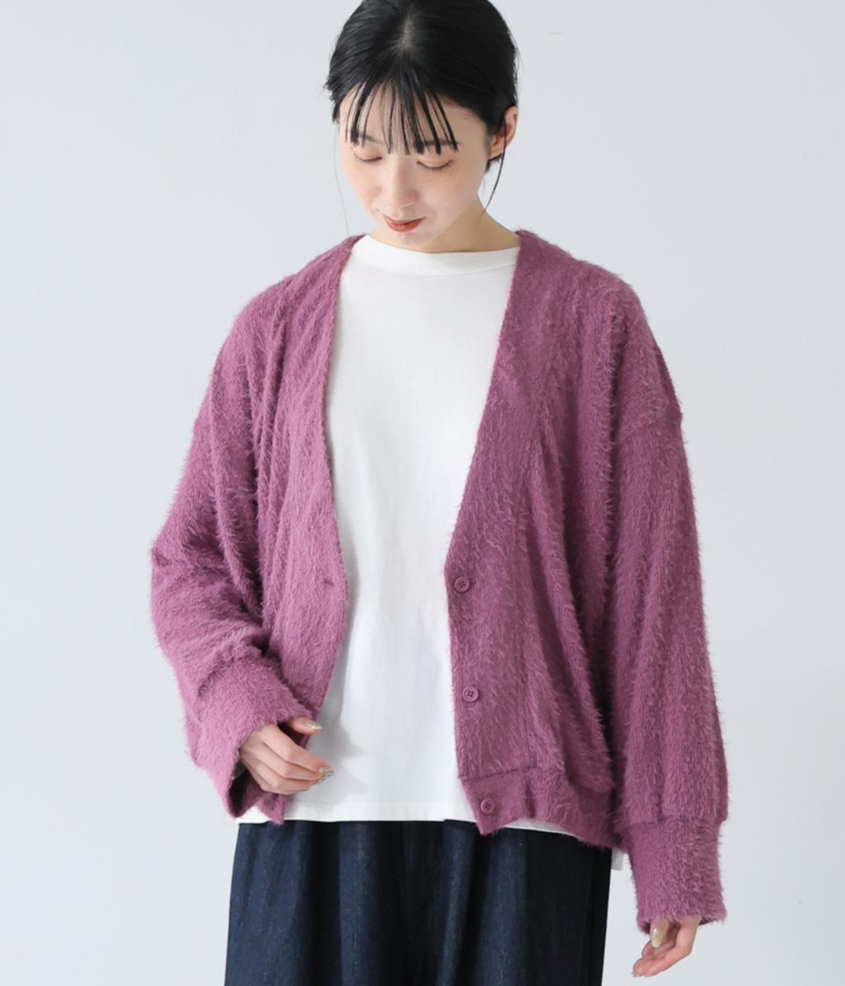 シンプルなデザインながらも、長い毛足が装いに華やかさを添えるシャギー素材のカーディガン。ふんわりと丸みを帯びた愛らしいシルエットに仕上げました。深く開いたVネックが顔まわりをすっきりと印象づけ。合わせるインナー次第で異なる表情をたのしめます。