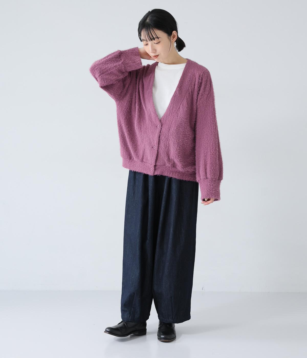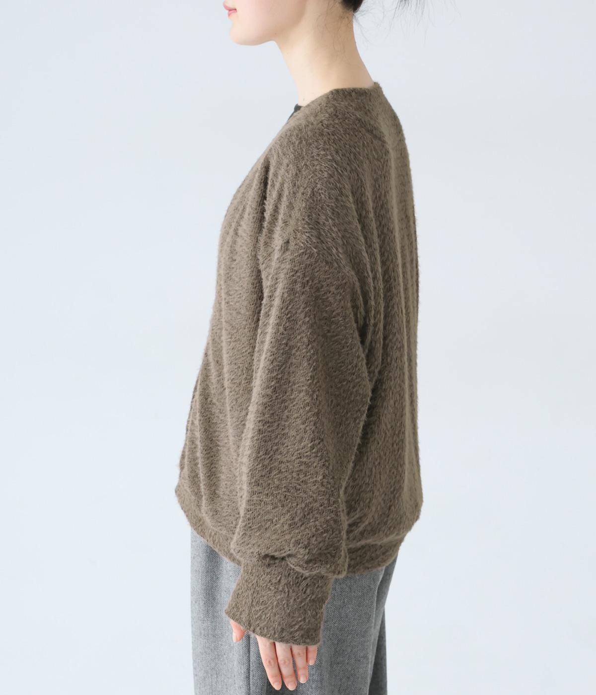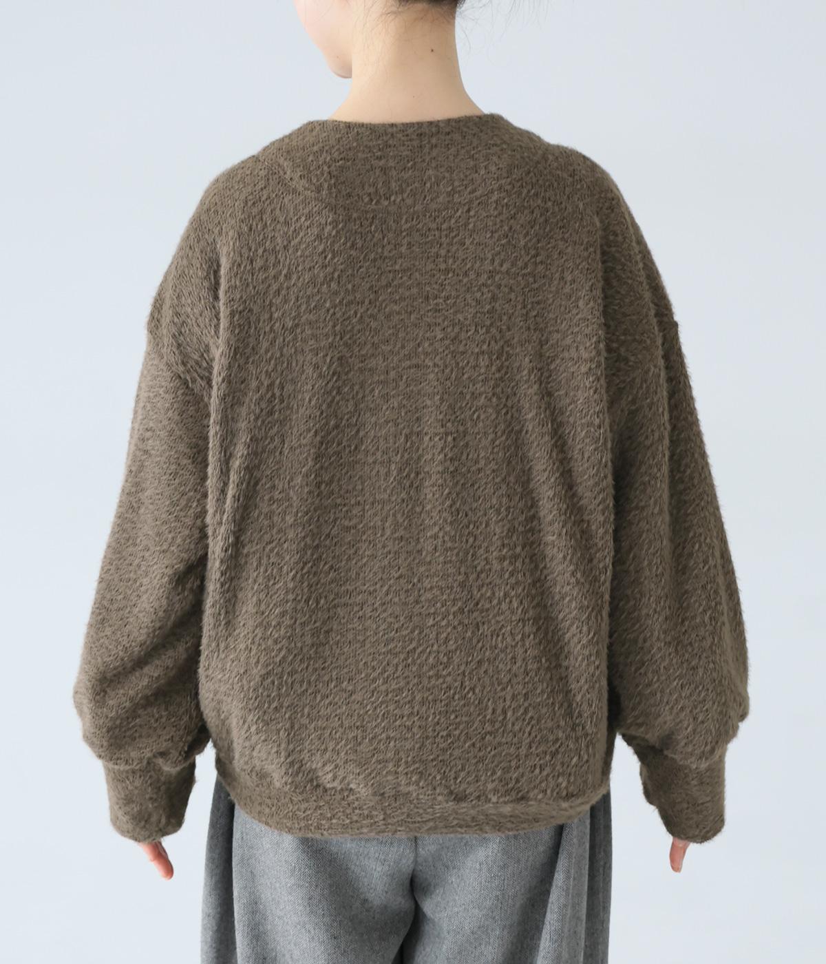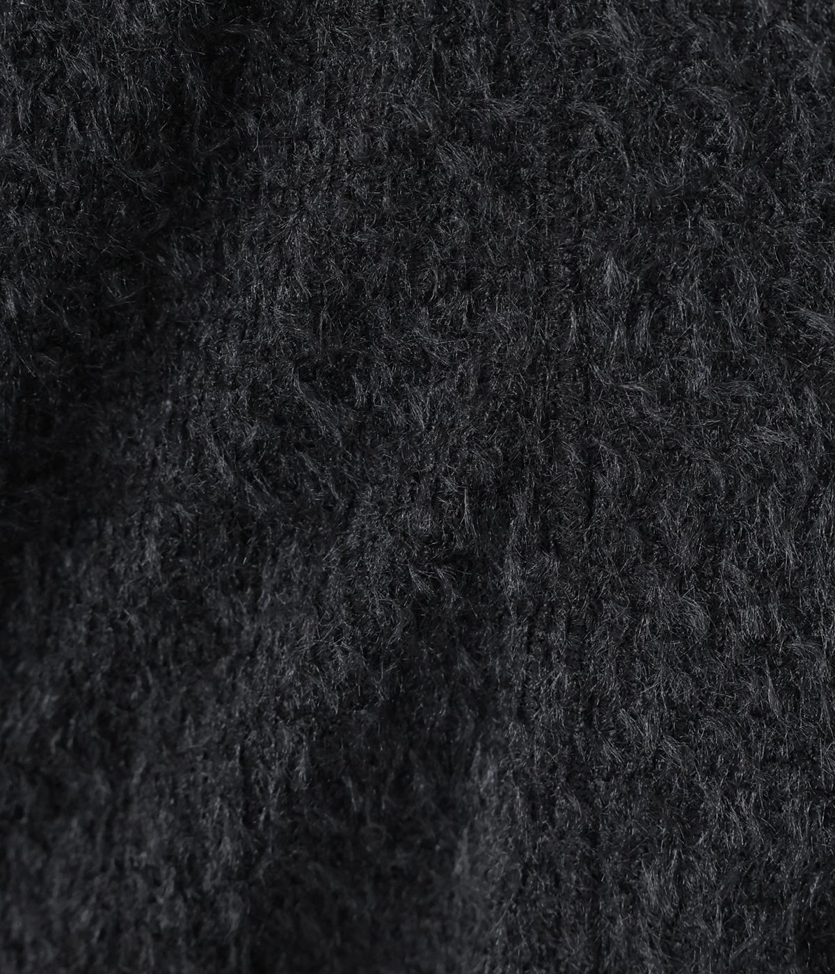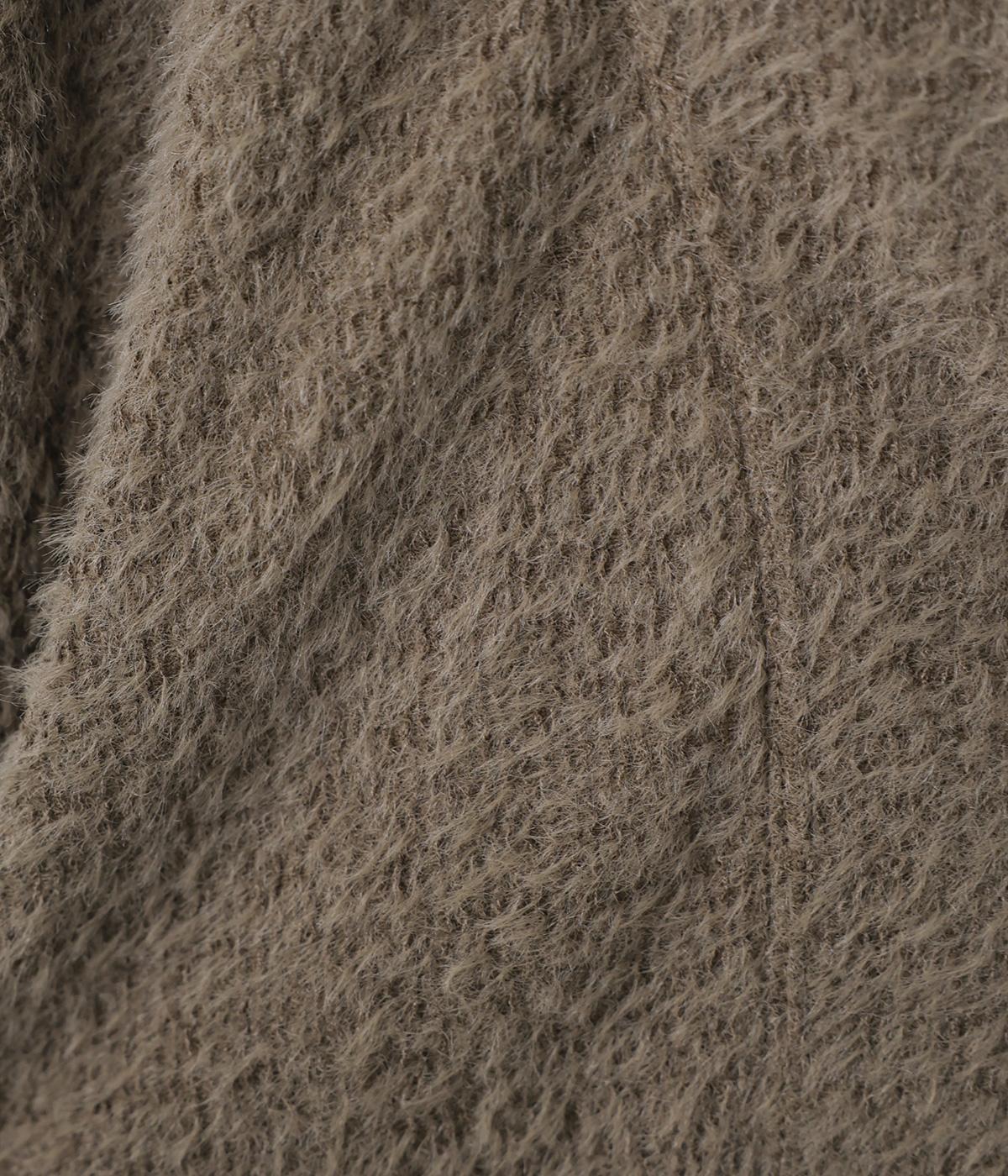 シンプルなデザインながらも、長い毛足が装いに華やかさを添えるシャギー素材のカーディガン。ふんわりと丸みを帯びた愛らしいシルエットに仕上げました。深く開いたVネックが顔まわりをすっきりと印象づけ。合わせるインナー次第で異なる表情をたのしめます。