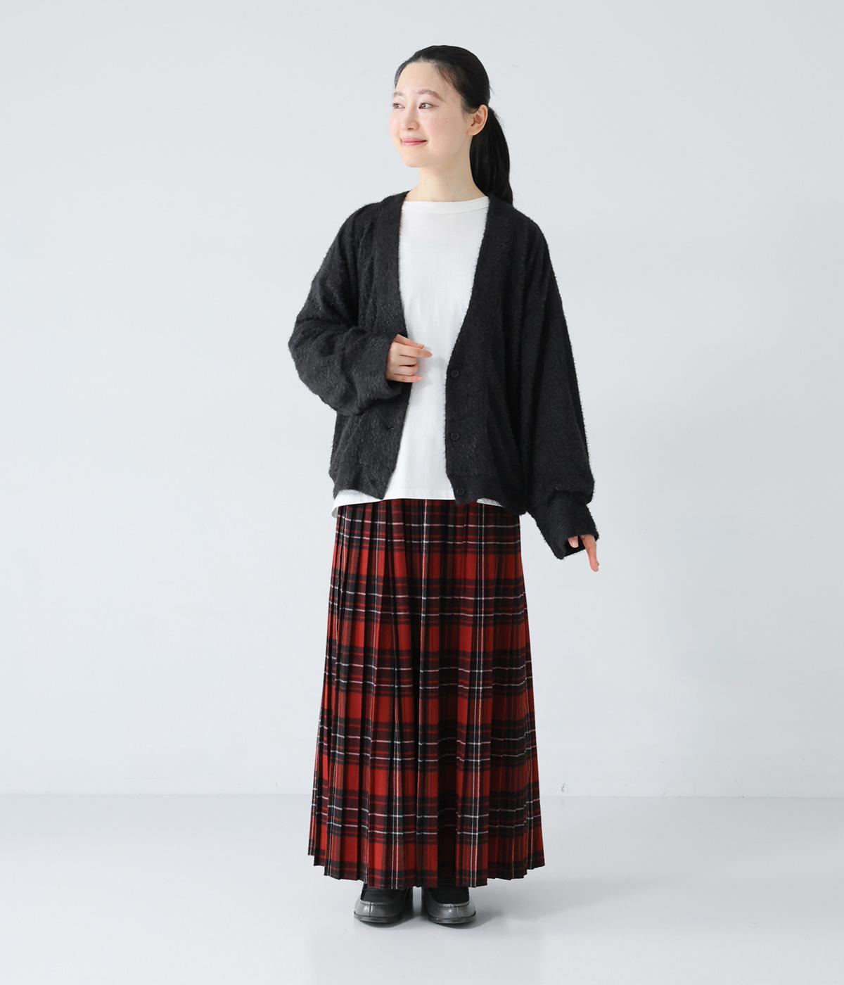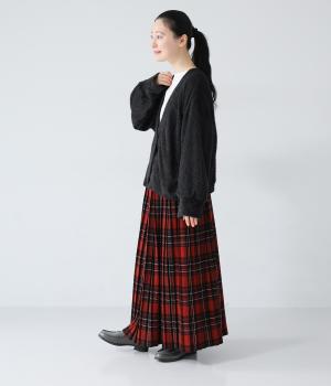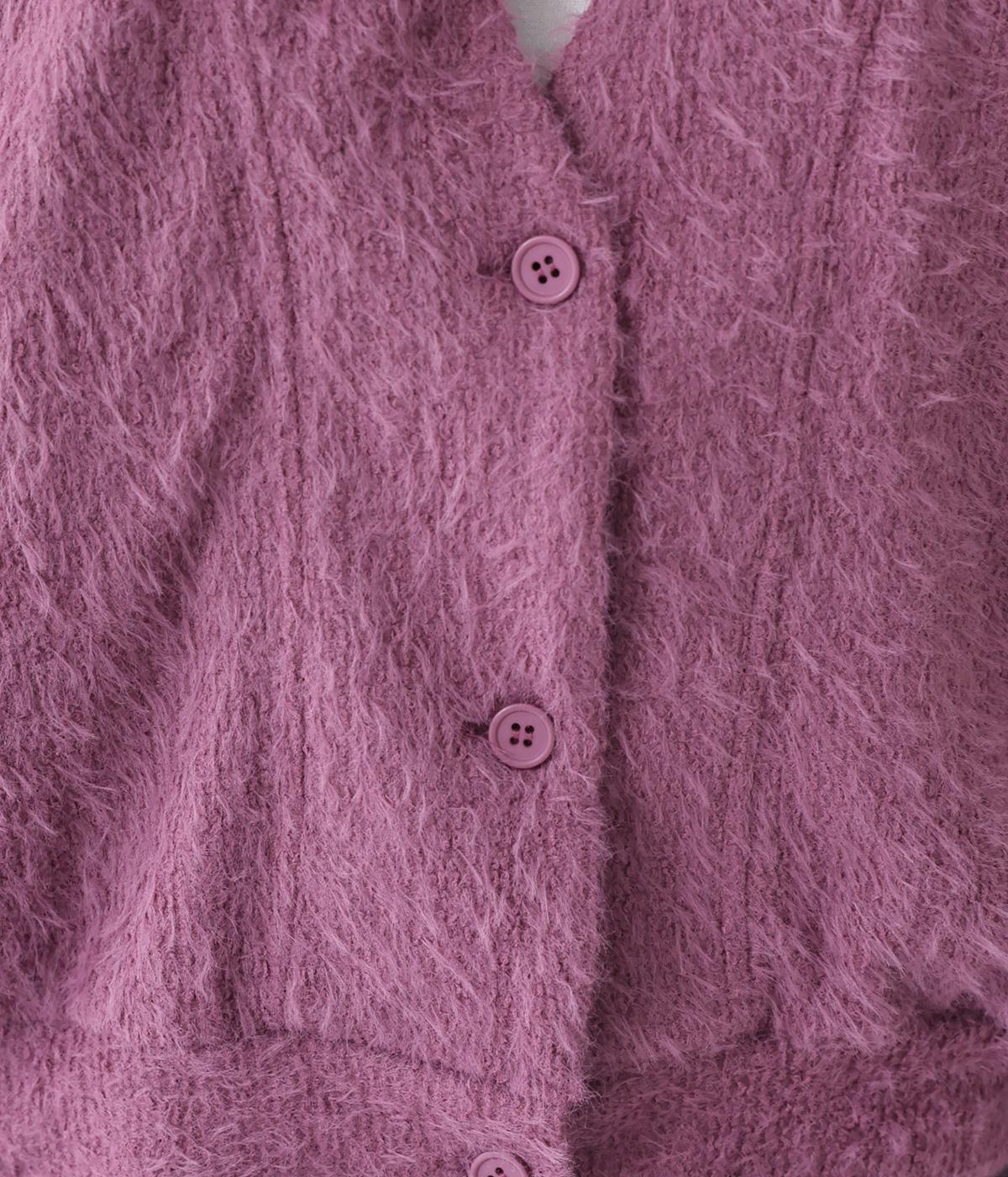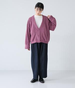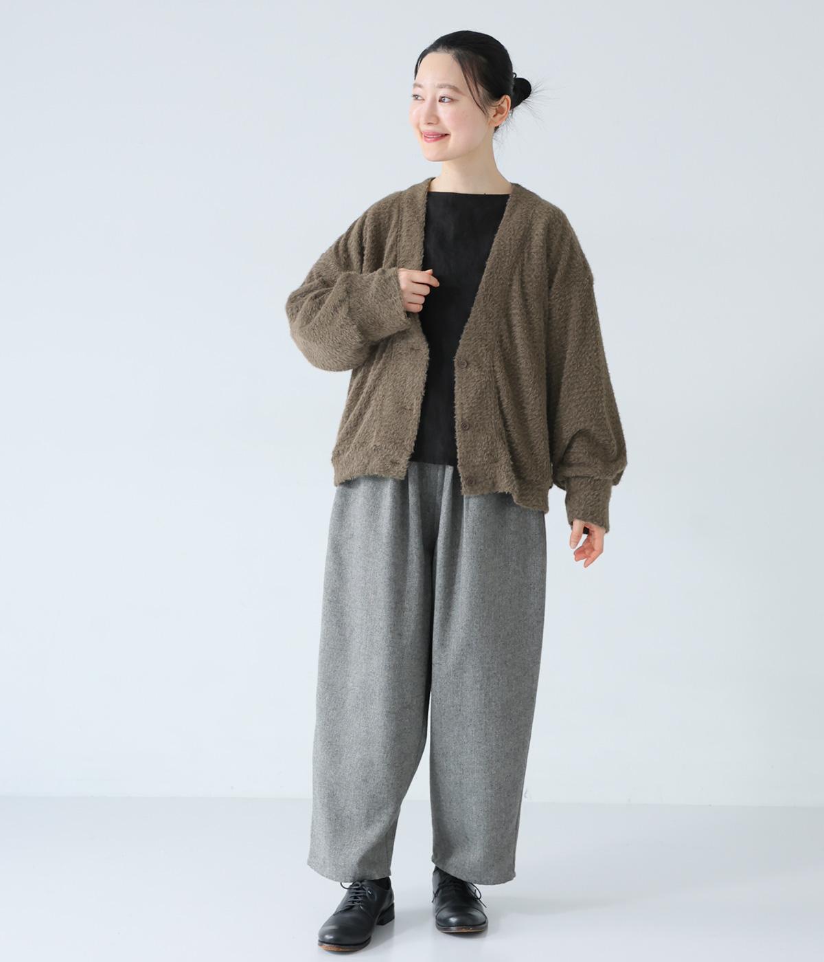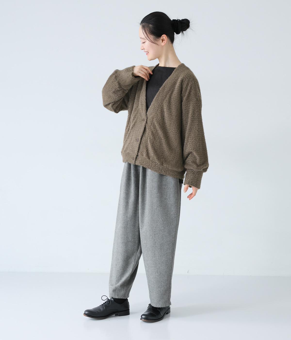 シンプルなデザインながらも、長い毛足が装いに華やかさを添えるシャギー素材のカーディガン。ふんわりと丸みを帯びた愛らしいシルエットに仕上げました。深く開いたVネックが顔まわりをすっきりと印象づけ。合わせるインナー次第で異なる表情をたのしめます。