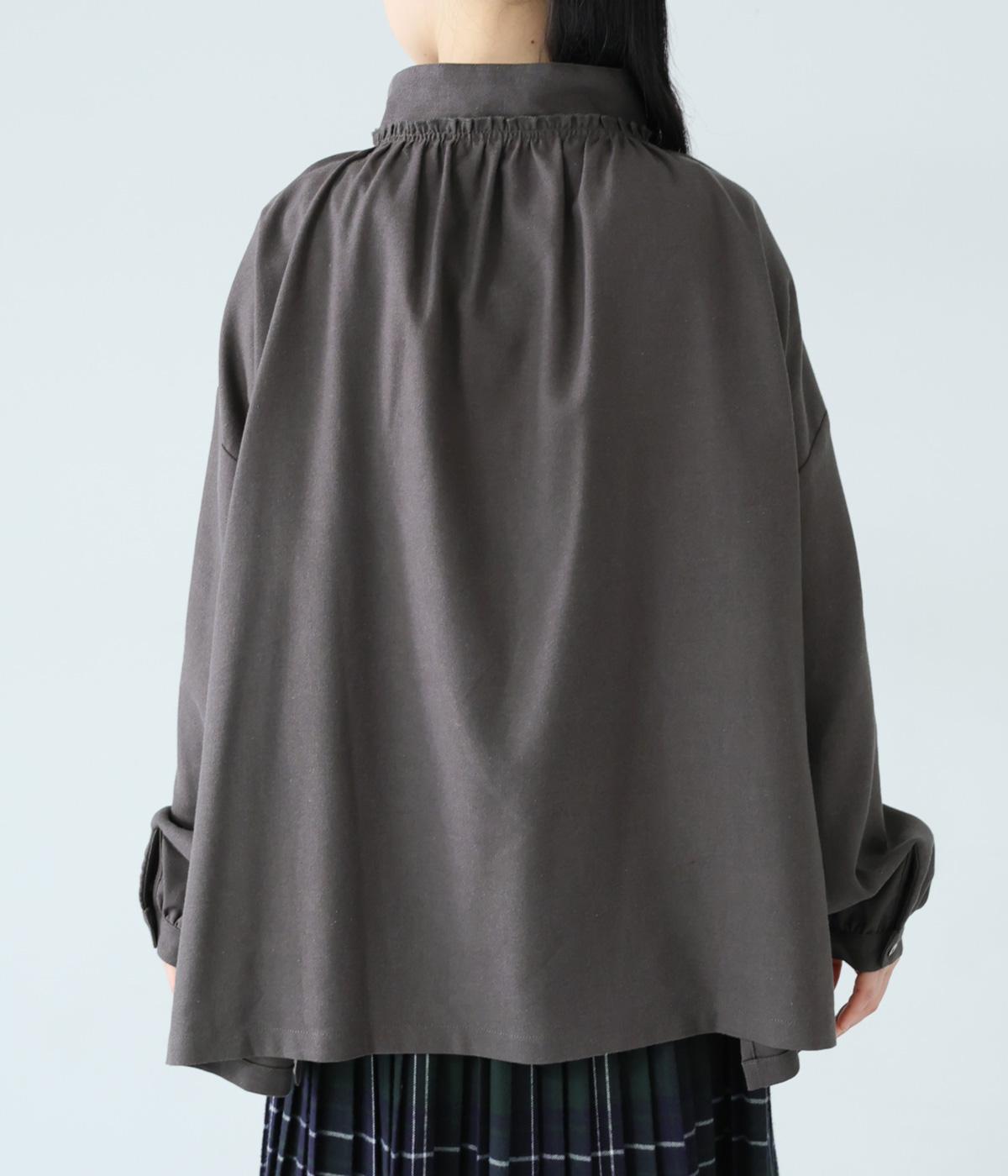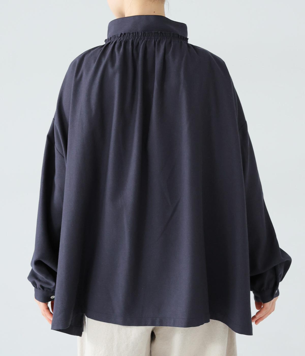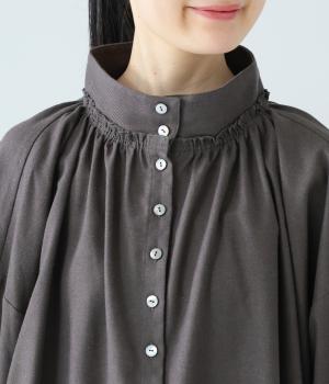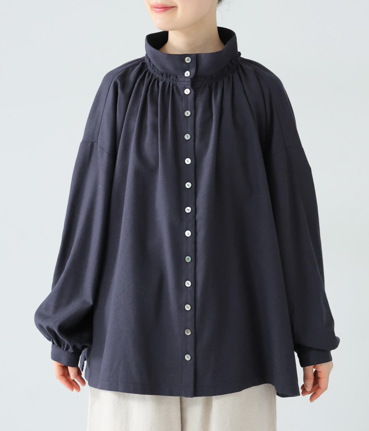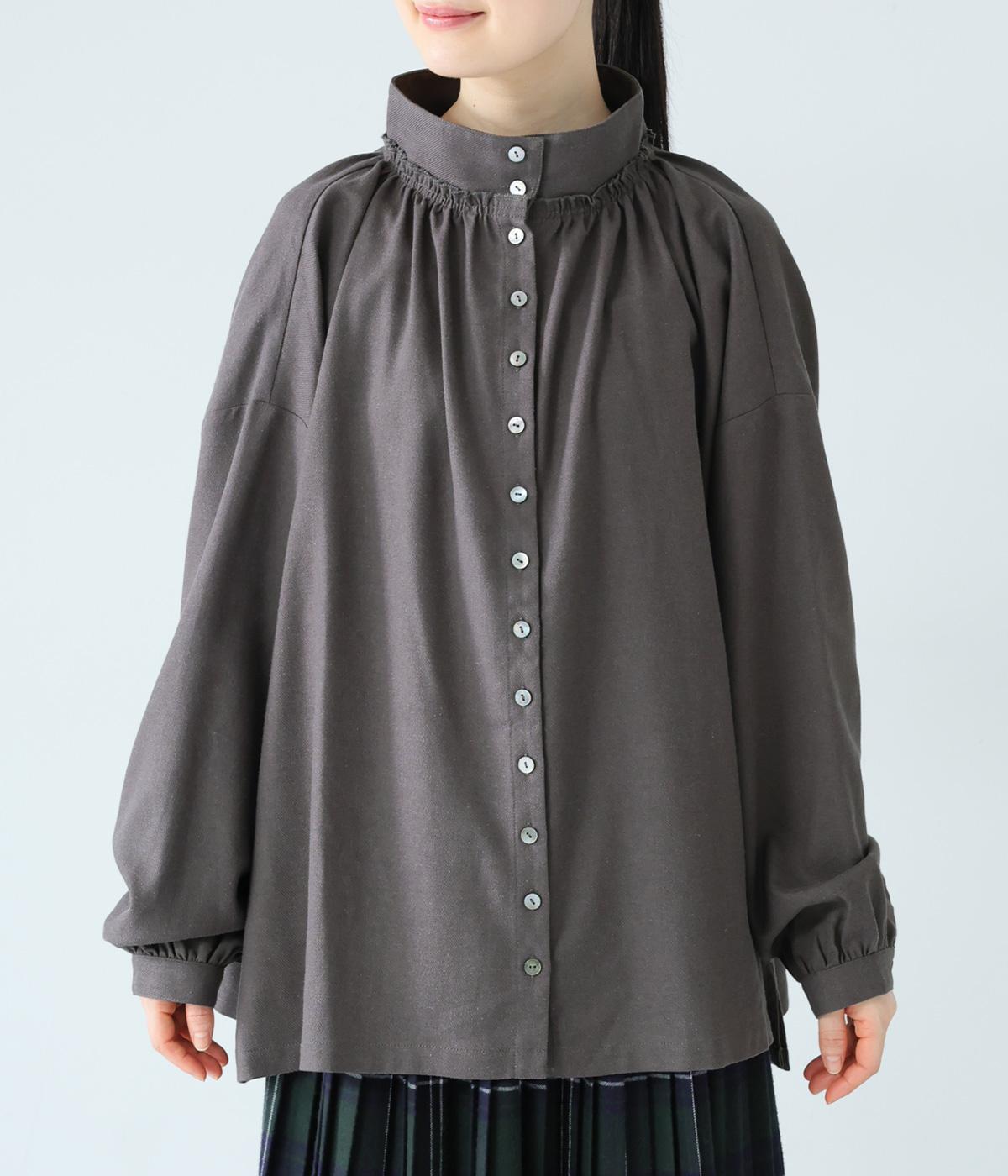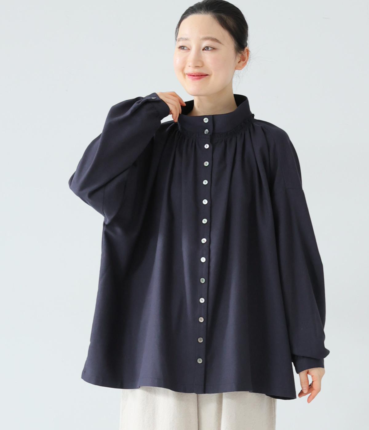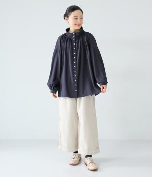 ゆったりとした着心地のドロップショルダーのブラウス。首まわりのギャザーや袖口カフスのデザインが、少しレトロな雰囲気を漂わせます。一枚でシンプルにボトムと合わせてもサマになり、前開きなので、羽織りものとしても着まわすのもおすすめです。