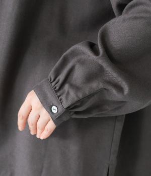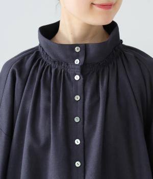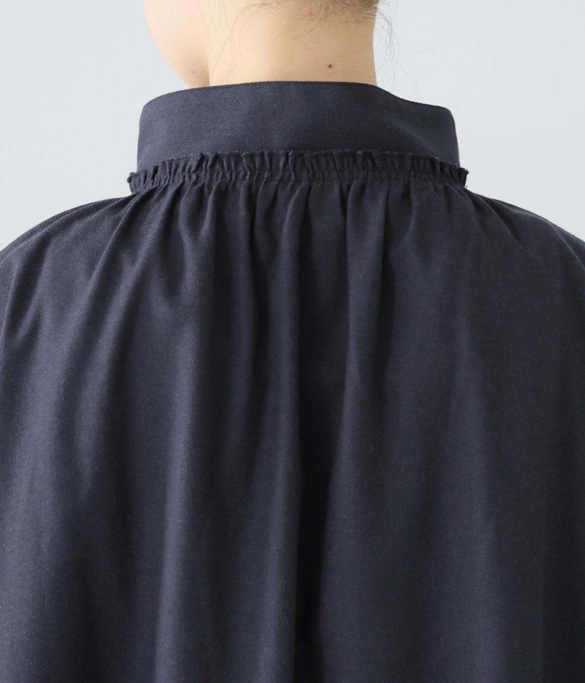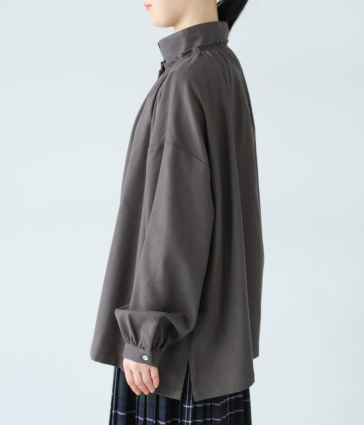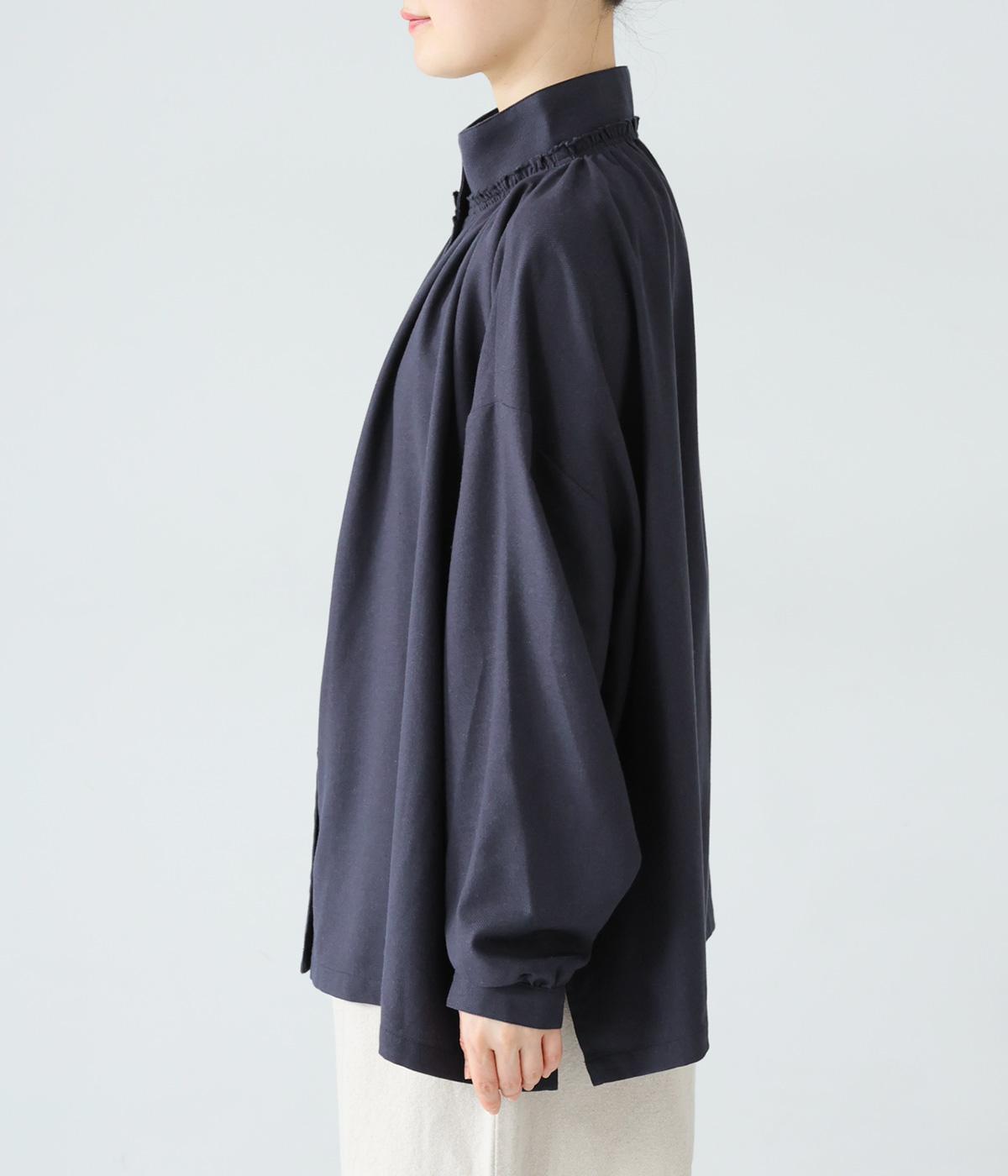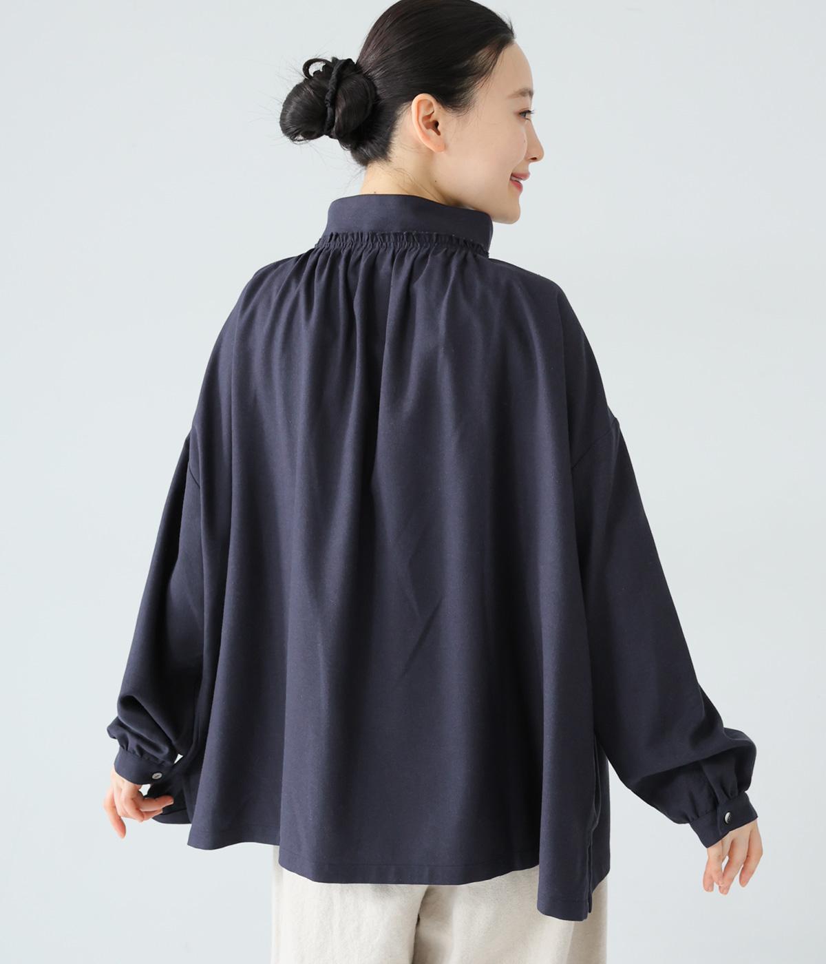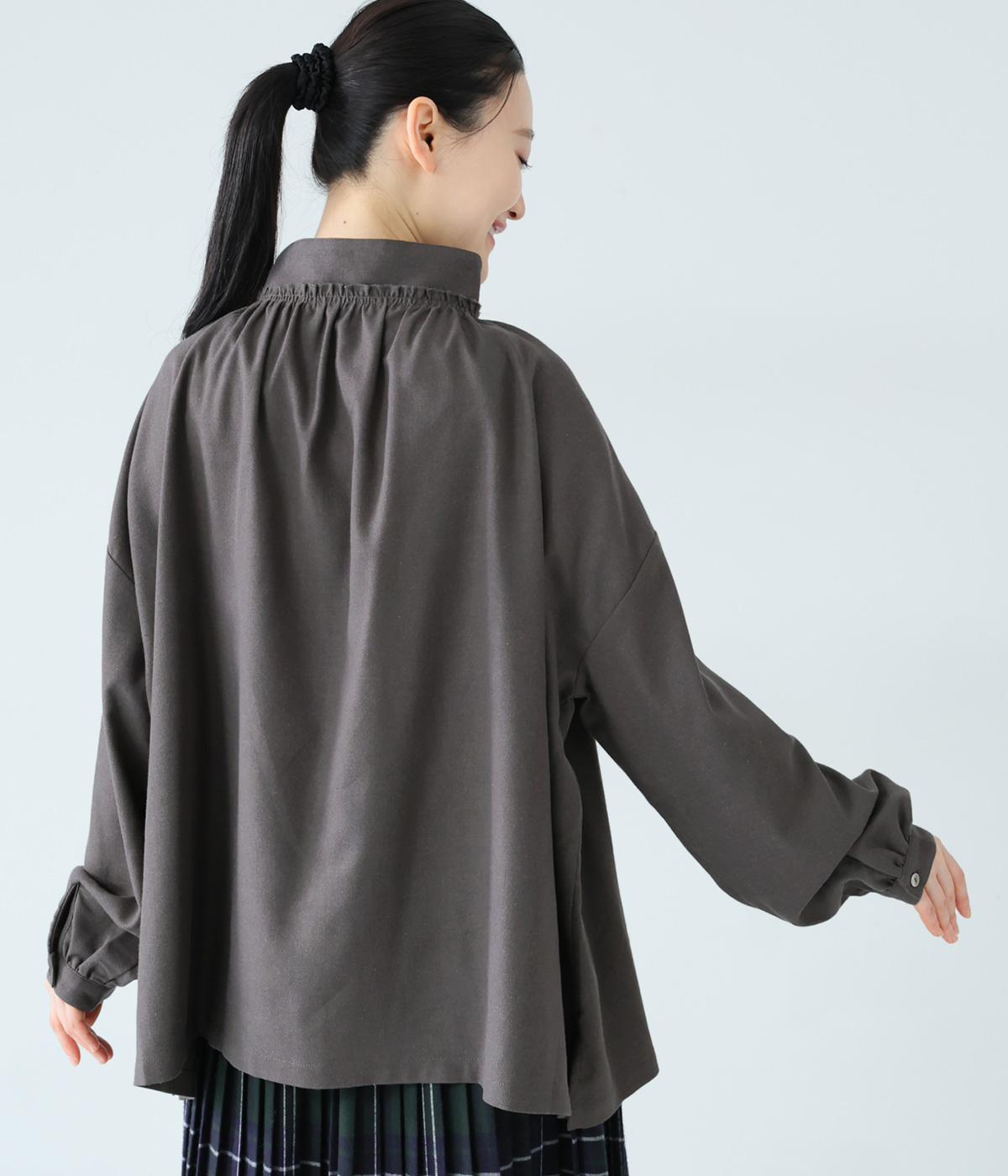 ゆったりとした着心地のドロップショルダーのブラウス。首まわりのギャザーや袖口カフスのデザインが、少しレトロな雰囲気を漂わせます。一枚でシンプルにボトムと合わせてもサマになり、前開きなので、羽織りものとしても着まわすのもおすすめです。