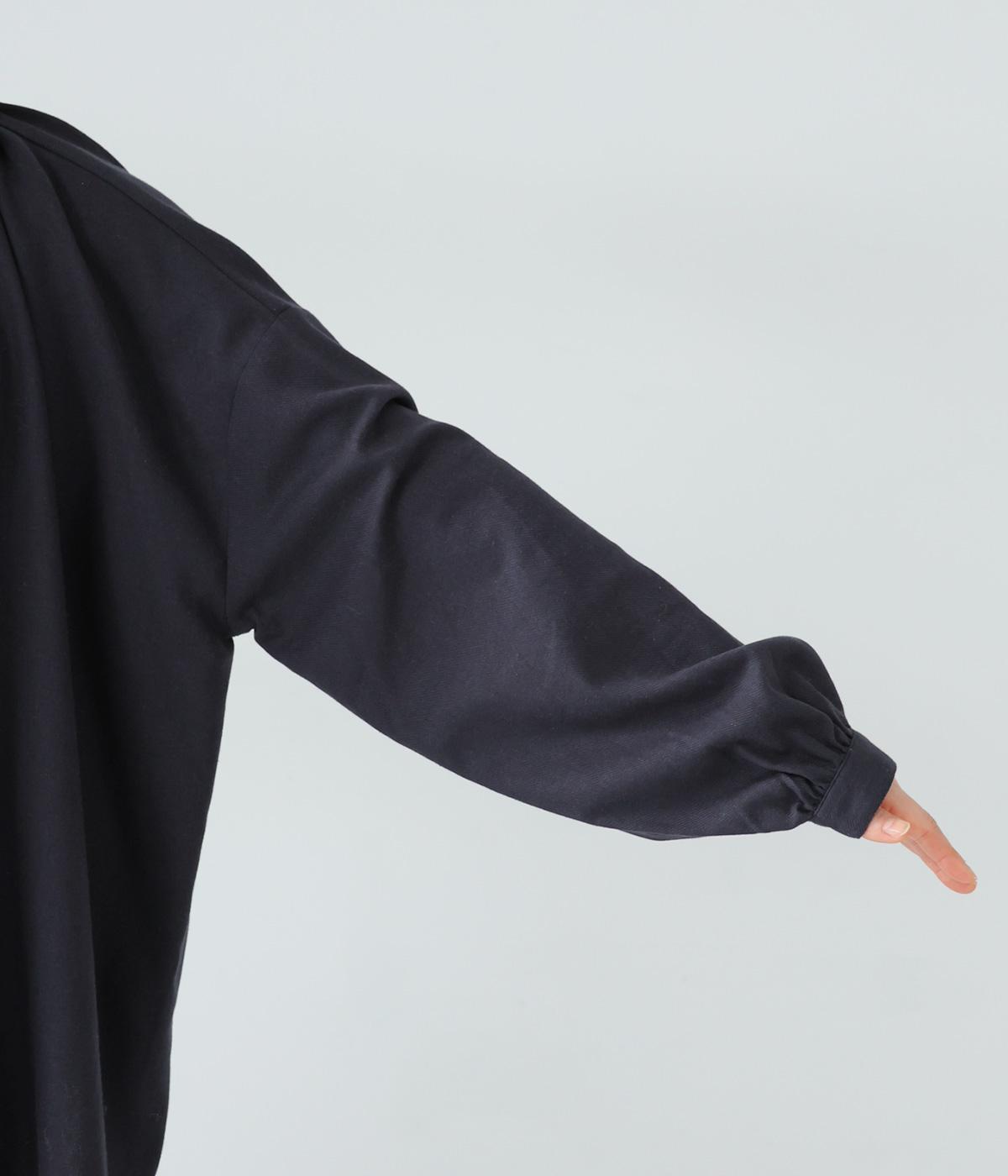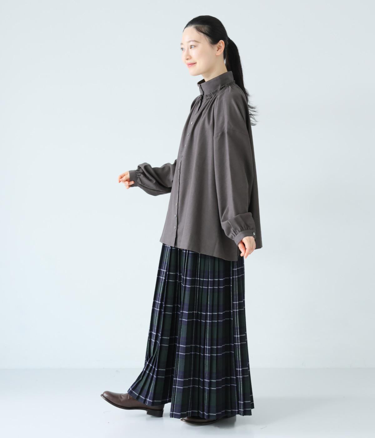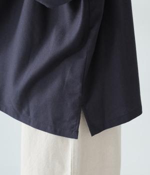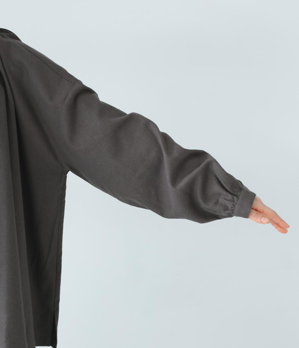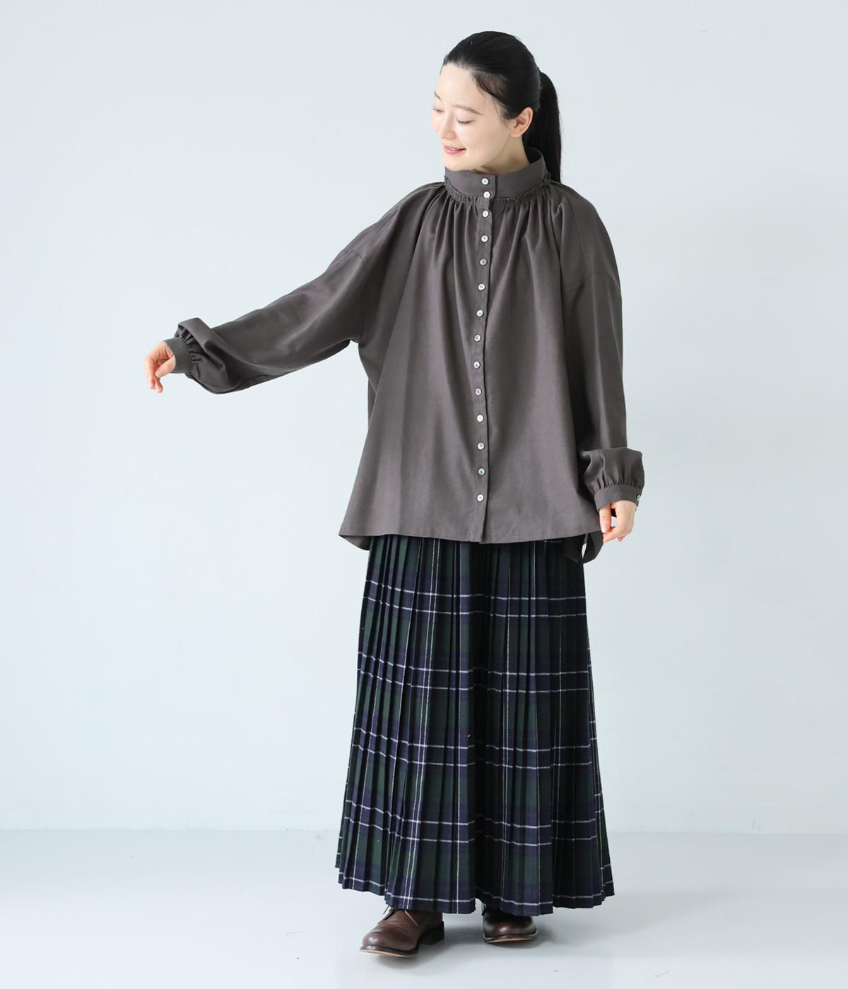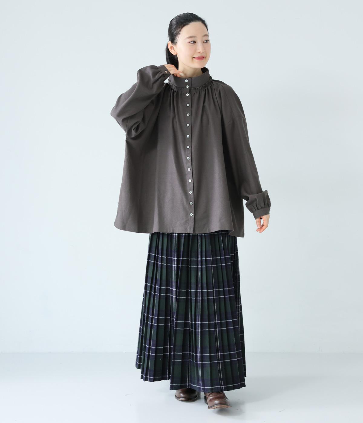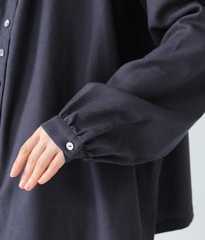 ゆったりとした着心地のドロップショルダーのブラウス。首まわりのギャザーや袖口カフスのデザインが、少しレトロな雰囲気を漂わせます。一枚でシンプルにボトムと合わせてもサマになり、前開きなので、羽織りものとしても着まわすのもおすすめです。