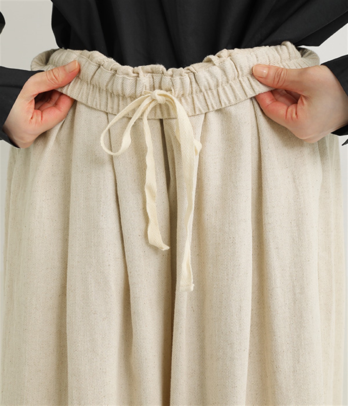 心地よくフィットするゴムウエストはコードで微調整可能