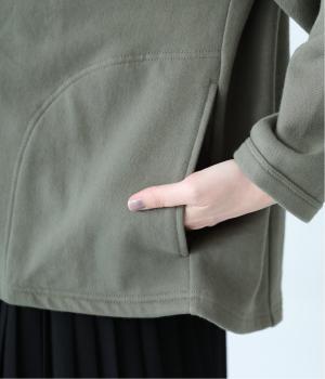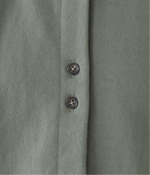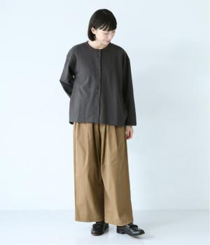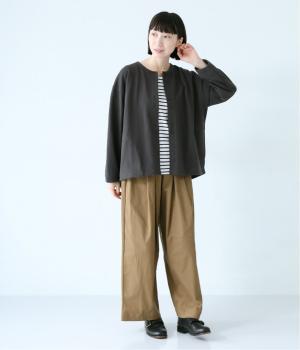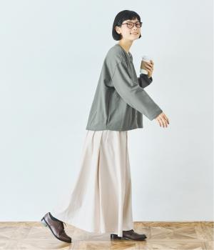 アッシュトーンのグリーンを引き立てる、グレージュのワイドパンツと合わせたコーディネート。ボタンを留めてプルオーバー風に着こなせば、秋の始まりに心地よくなじみます。