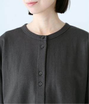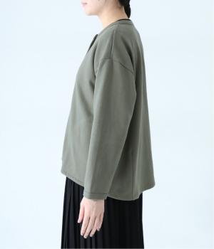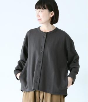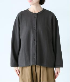 スウェット地ならではのリラクシーな着心地に、きちんと感のある印象を添えたクルーネックカーディガン。二つずつ並んだボタンが、さりげないアクセントに。オリジナルで染め上げた<スミクロ><ナチュラル><グリーン>の3色をご用意しました。