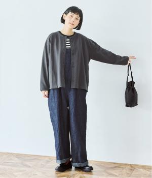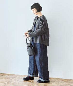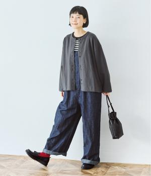 長年寄り添ってきたような風合いがこなれ感のあるスミクロ。肩の力を抜いたボーダー×サロペットに羽織れば、端正なデザインがほどよい品を添えて、落ち着きのある仕上がりに。