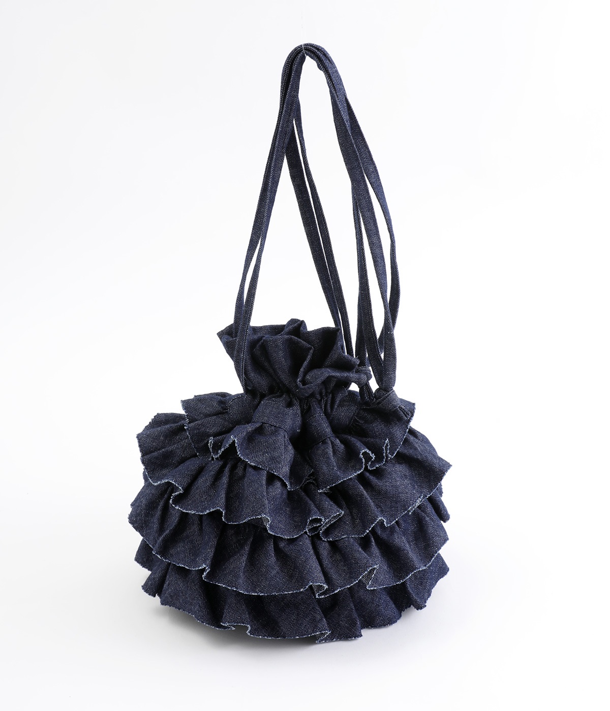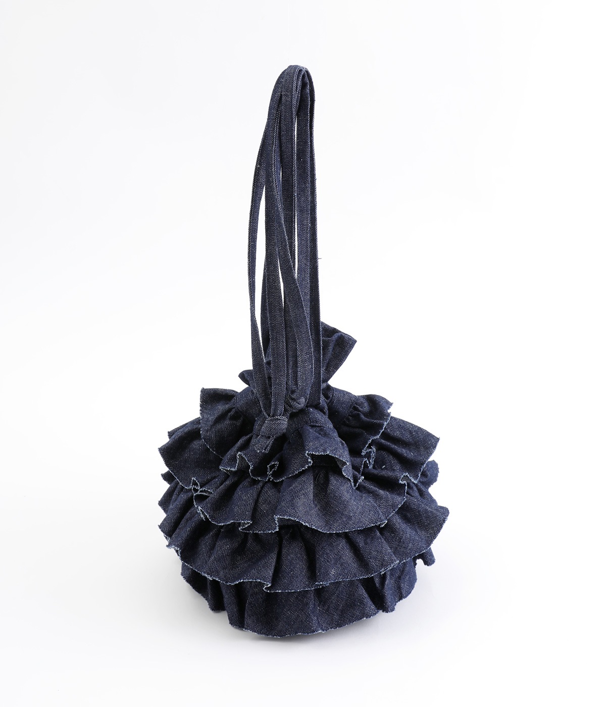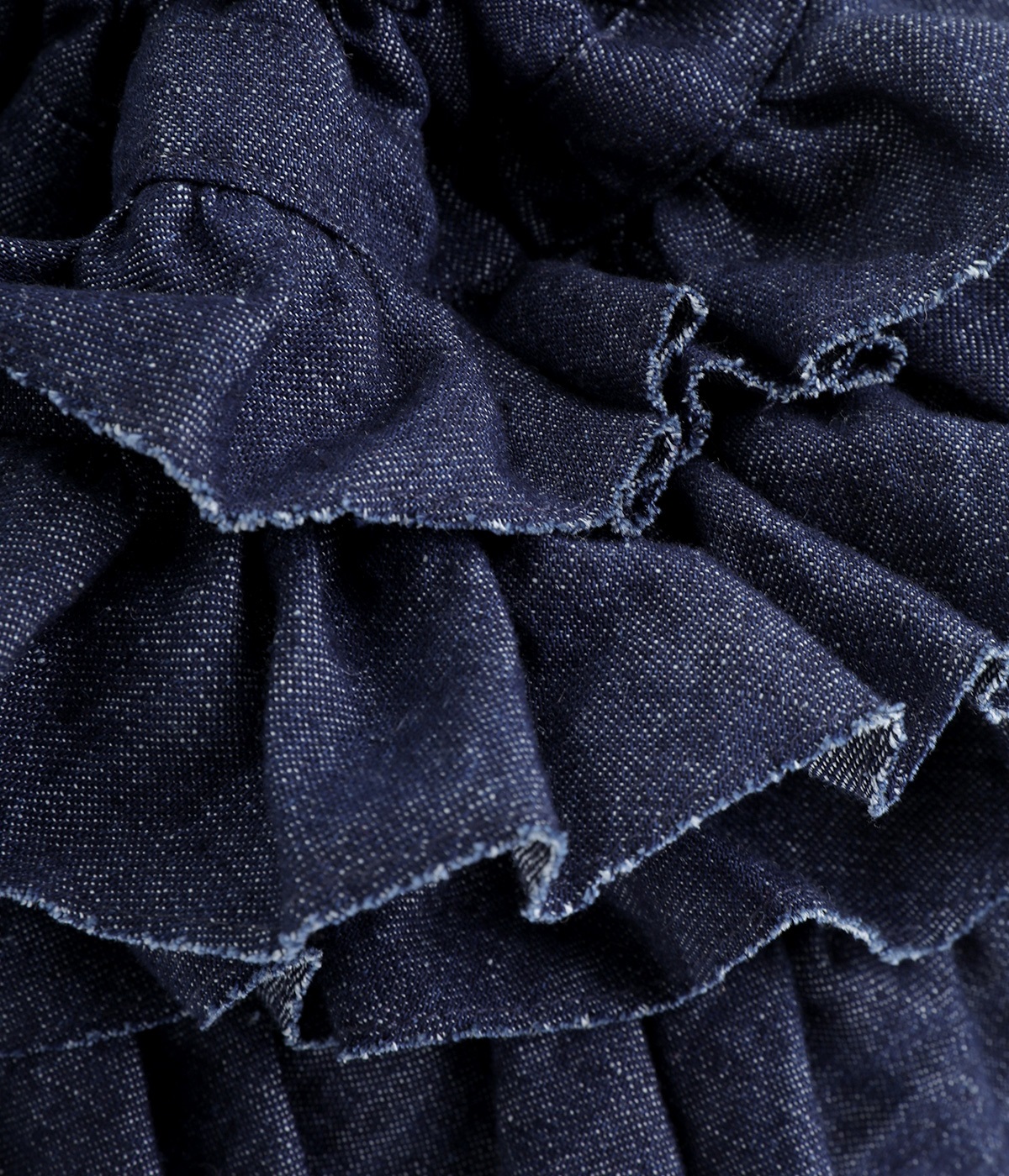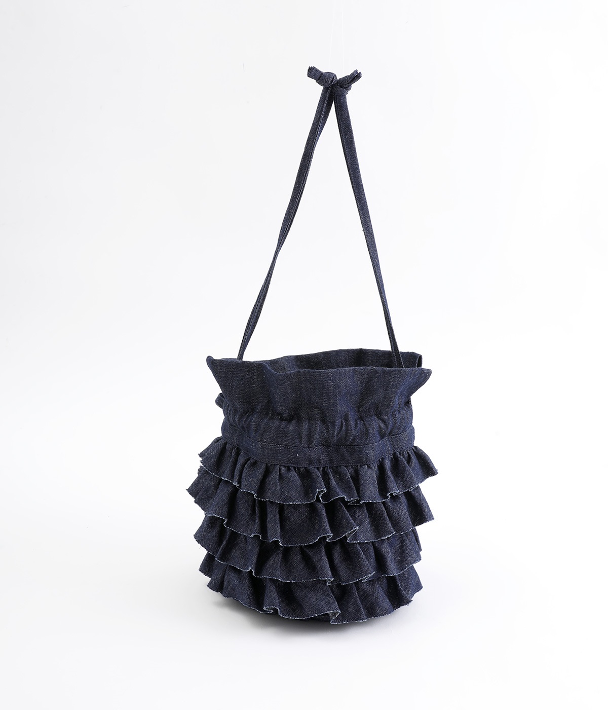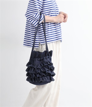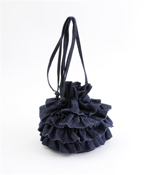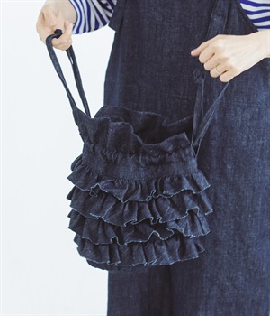 切りっぱなしのデニム生地でティアードフリルの甘さにラフな雰囲気をミックスしました。デイリー使いにぴったりのカジュアルな素材感がポイント。