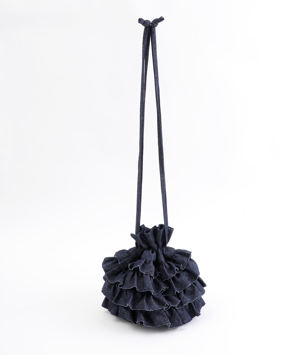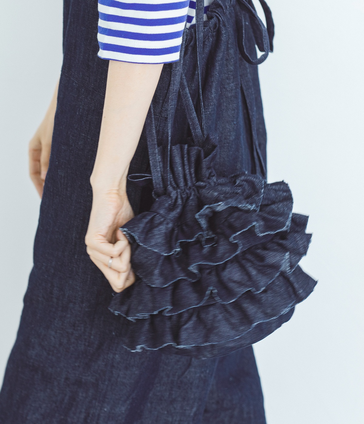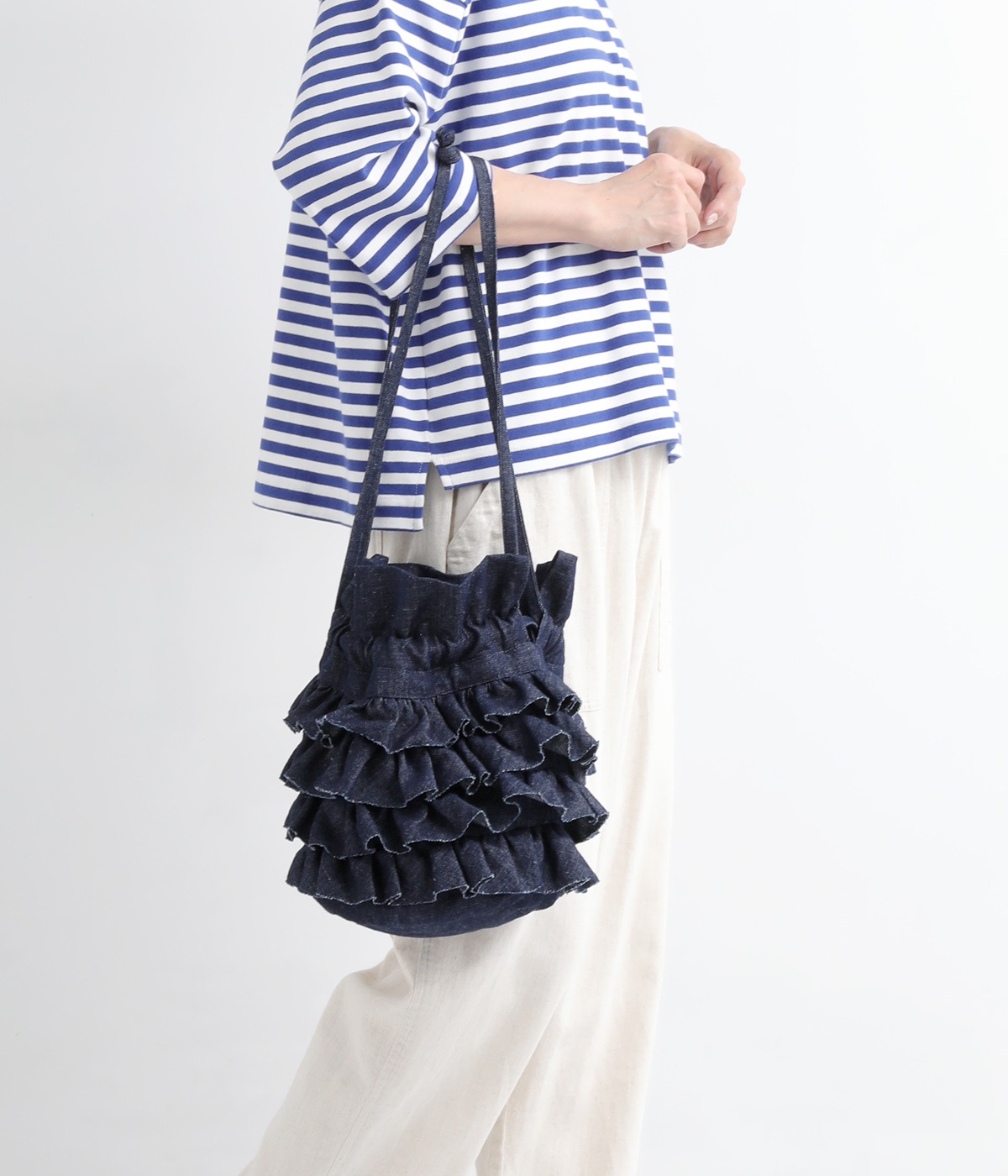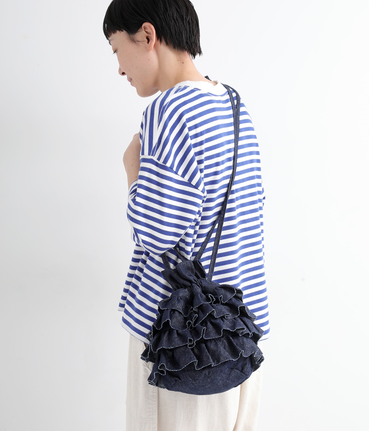 切りっぱなしのデニム生地でティアードフリルの甘さにラフな雰囲気をミックスしました。デイリー使いにぴったりのカジュアルな素材感がポイント。