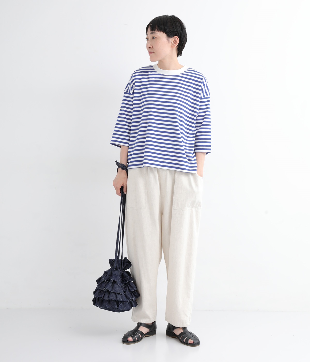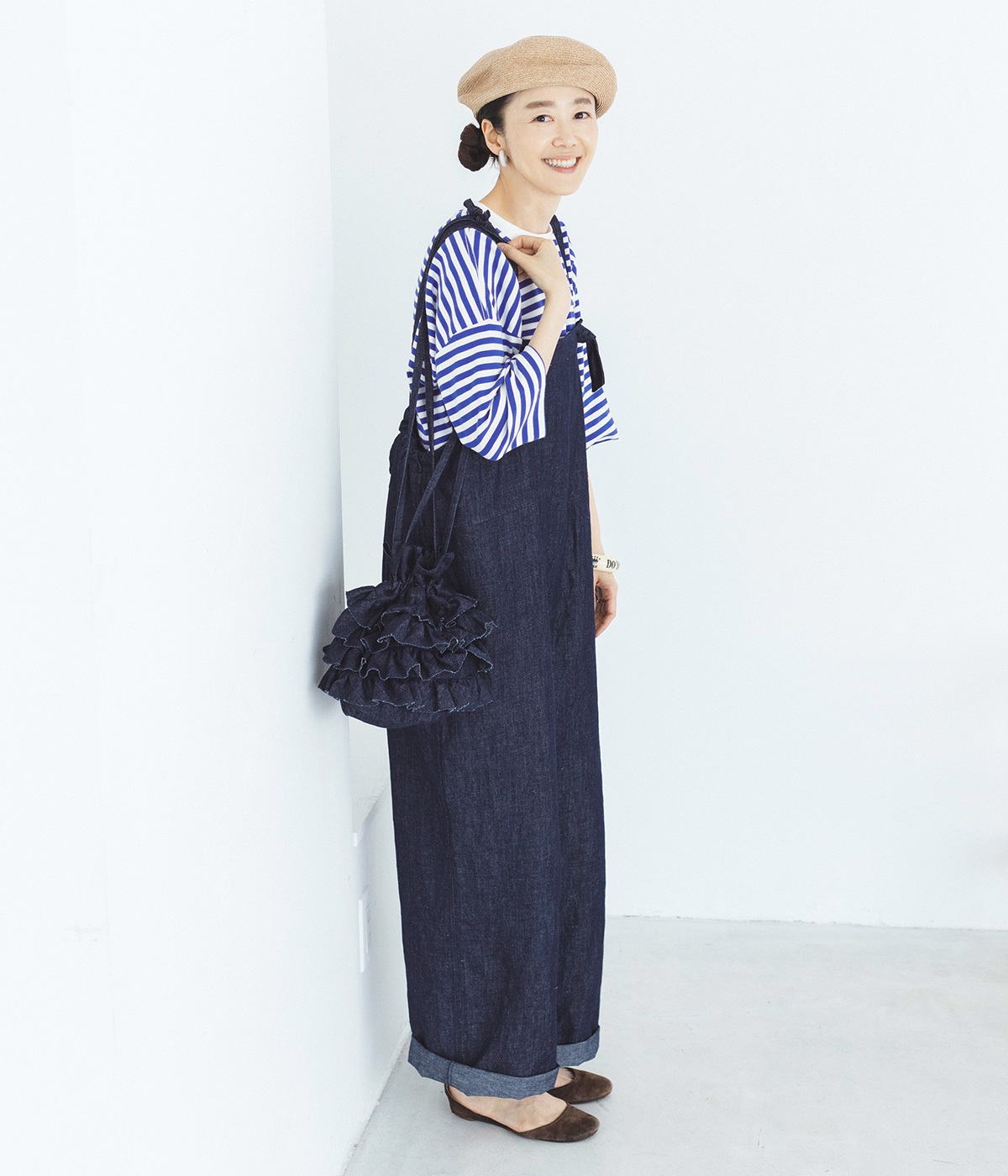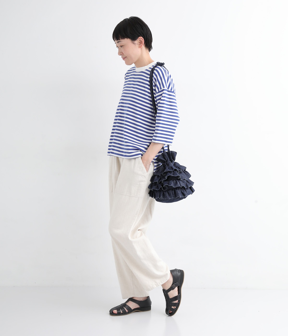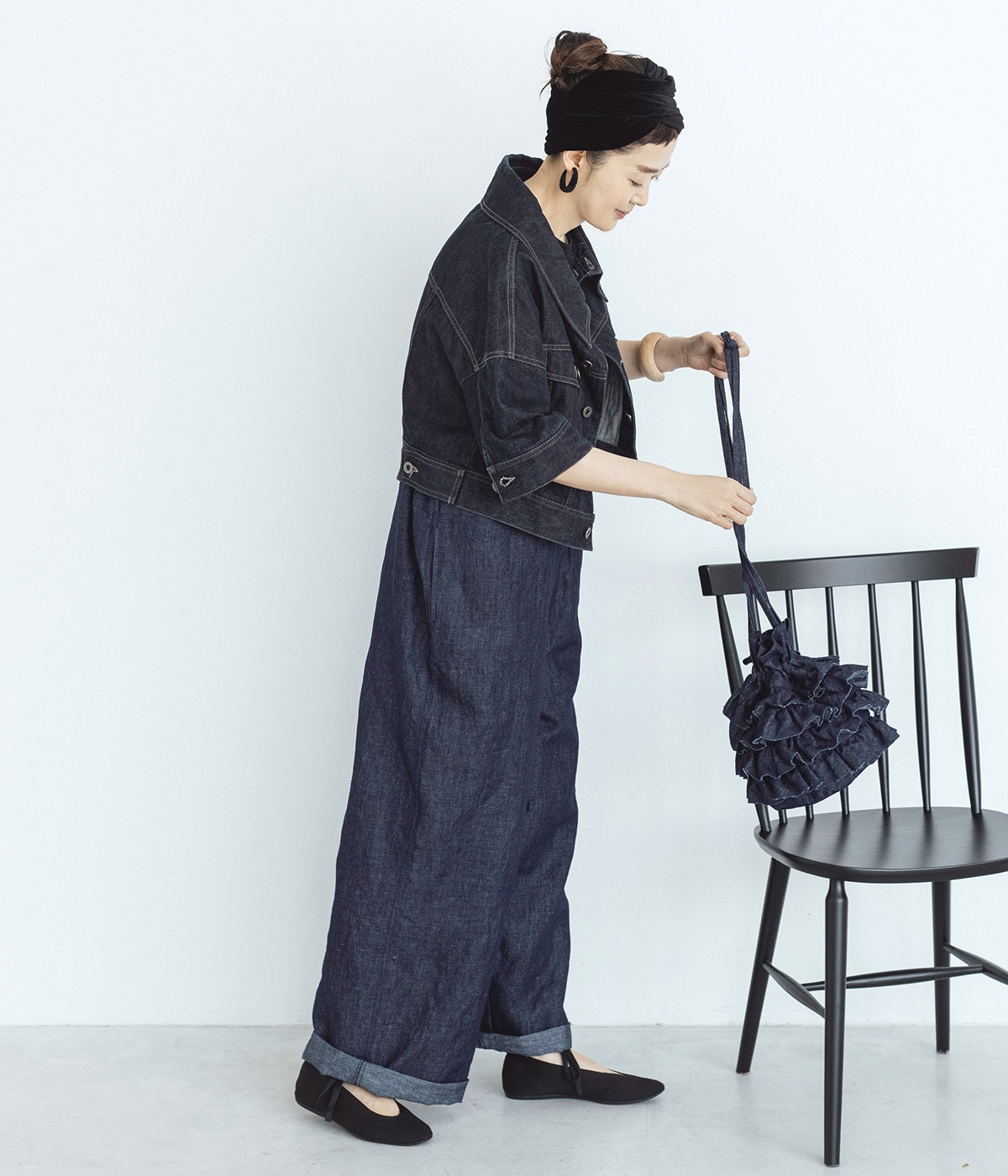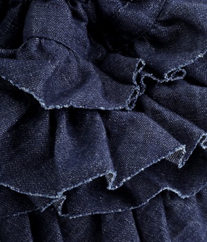 切りっぱなしのデニム生地でティアードフリルの甘さにラフな雰囲気をミックスしました。デイリー使いにぴったりのカジュアルな素材感がポイント。