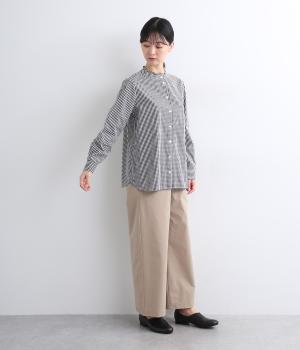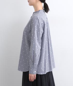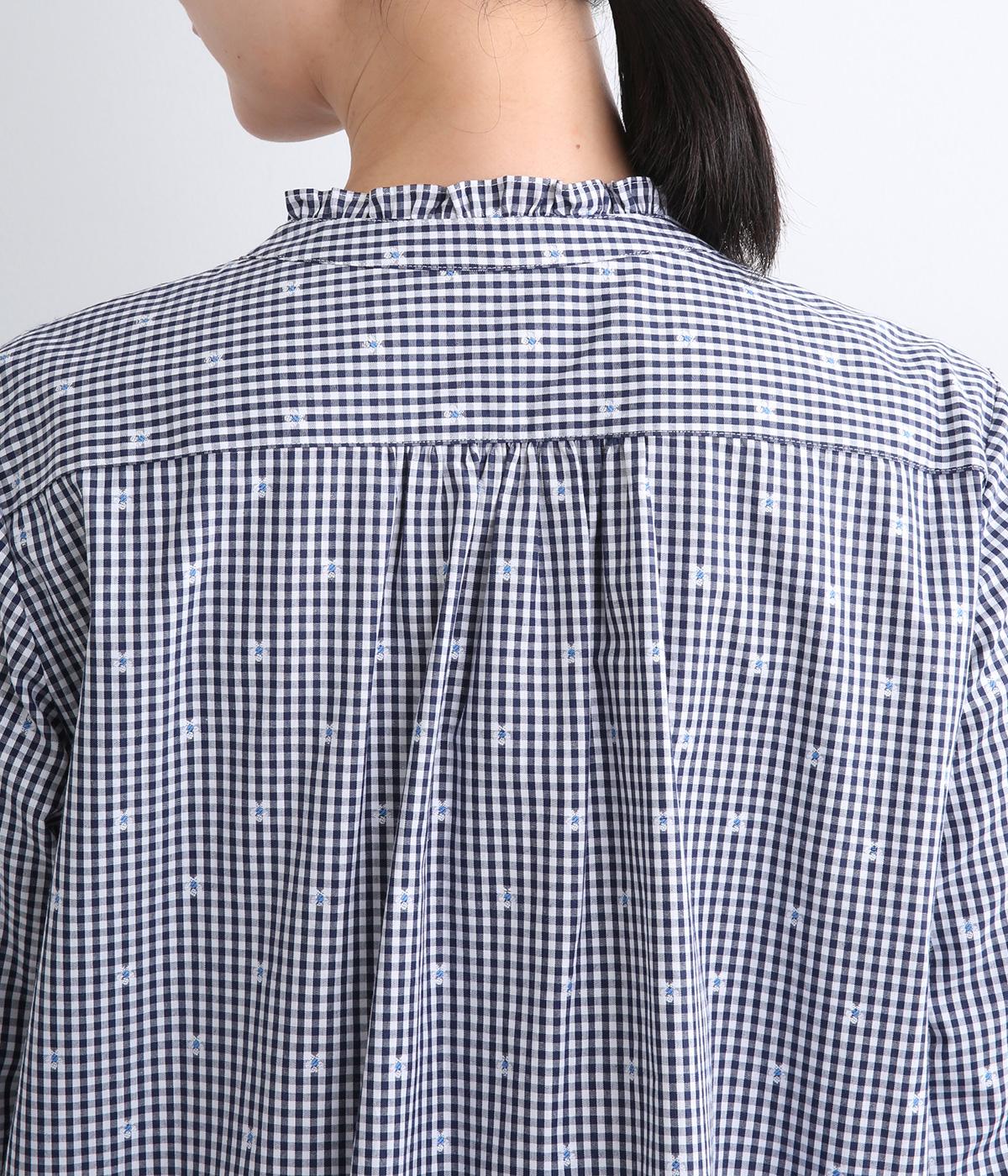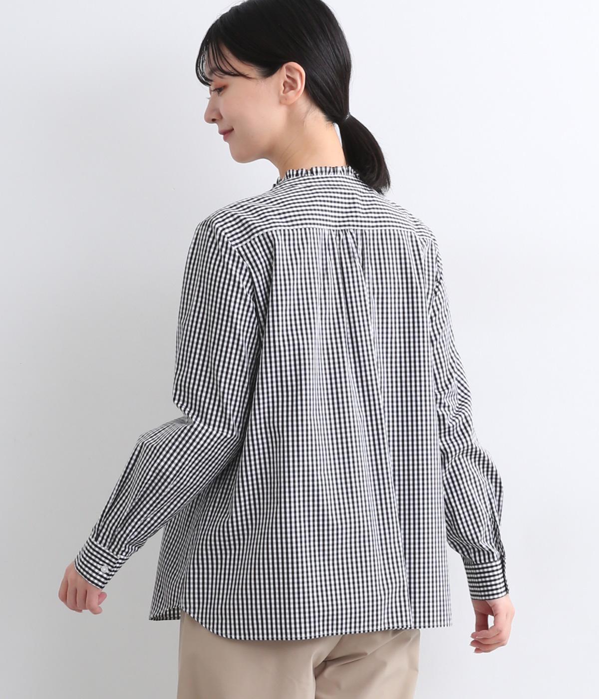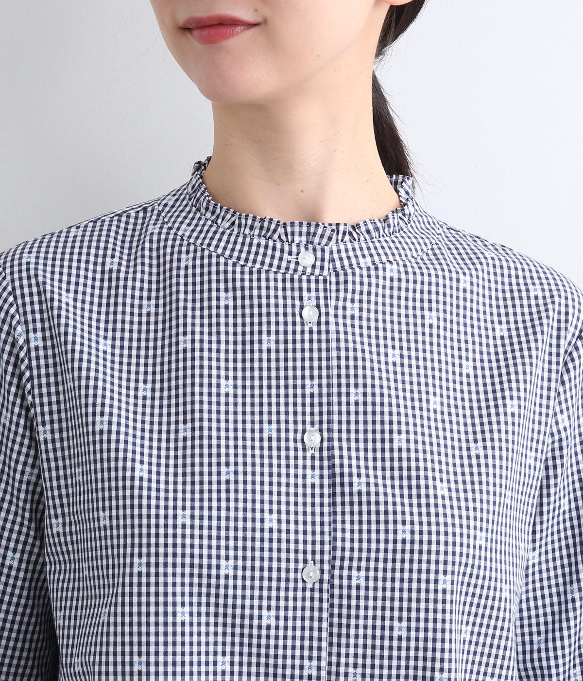 前はすっきりと、後ろはギャザーを寄せて適度にゆとりを持たせた着こなしやすいブラウスです。襟ぐりにはミニフリルをほどこしてさり気なく可愛らしさを添えています。羽織りにもなる前あき仕様で、クリアボタンもさわやかで◎。