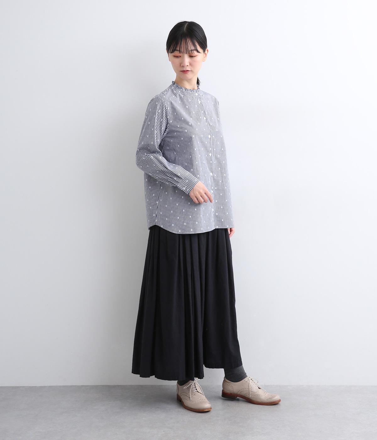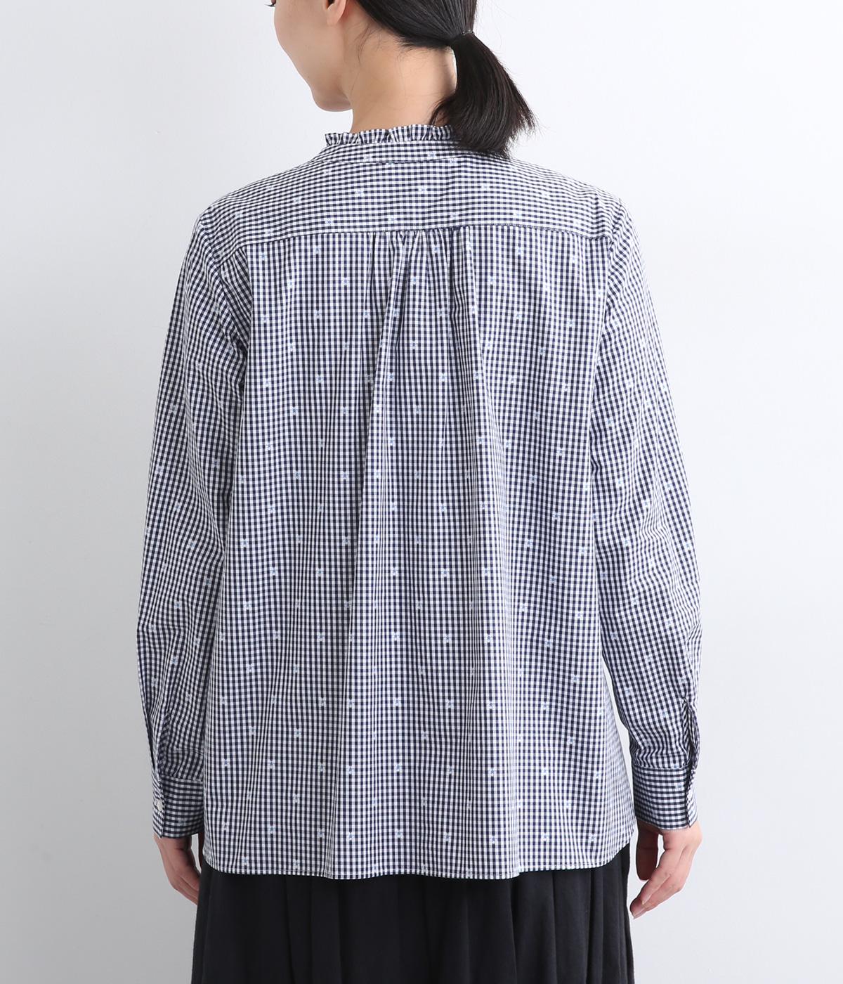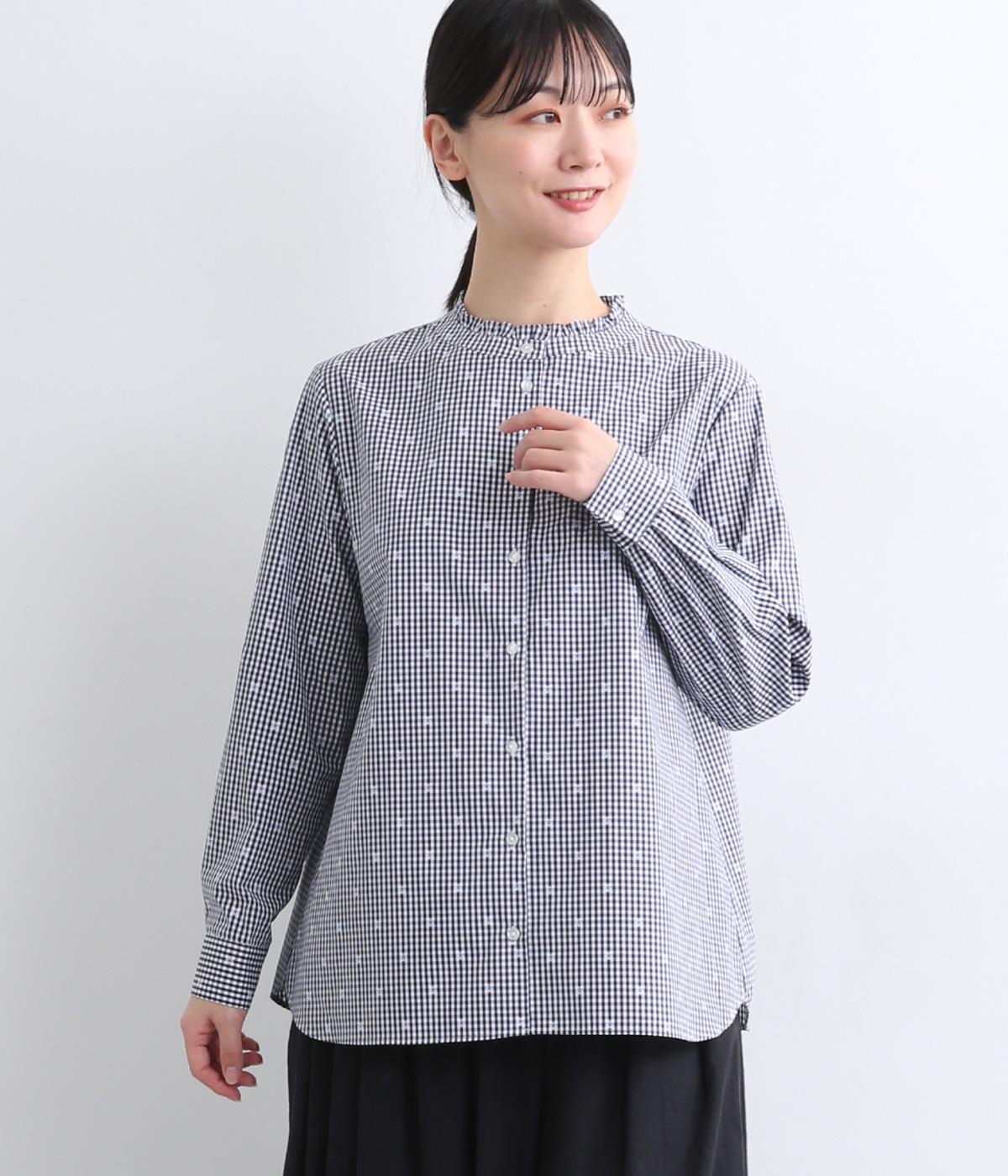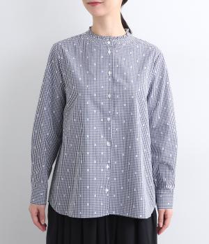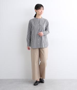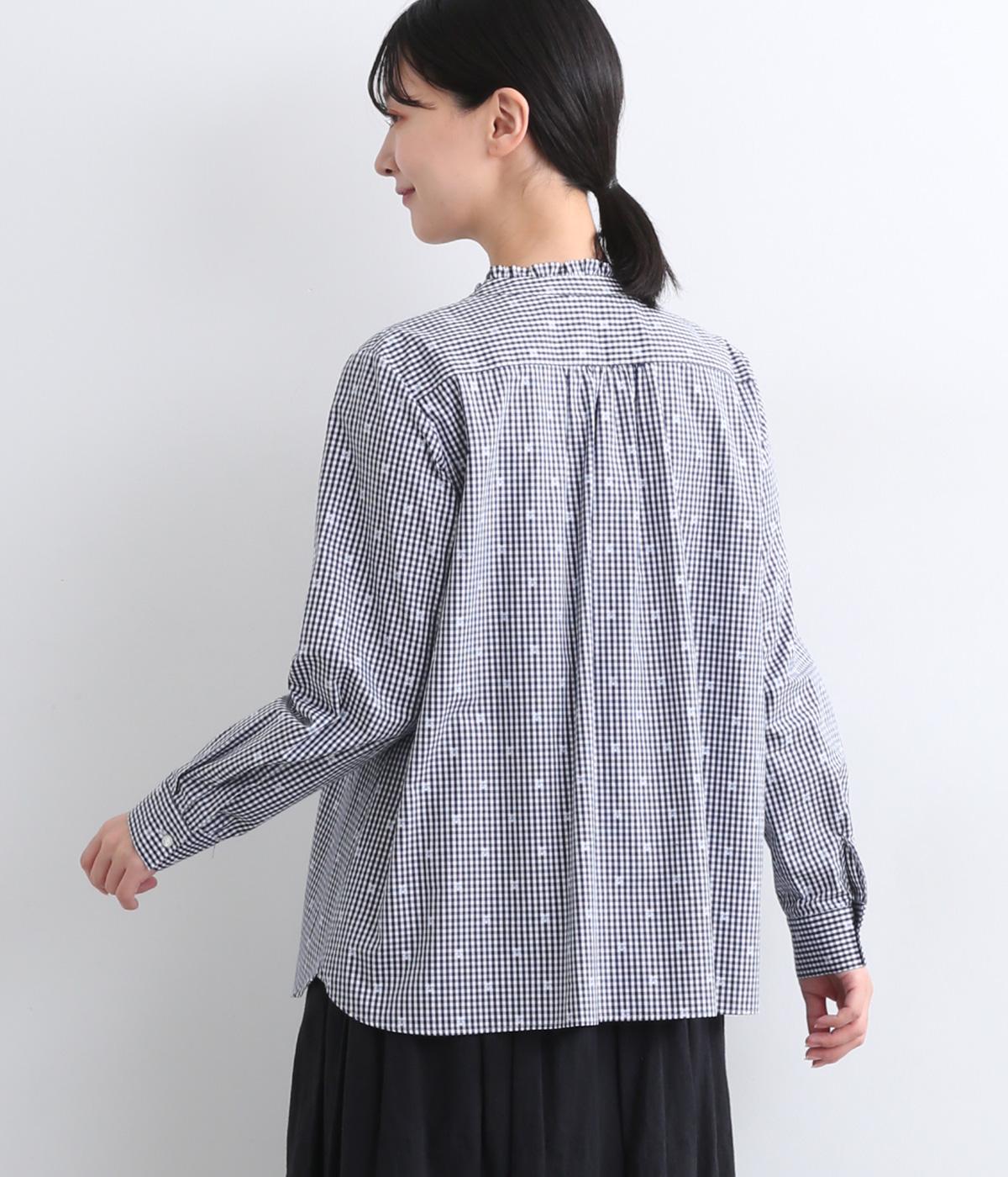 前はすっきりと、後ろはギャザーを寄せて適度にゆとりを持たせた着こなしやすいブラウスです。襟ぐりにはミニフリルをほどこしてさり気なく可愛らしさを添えています。羽織りにもなる前あき仕様で、クリアボタンもさわやかで◎。