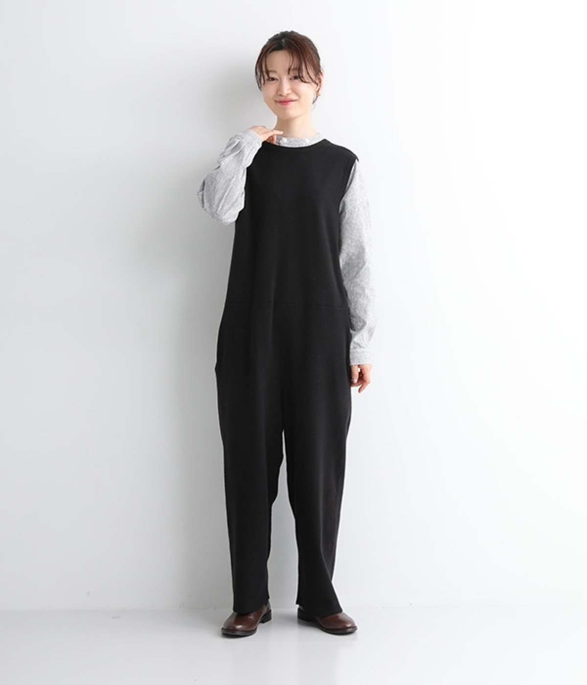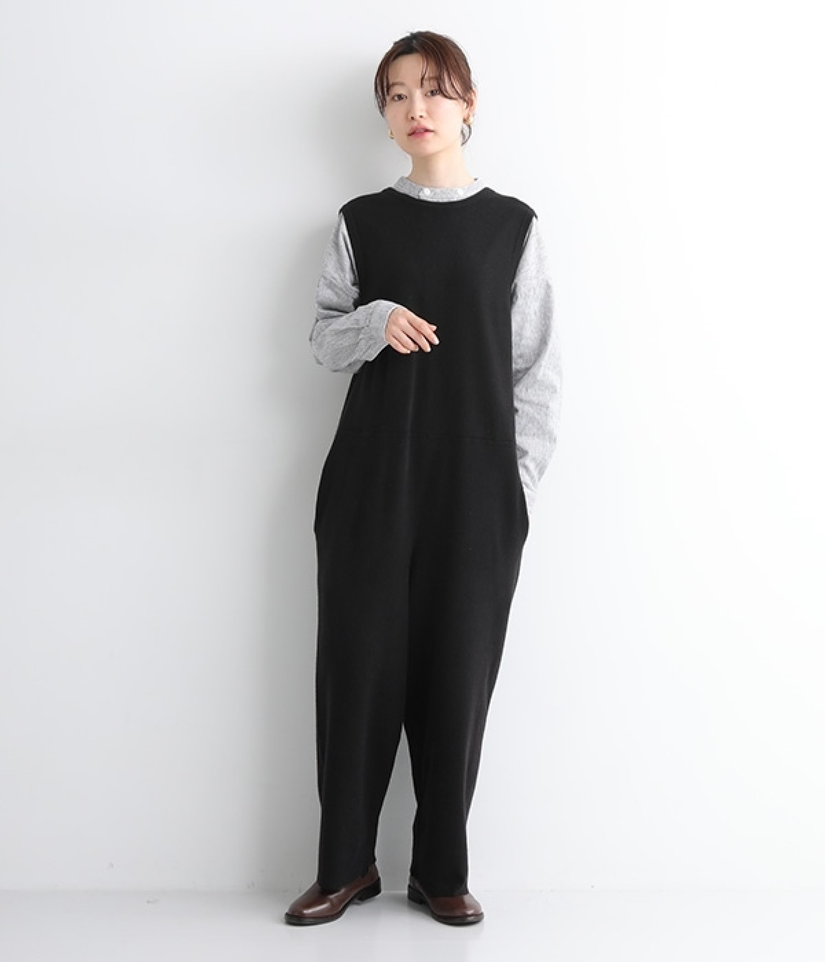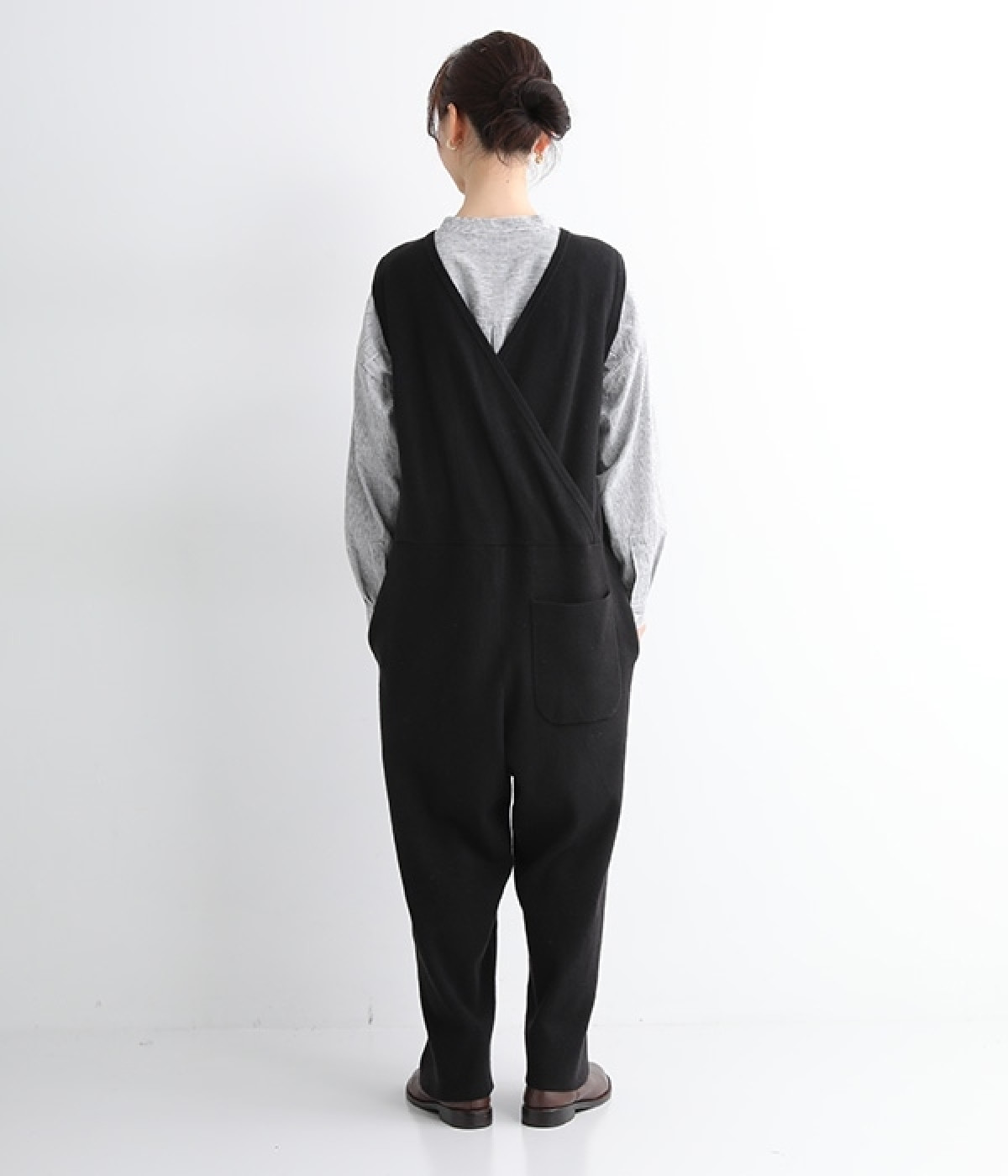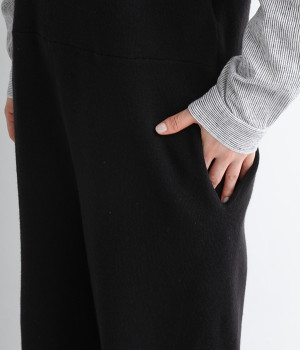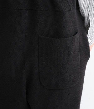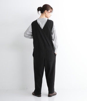 とてもよく伸びて動きやすい中肉厚のニットサロペット。密な編み地により肌触りはフラットで見た目にも上品な印象です。フロントはクルーネック、バックはカシュクール風のVネックと全く異なるデザインにも注目を。左右にはもちろん、ヒップにもポケットをつけてハンカチやスマートフォンの収納にも◎。すとんと落ちるフルレングスがすっきりとしたIラインを強調し、大人の落ち着きのあるスタイリングになじみます。