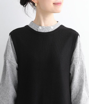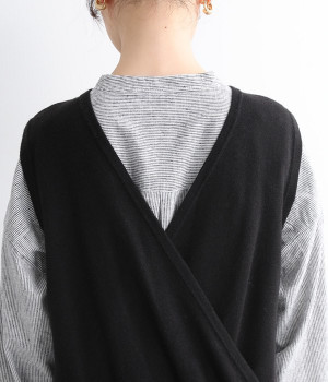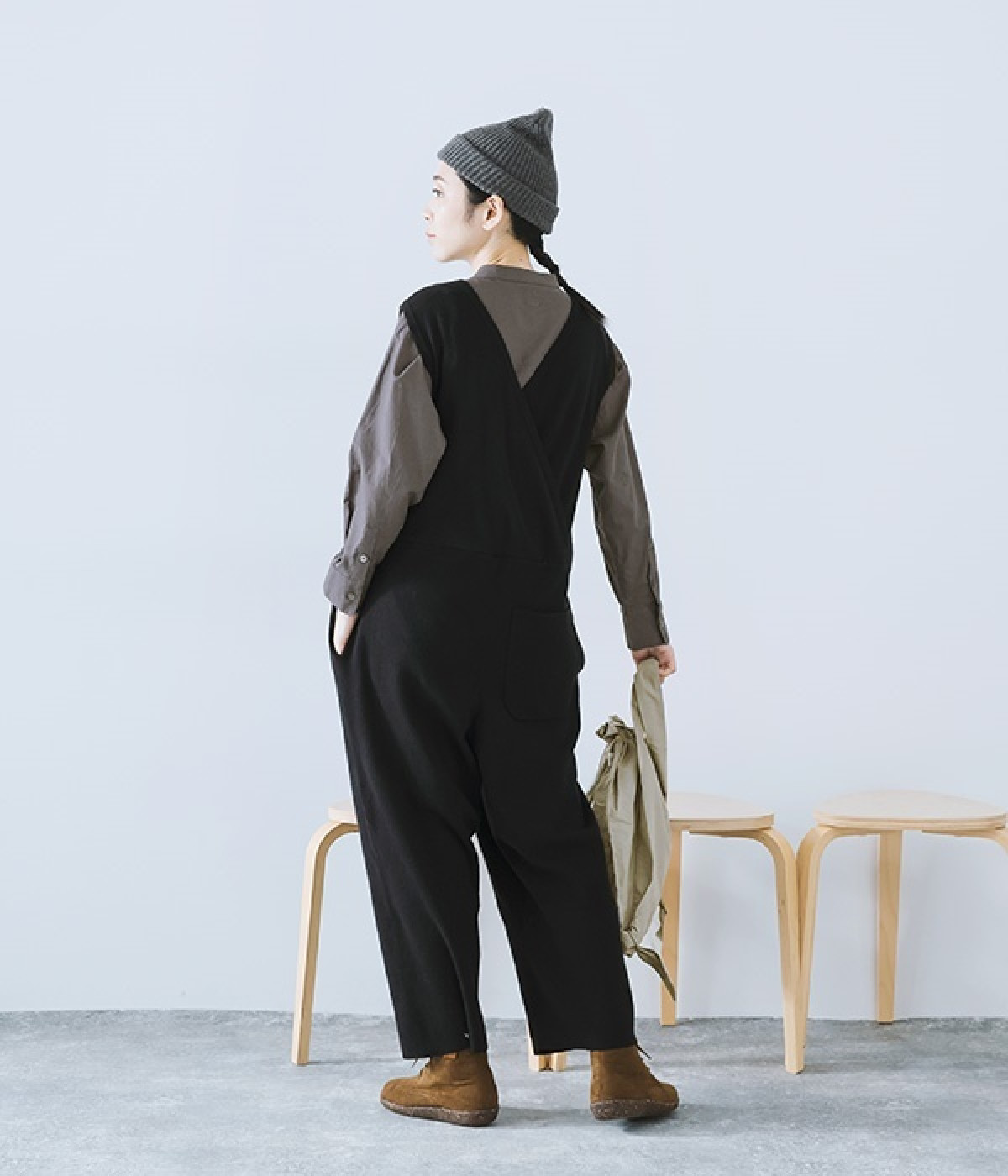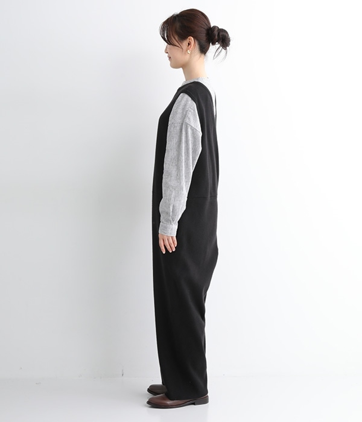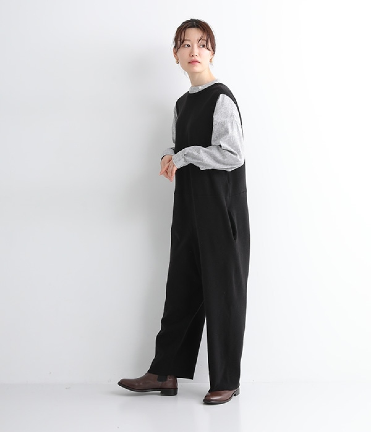 とてもよく伸びて動きやすい中肉厚のニットサロペット。密な編み地により肌触りはフラットで見た目にも上品な印象です。フロントはクルーネック、バックはカシュクール風のVネックと全く異なるデザインにも注目を。左右にはもちろん、ヒップにもポケットをつけてハンカチやスマートフォンの収納にも◎。すとんと落ちるフルレングスがすっきりとしたIラインを強調し、大人の落ち着きのあるスタイリングになじみます。