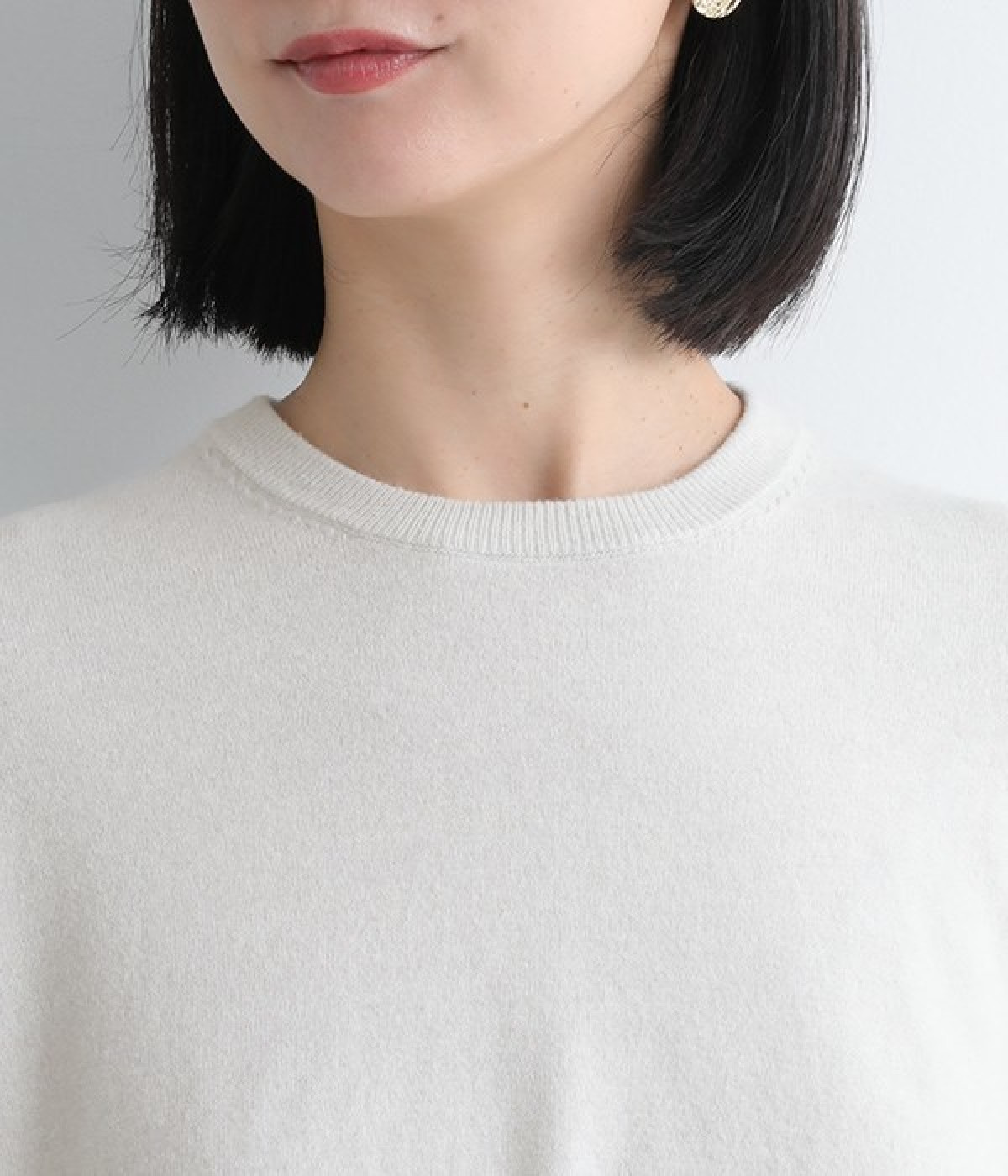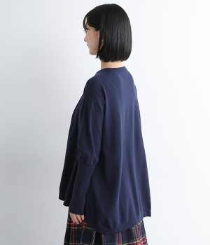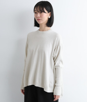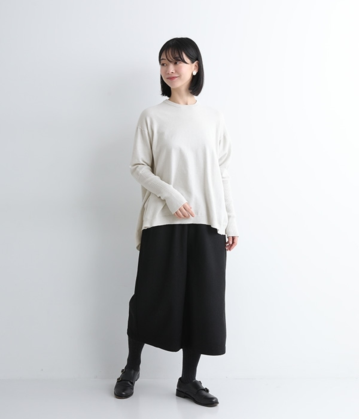度目の詰まった天竺編みで、しっとりとしたタッチと優れたストレッチ性を誇るプルオーバーです。袖はリブ編みでシルエットを引き締め、サイドにはマチをとったゆとりのあるAライン。着心地の良さも大人っぽい装いも両方叶えてくれるデザインに仕立てています。すっきりきれいめなコーディネートのほか、裾の広がりによってワイドボトムにも合わせやすいのが高ポイントです。