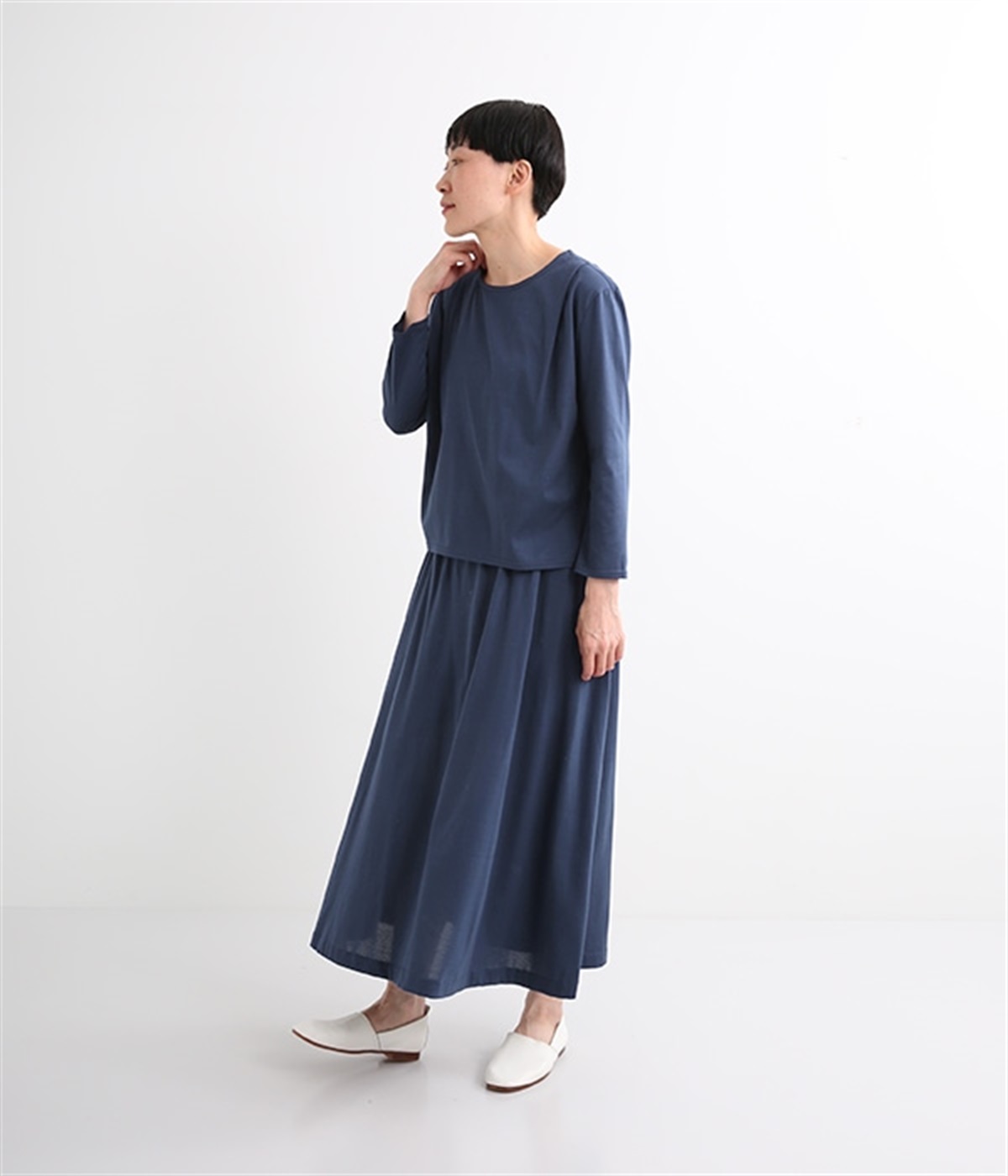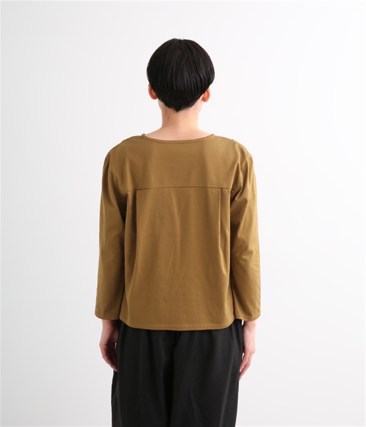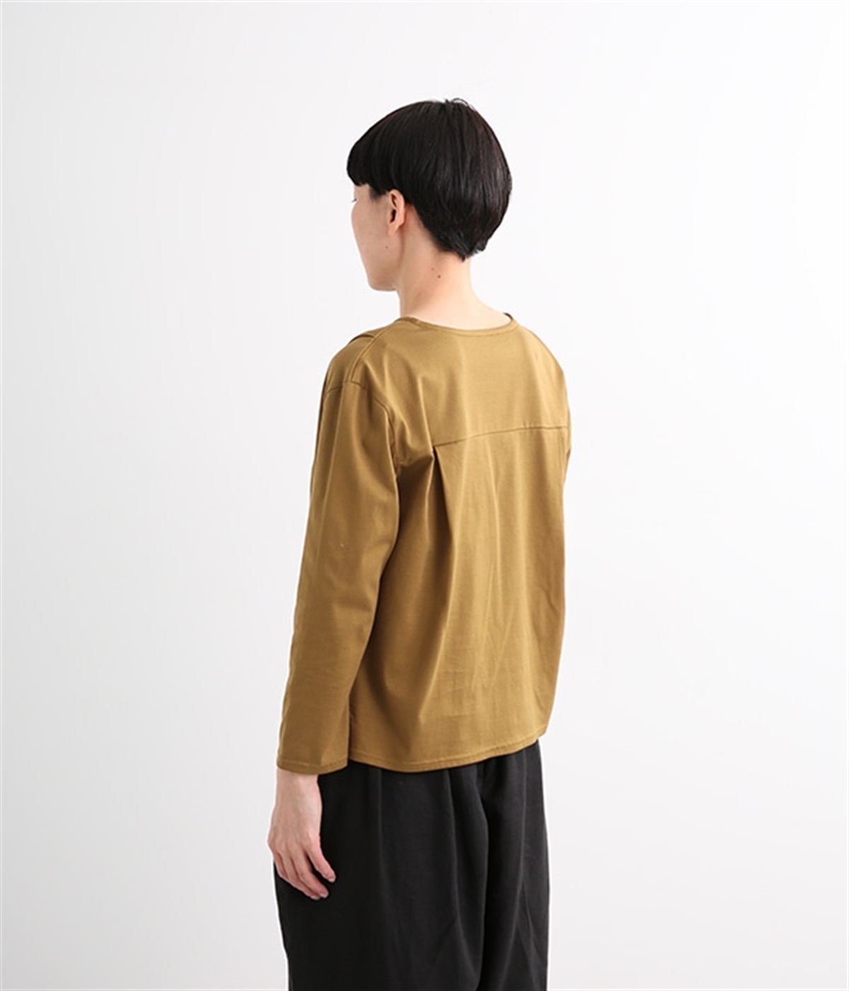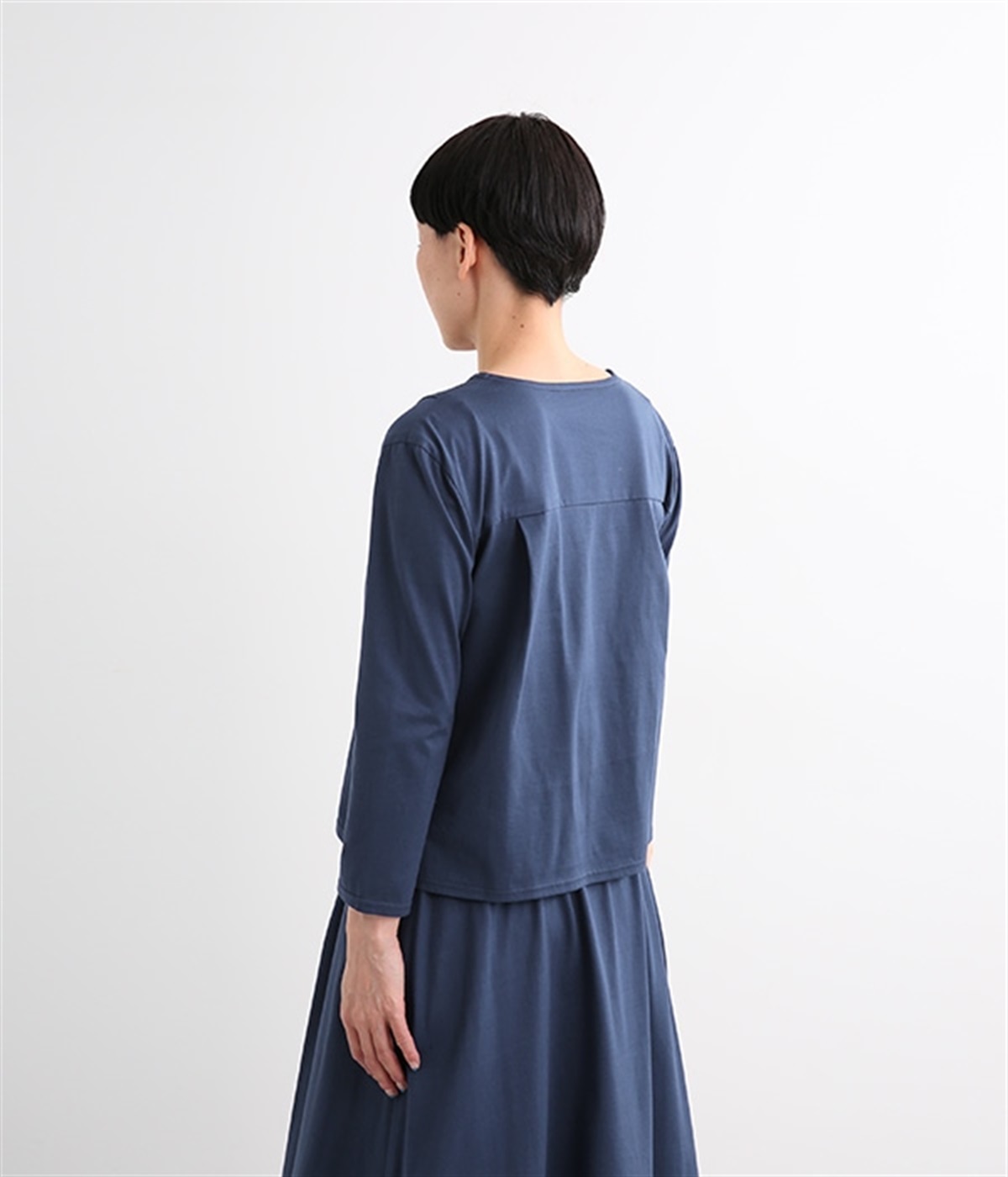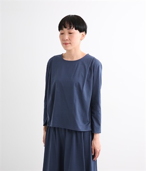日本製のソフトなシルケット天竺で仕立てたプルオーバーです。毛羽立ちのないカットソー生地で、カジュアルになりがちなアイテムもきれいめにまとまっています。広がりをおさえた襟開きに前身頃肩の太めのタックがエレガントな要素をプラス。後ろは肩ヨークとヨーク下のタックでバックシャンなデザインも持たせています。同素材のスカートと合わせればデイリーに着まわせる大人スタイルの完成です。