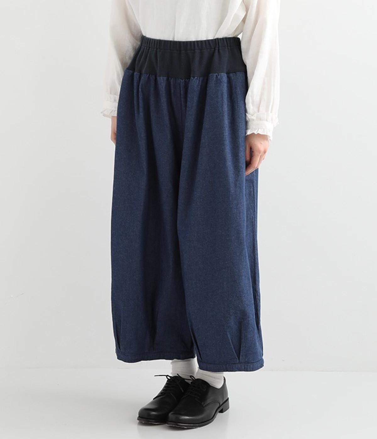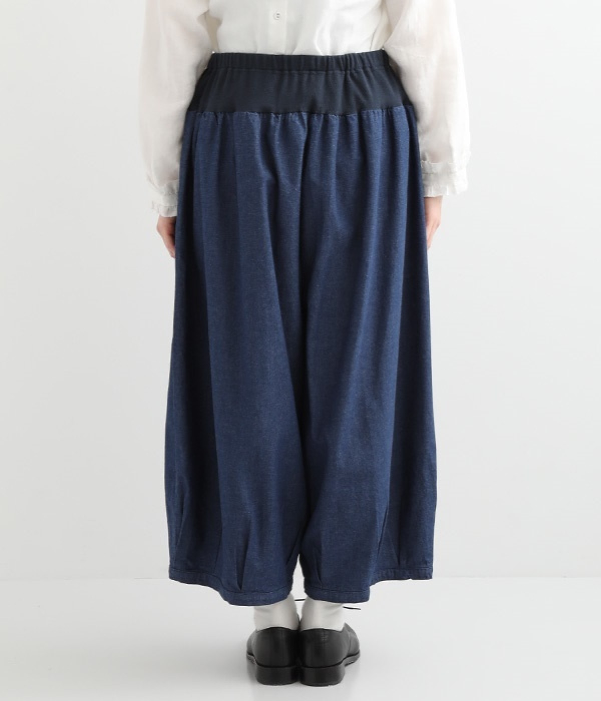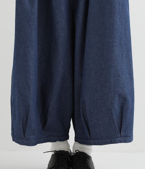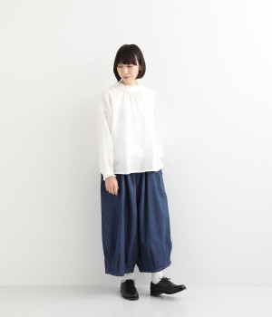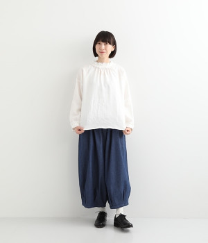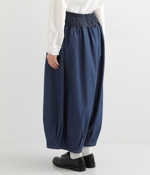 さらりとした優しい肌触りのコットンデニムのパンツです。裾にかけて丸く仕立てたバルーンシルエットが存在感ある着こなしを演出。ウエスト周りをすっきりとさせるため、伸縮性の高いテレコ生地を使用してウエストを包み込むように仕上げました。足首が見える少し短めの着丈が、バランスの良い着こなしを作ってくれます。