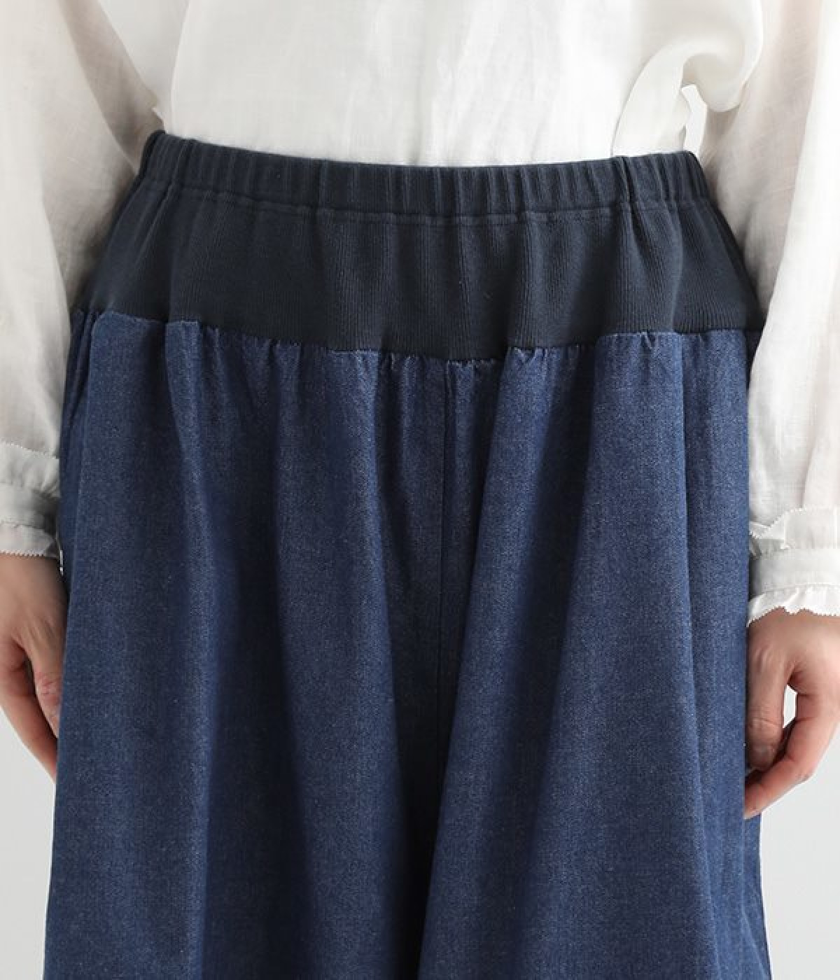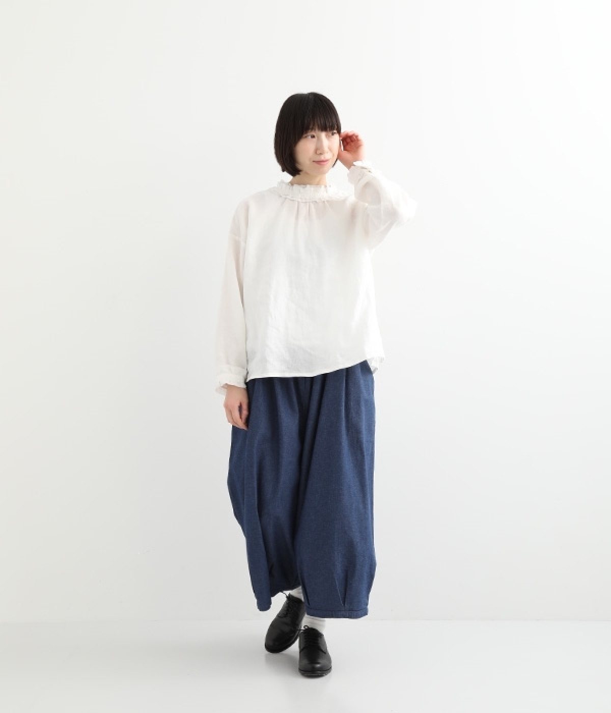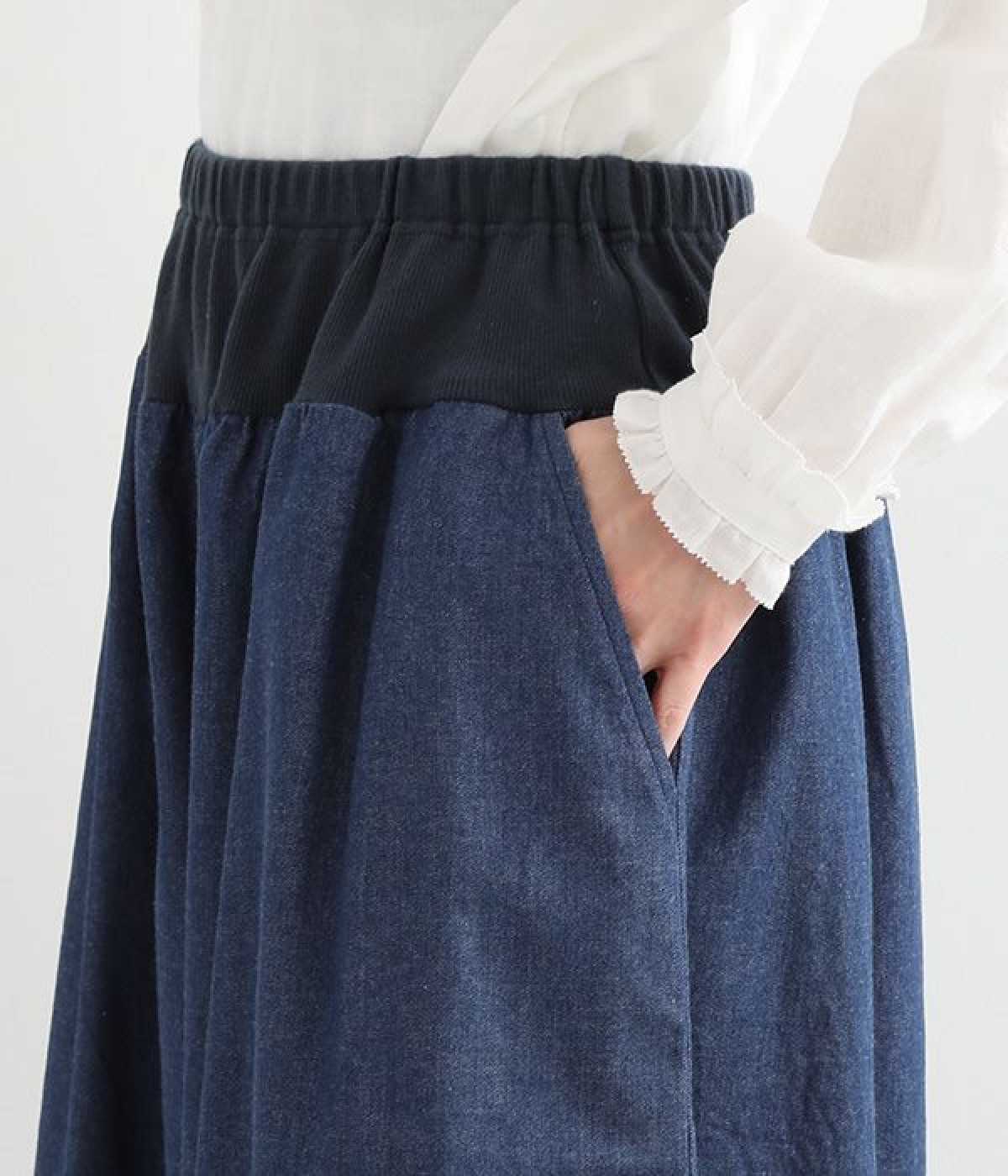 さらりとした優しい肌触りのコットンデニムのパンツです。裾にかけて丸く仕立てたバルーンシルエットが存在感ある着こなしを演出。ウエスト周りをすっきりとさせるため、伸縮性の高いテレコ生地を使用してウエストを包み込むように仕上げました。足首が見える少し短めの着丈が、バランスの良い着こなしを作ってくれます。
