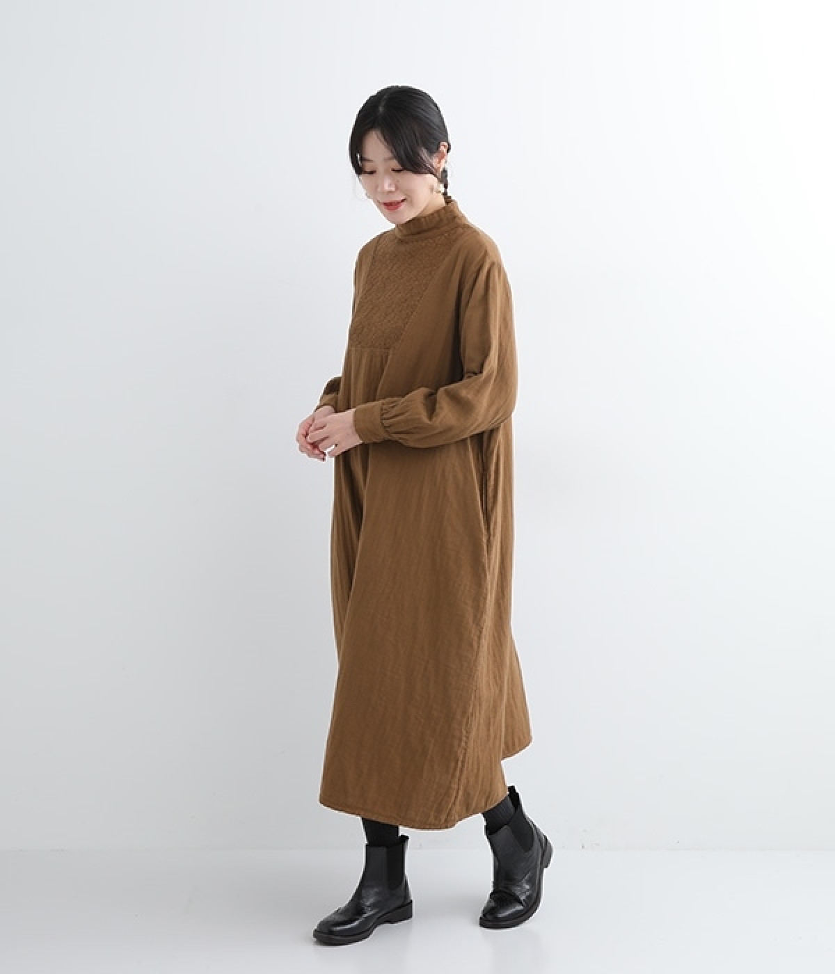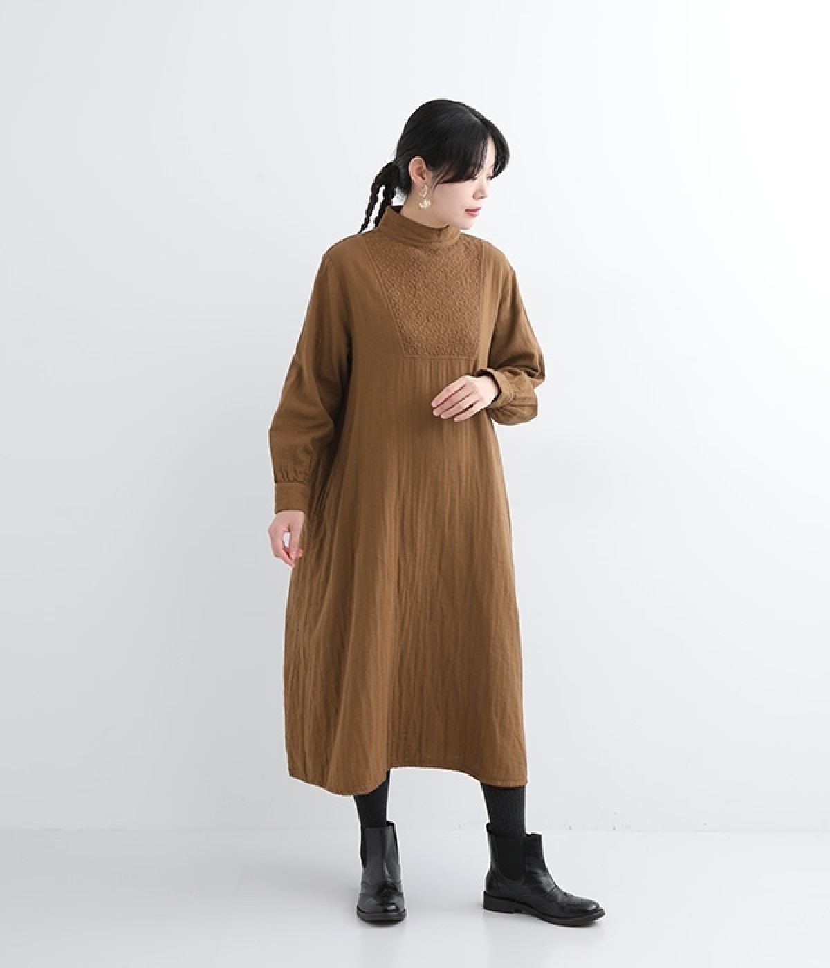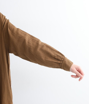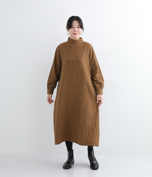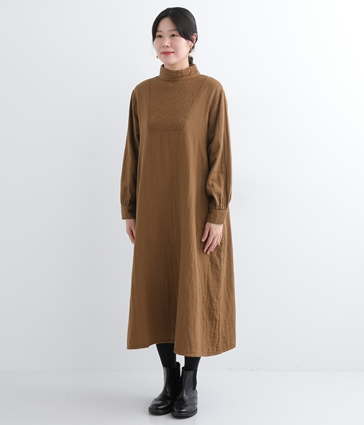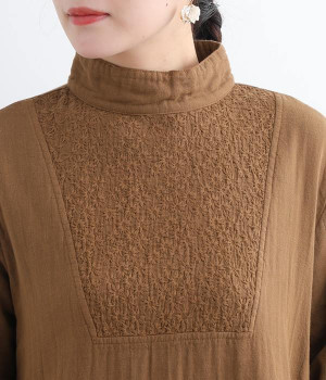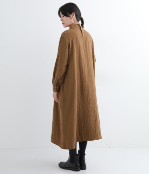 優しい風合いと、柔らかな肌触りが魅力的なコットンのトリプルガーゼを使ったワンピースです。襟元に同色の小花柄刺しゅう生地で切り替えたデザインがポイント。袖口はギャザーを寄せてカフス仕様にした、細かな部分にこだわった一枚です。ショートブーツとコーディネートしたり、裾からちらりとパンツをのぞかせたレイヤードスタイルもおすすめ。