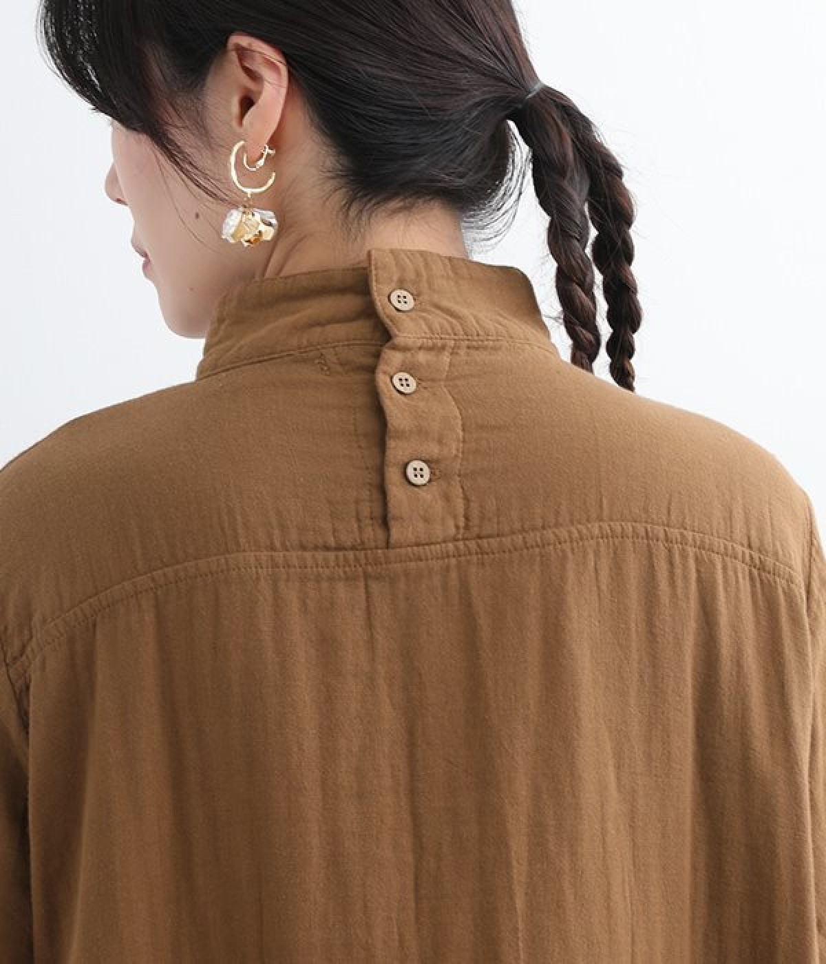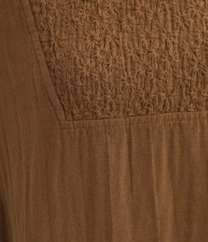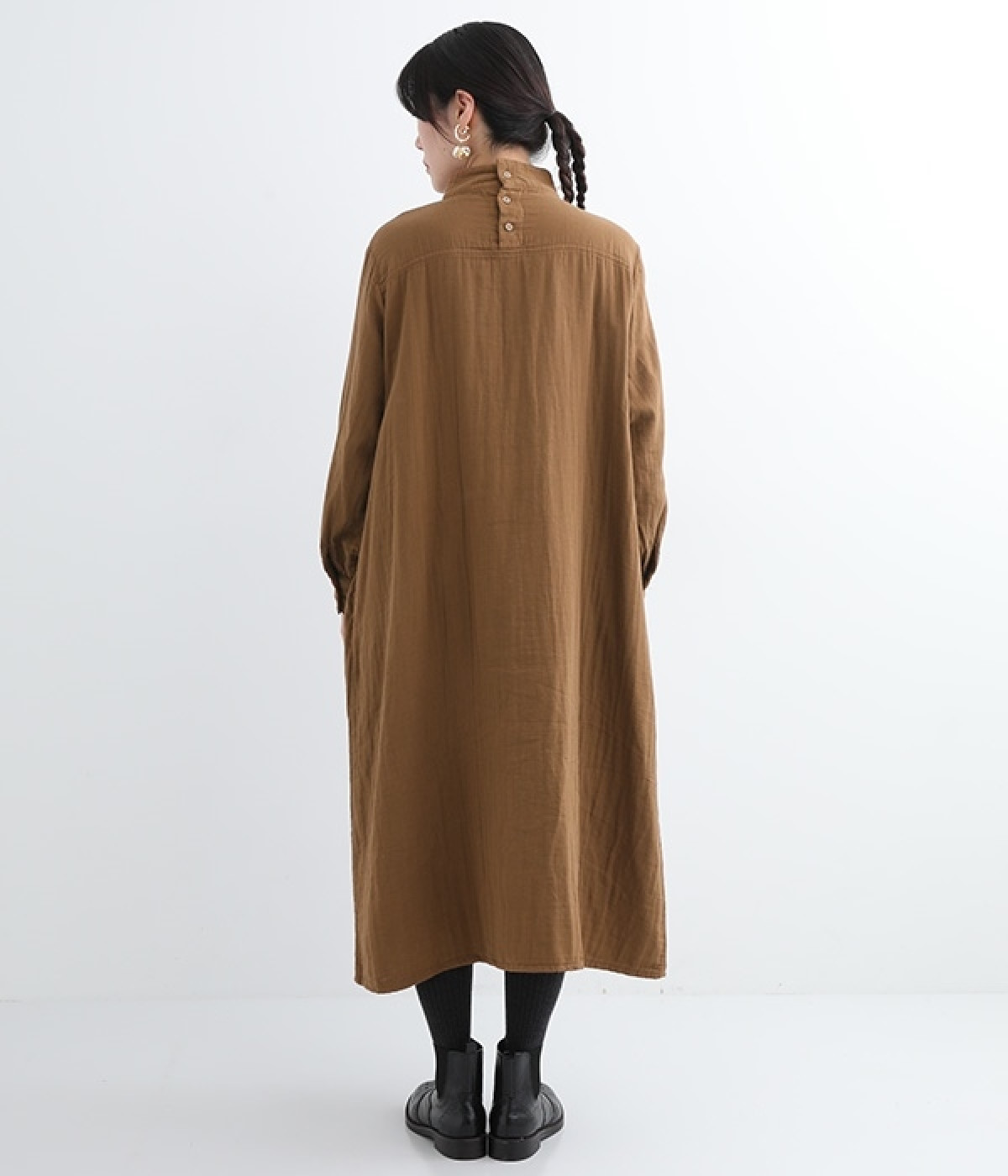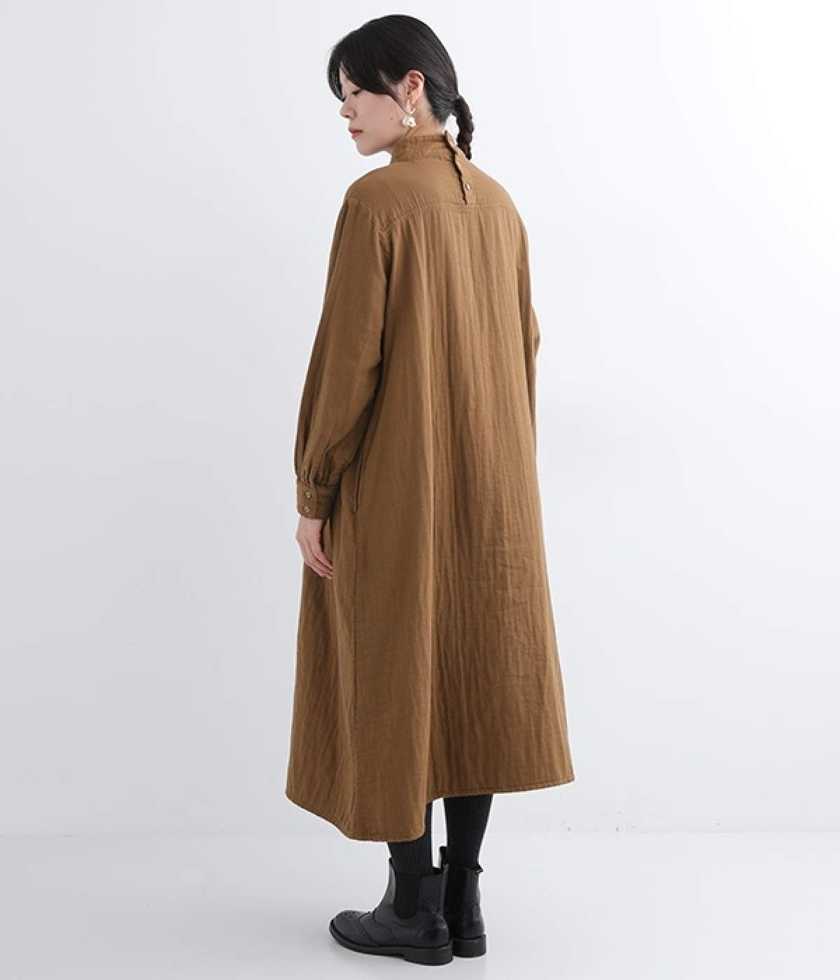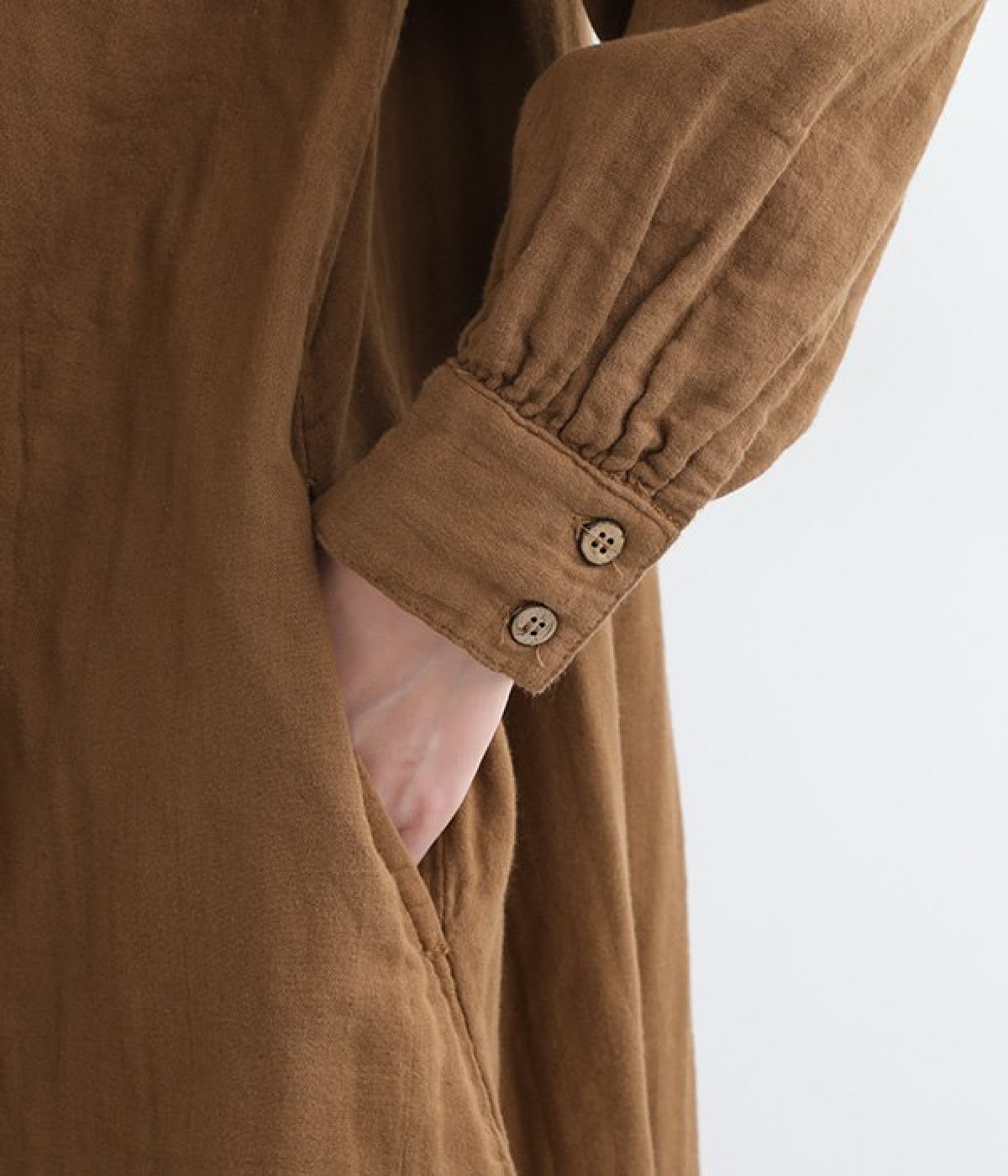 優しい風合いと、柔らかな肌触りが魅力的なコットンのトリプルガーゼを使ったワンピースです。襟元に同色の小花柄刺しゅう生地で切り替えたデザインがポイント。袖口はギャザーを寄せてカフス仕様にした、細かな部分にこだわった一枚です。ショートブーツとコーディネートしたり、裾からちらりとパンツをのぞかせたレイヤードスタイルもおすすめ。