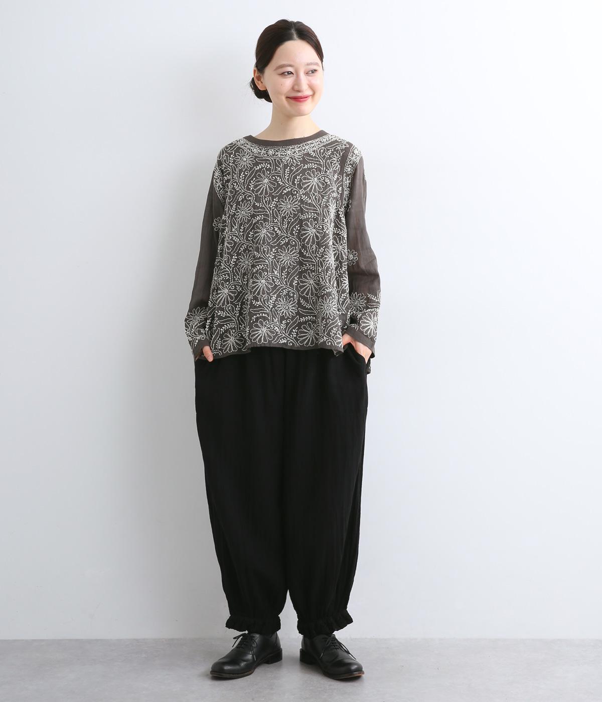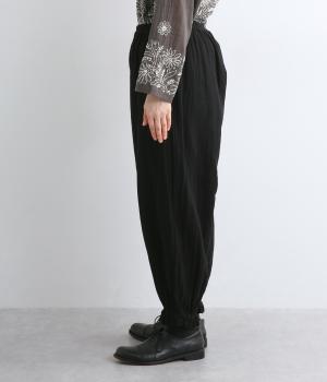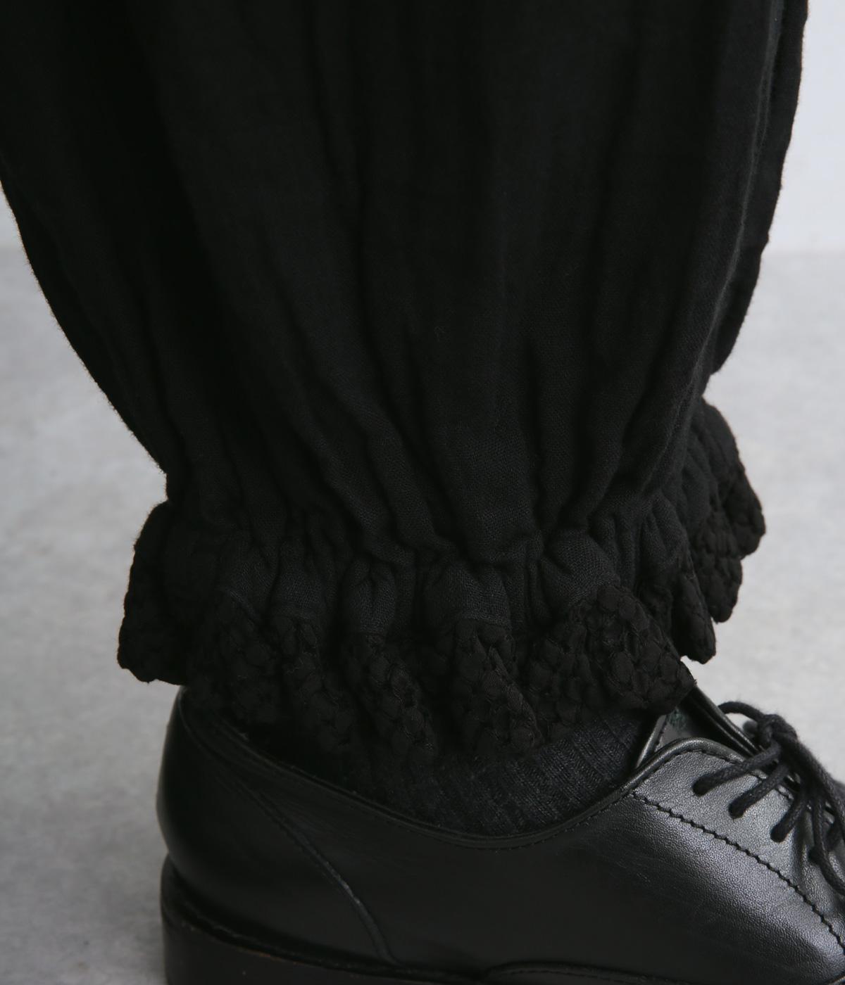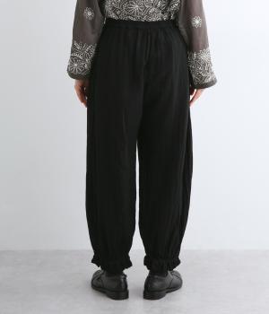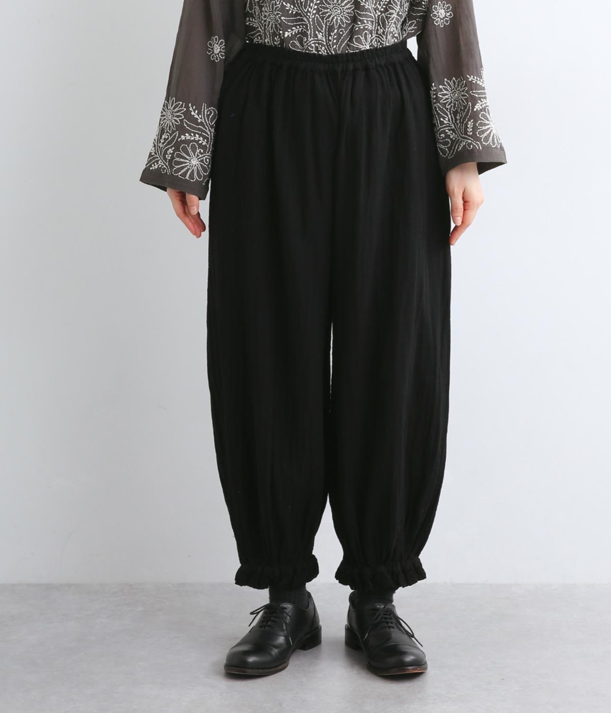 裾のレース使いが特徴的なパンツは、メリハリのあるシルエットでボリュームトップスやワンピースなどとのレイヤードにも活躍。ゴムギャザーを寄せているので裾をたくし上げて丈感のアレンジも◎。ウエストは総ゴムのイージー仕様。