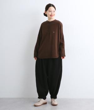 ふんわりとした肌あたりにやさしい表情が魅力的なコットンダブルガーゼで仕立てました。吸湿・速乾・通気性に優れた薄めの中厚手生地でロングシーズン活躍します。