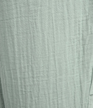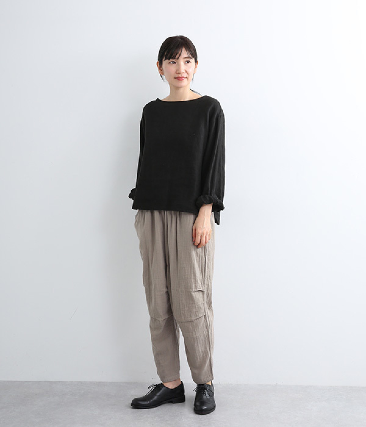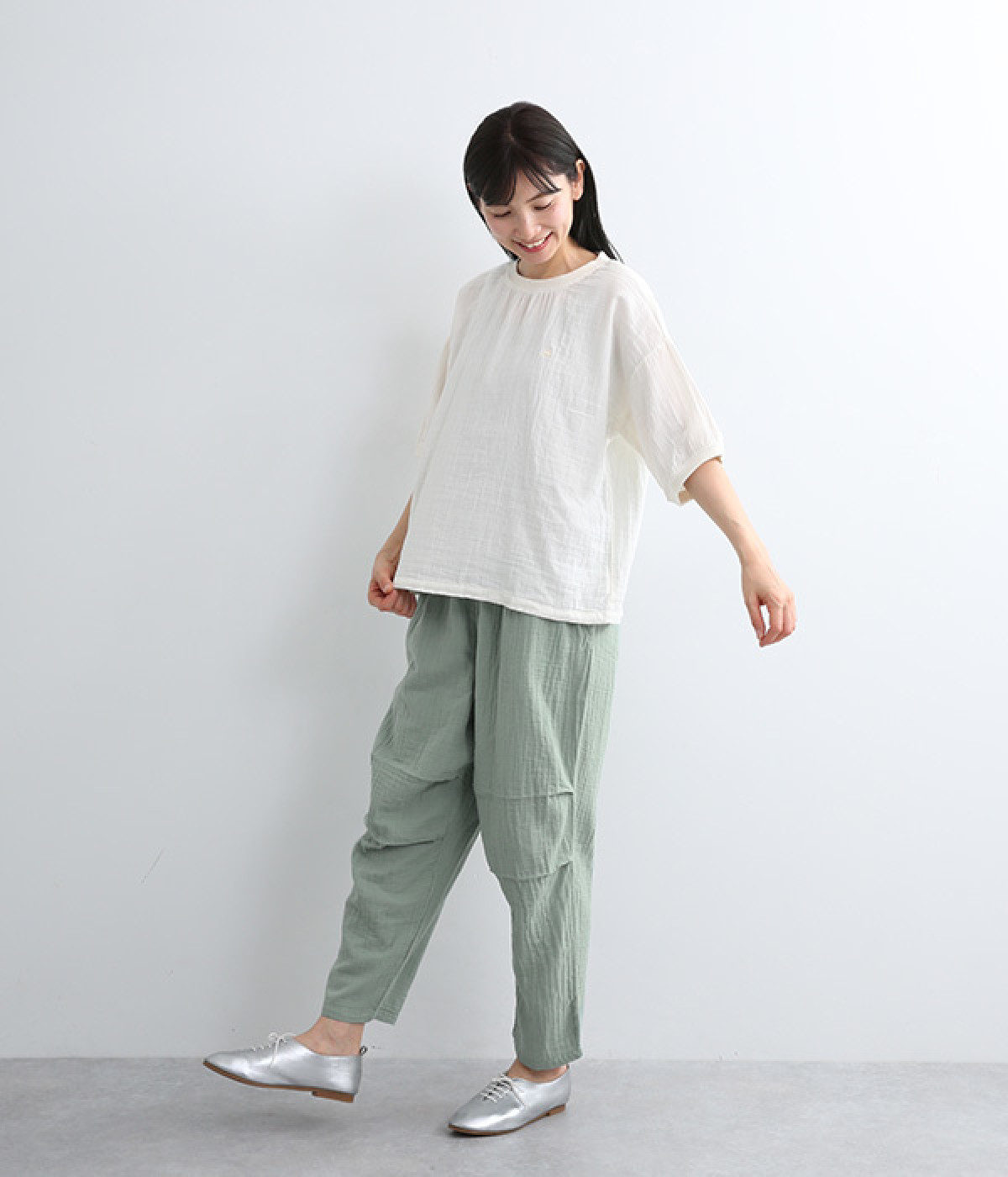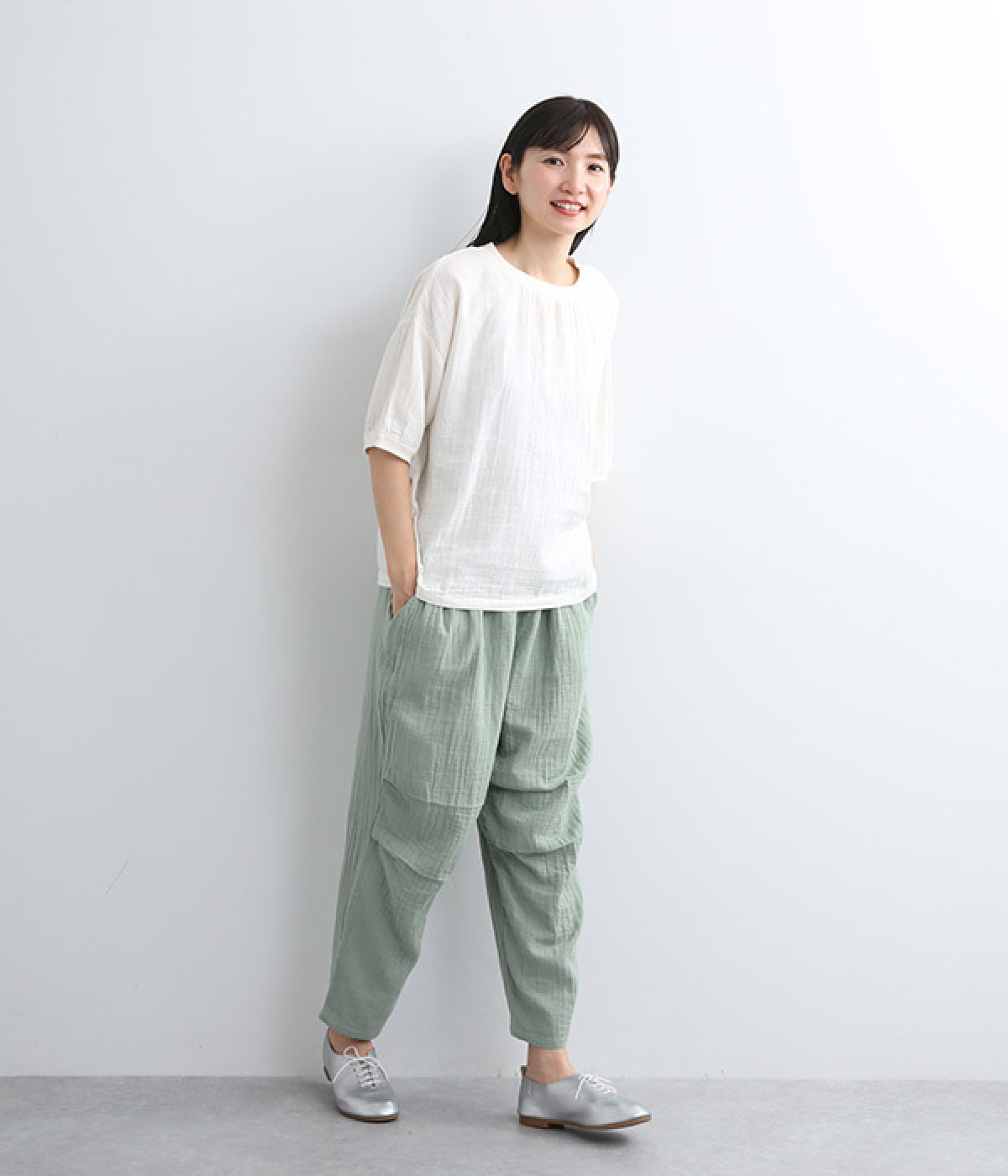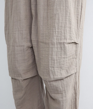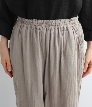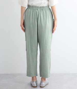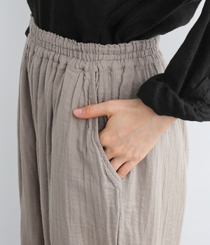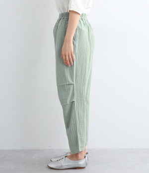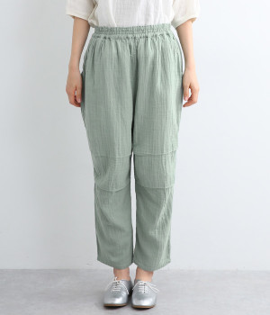 ふんわりやさしい肌ざわりのダブルガーゼを使用したパンツ。通気性や吸湿性に優れた素材は、暑い季節でもサラッとさわやかな穿き心地が続きます。シルエットは裾にかけて細くシェイプをかけたテーパード。ひざにタックをよせることで立体的なフォルムに仕上げました。ウエストはお腹まわりへのストレスが少ない総ゴム仕様に。シンプルながらも人と差がつく小技をきかせ、ワンランク上の着こなしを叶えます。