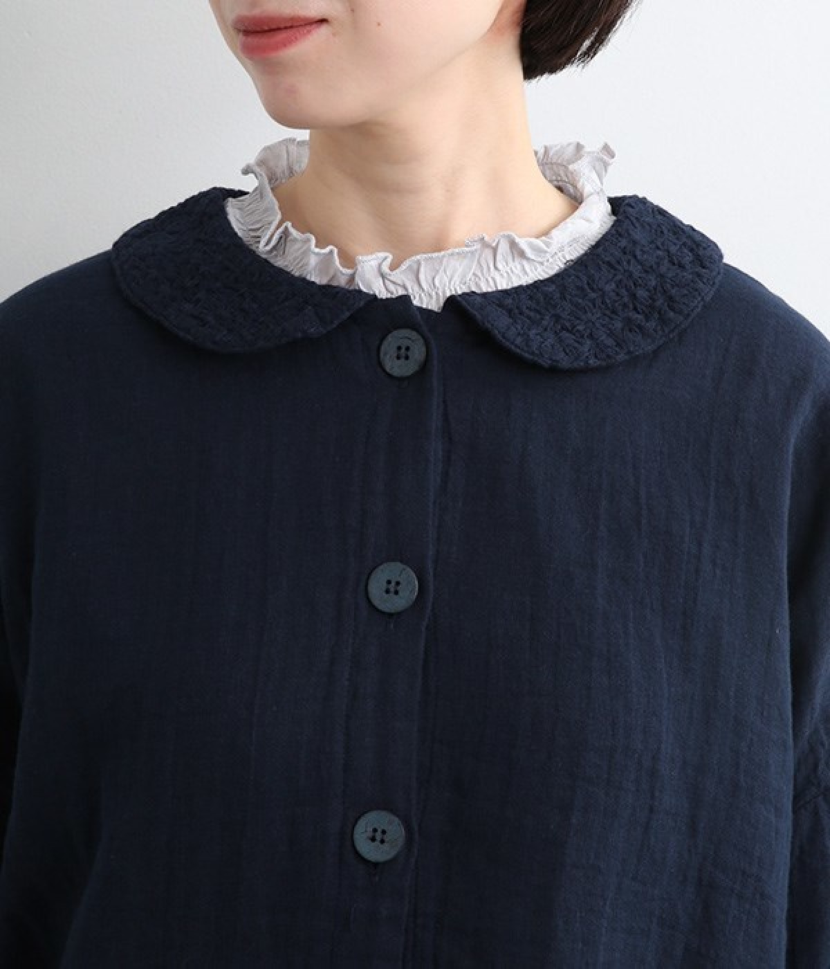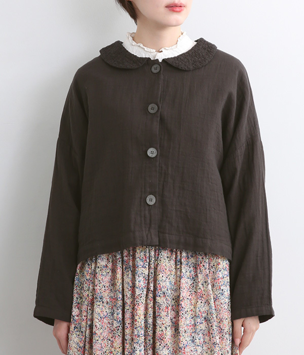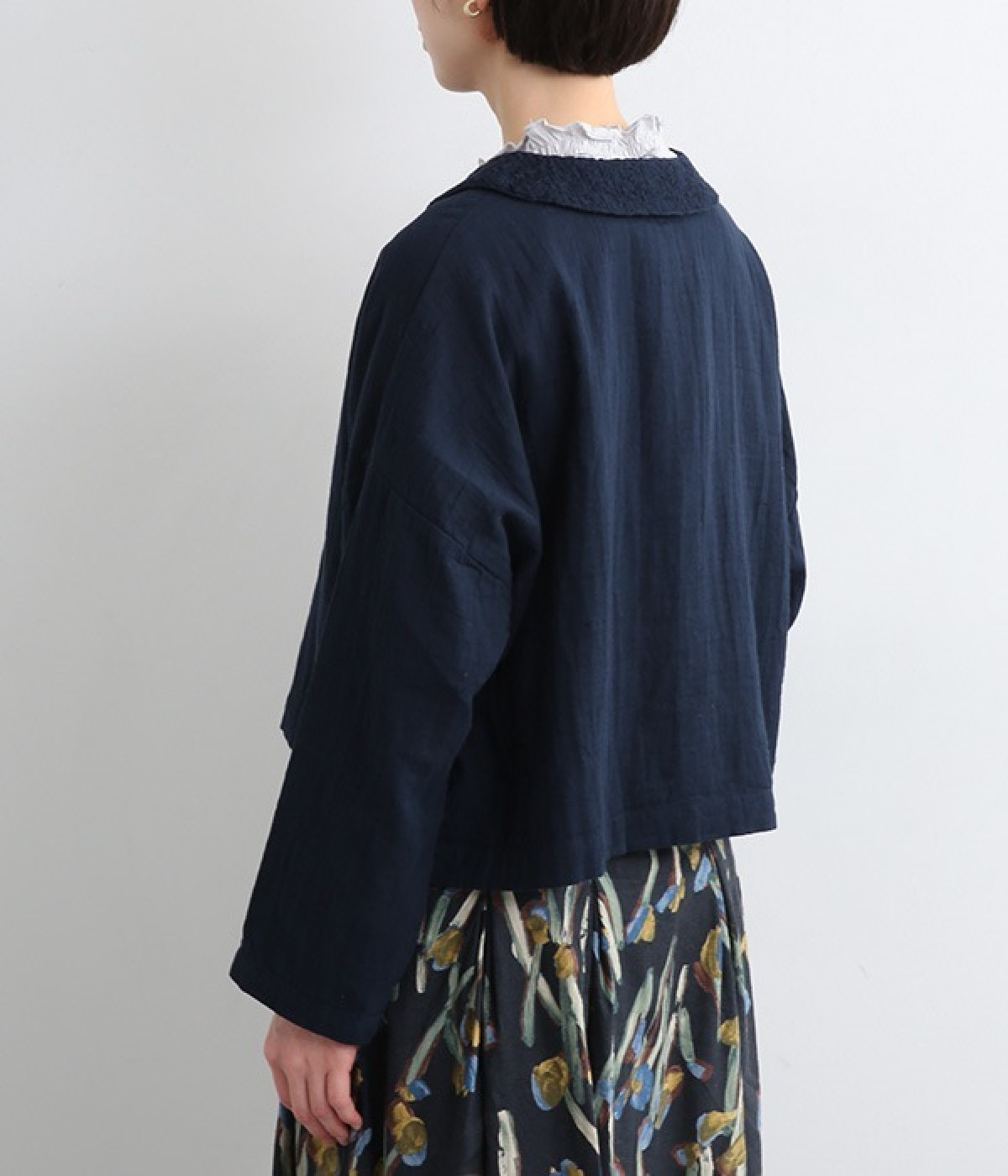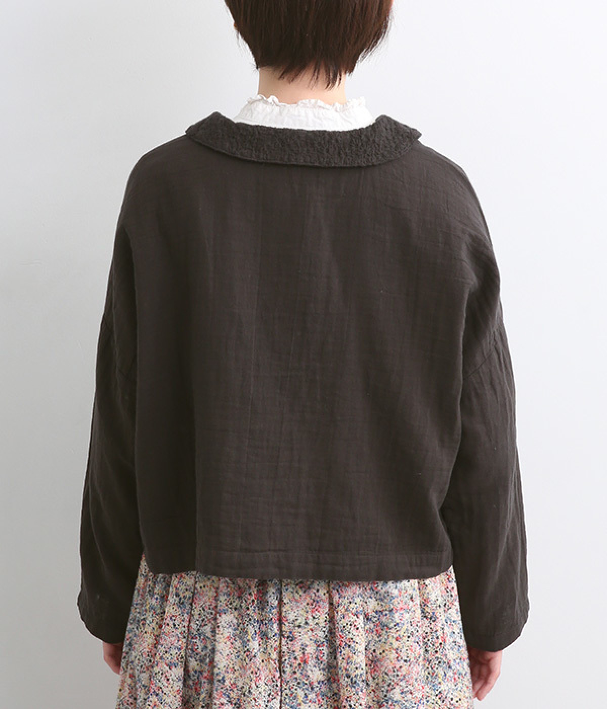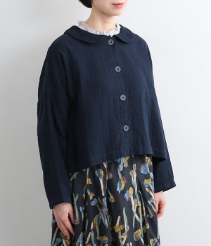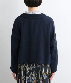 大きくあいた首元に映える刺繍入りの丸襟デザインがかわいらしいブラウス。軽くやさしい肌ざわりが心地よいコットンダブルガーゼで仕立てました。生地の表面に現れる洗いざらしのようなシワや、くったりやわらかな風合いがナチュラルな雰囲気を引き立てます。ワイドなシルエットにコンパクトなクロップド丈が絶妙なバランスを保ち、さまざまな着こなしにすっとなじみます。前を開けて羽織り感覚でスタイリングするのも素敵です。