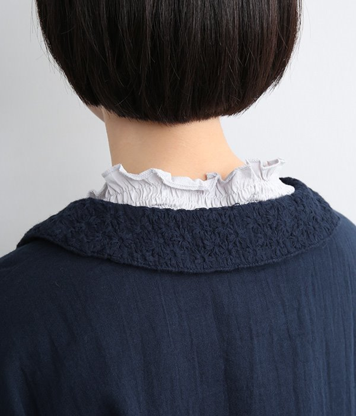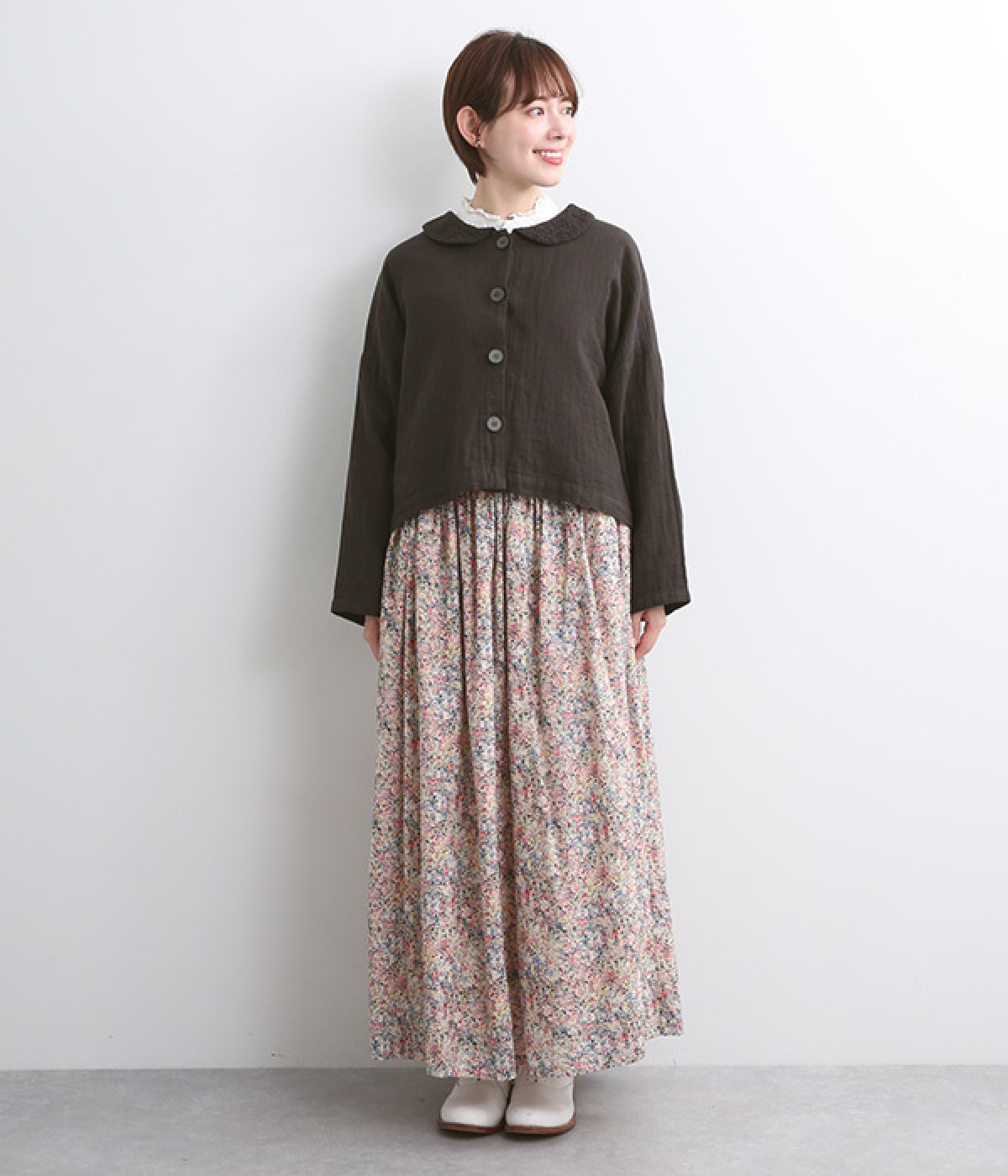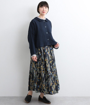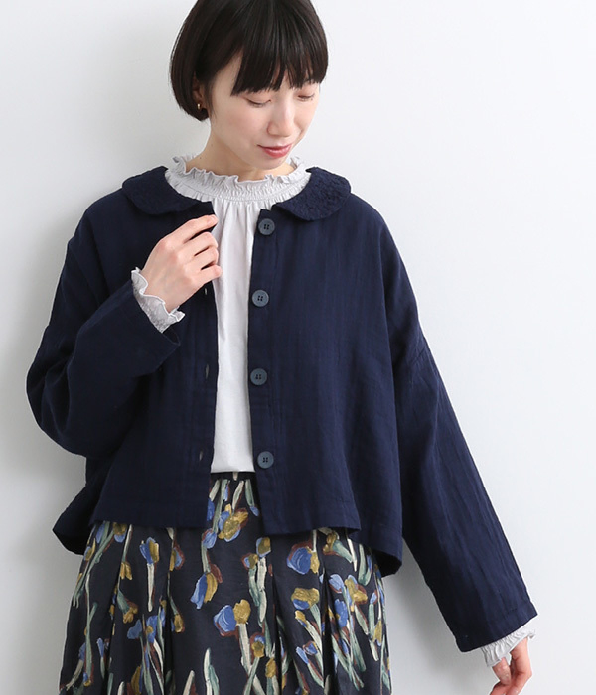 大きくあいた首元に映える刺繍入りの丸襟デザインがかわいらしいブラウス。軽くやさしい肌ざわりが心地よいコットンダブルガーゼで仕立てました。生地の表面に現れる洗いざらしのようなシワや、くったりやわらかな風合いがナチュラルな雰囲気を引き立てます。ワイドなシルエットにコンパクトなクロップド丈が絶妙なバランスを保ち、さまざまな着こなしにすっとなじみます。前を開けて羽織り感覚でスタイリングするのも素敵です。