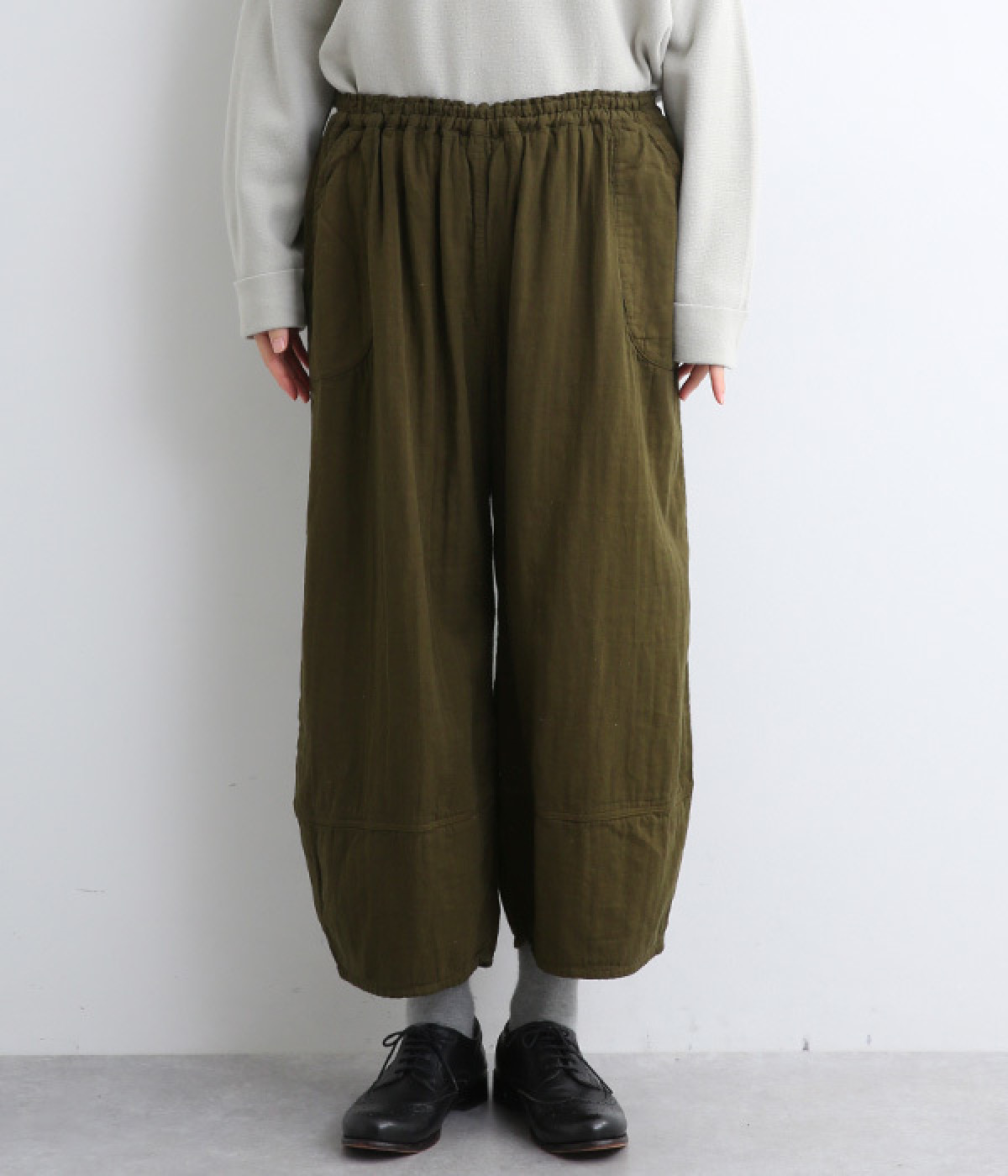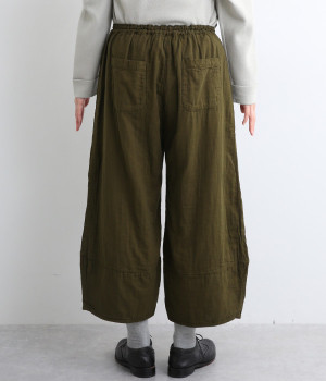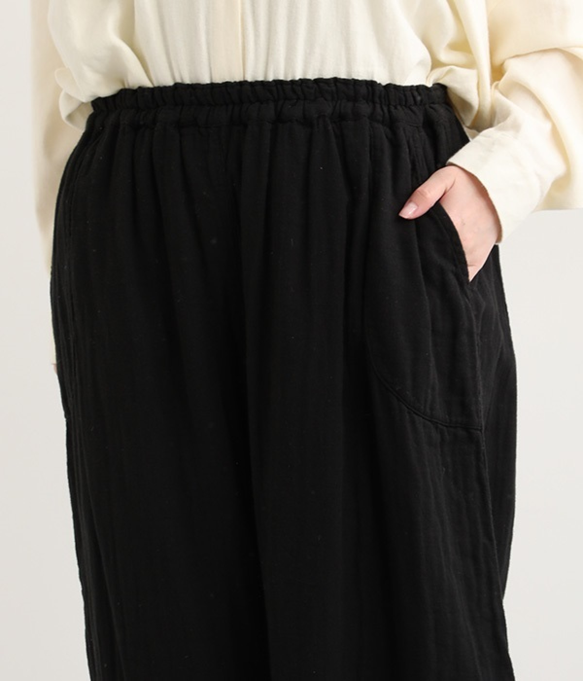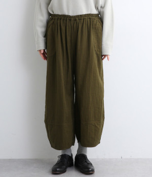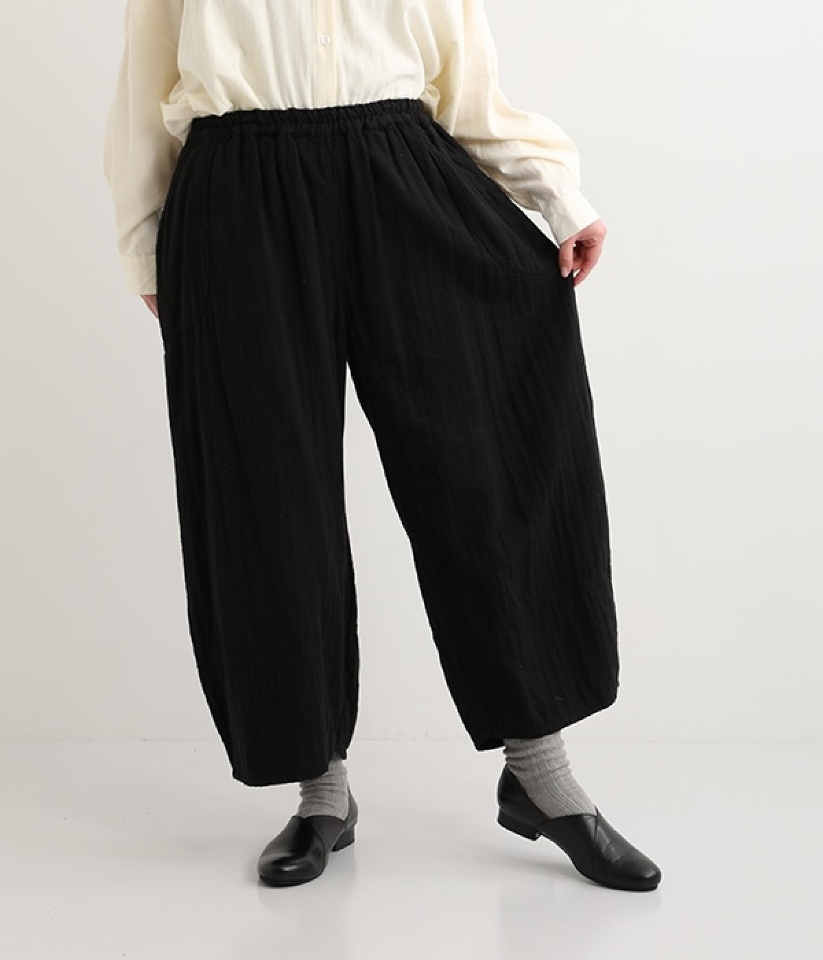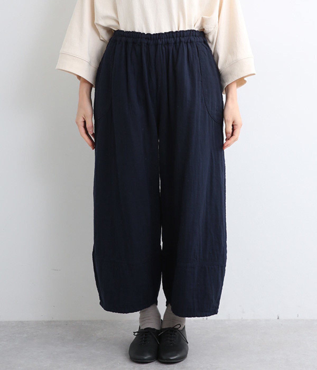 トリプルガーゼ生地使いが特徴的なピエロパンツです。ガーゼ生地を3枚重ねることで保温性があり、軽くてあたたかな機能性ある生地になっています。触り心地も柔らかながら適度にしっかりとしています。裾に向かって丸みのあるピエロパンツは、クロップド丈なので靴下見えのするコーディネートもおすすめ。ウエストは総ゴム仕様でリラックス感のある履き心地も嬉しいポイント。