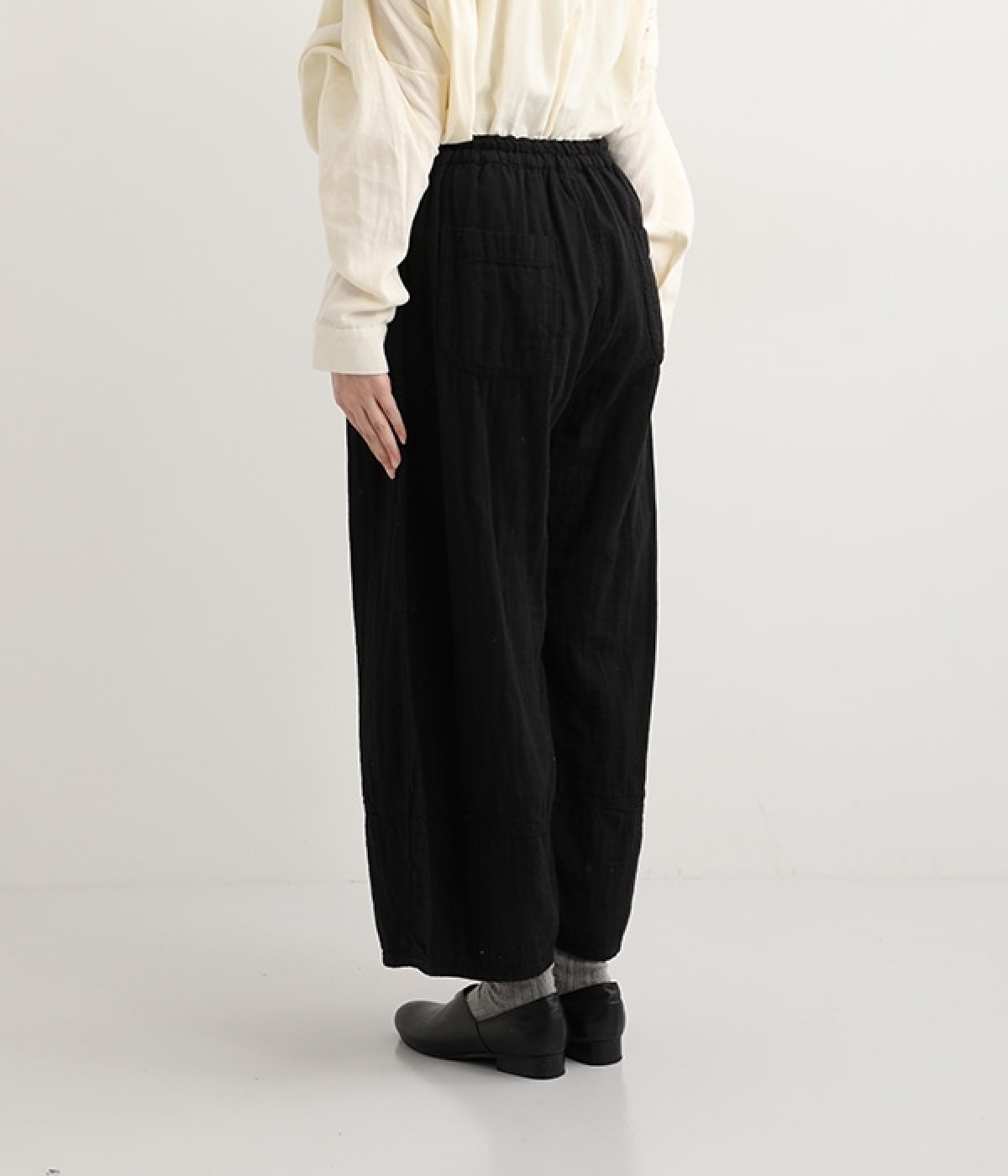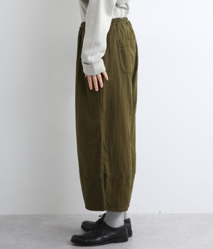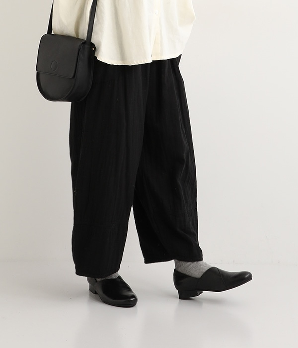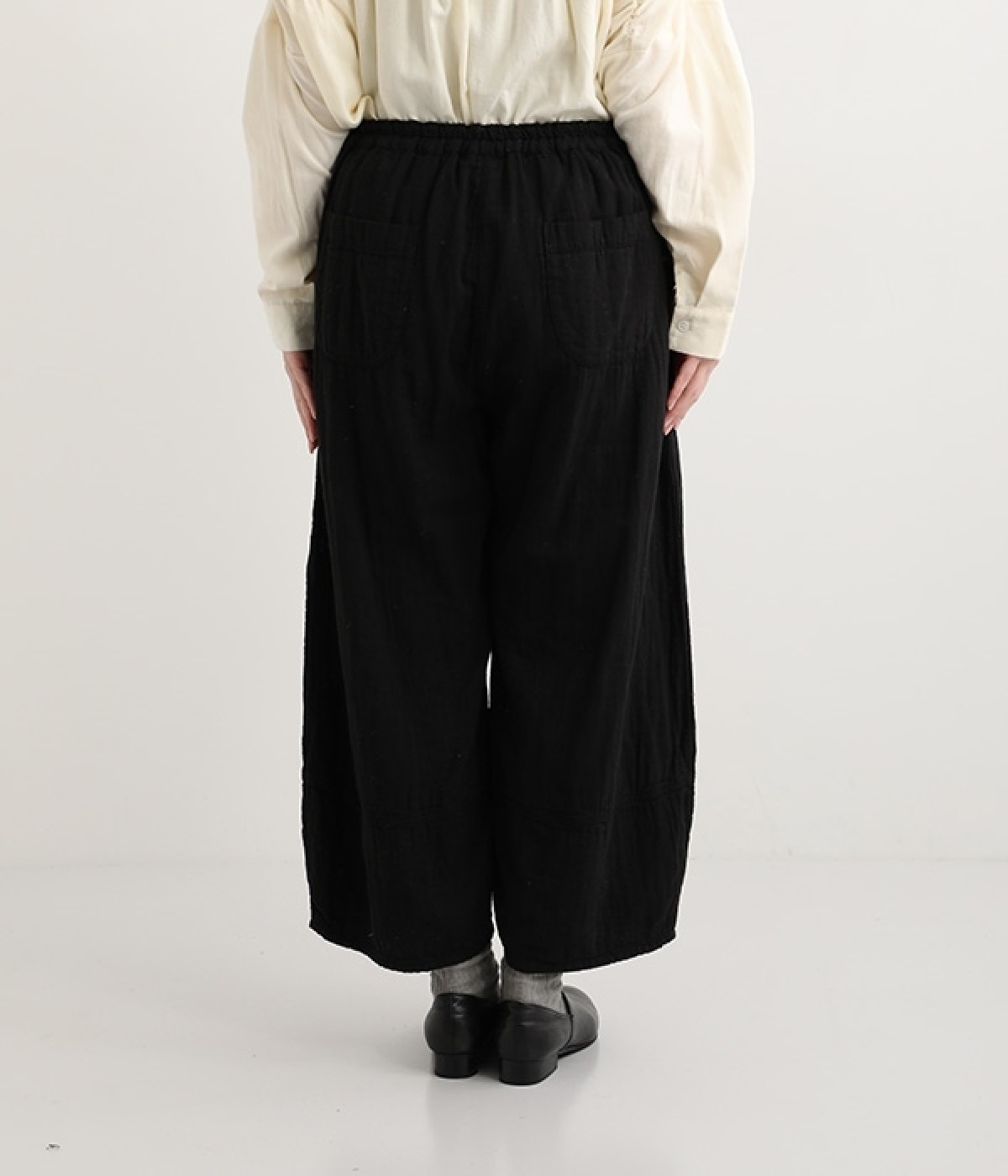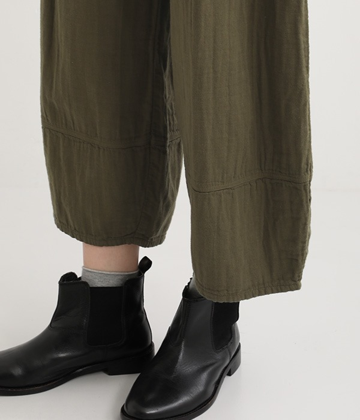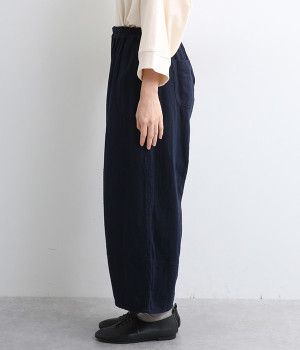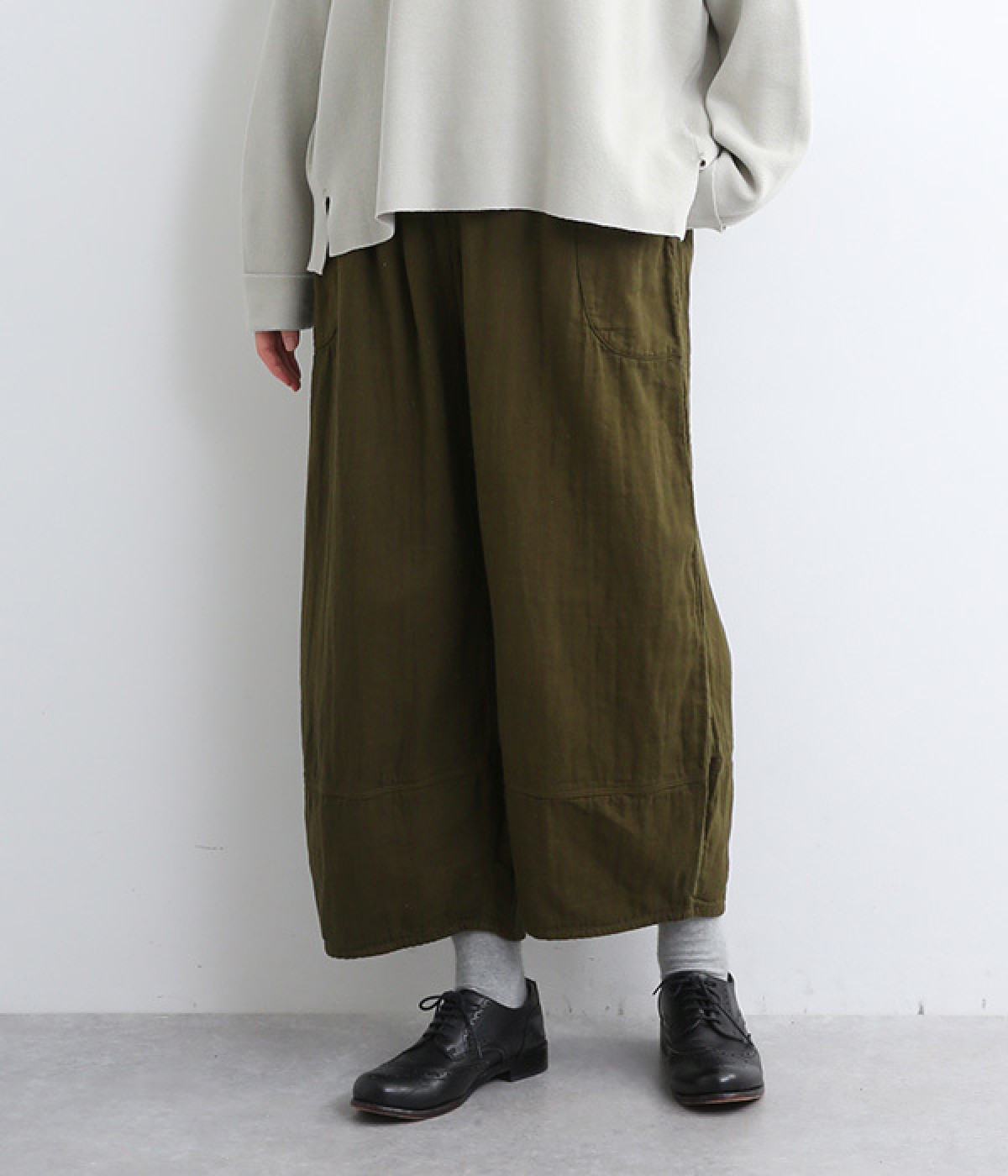 トリプルガーゼ生地使いが特徴的なピエロパンツです。ガーゼ生地を3枚重ねることで保温性があり、軽くてあたたかな機能性ある生地になっています。触り心地も柔らかながら適度にしっかりとしています。裾に向かって丸みのあるピエロパンツは、クロップド丈なので靴下見えのするコーディネートもおすすめ。ウエストは総ゴム仕様でリラックス感のある履き心地も嬉しいポイント。
