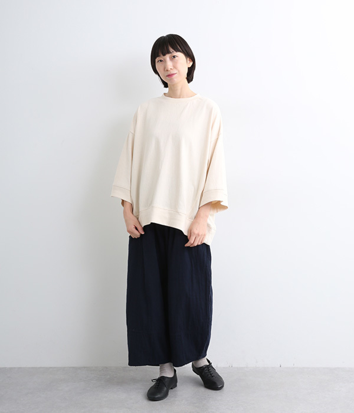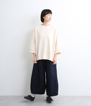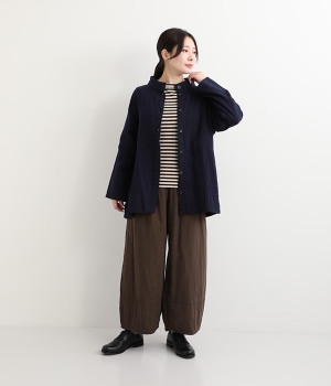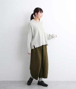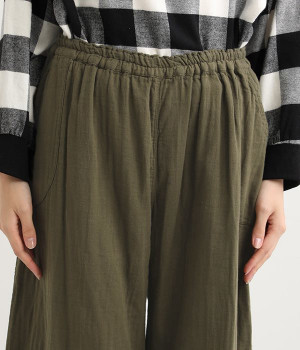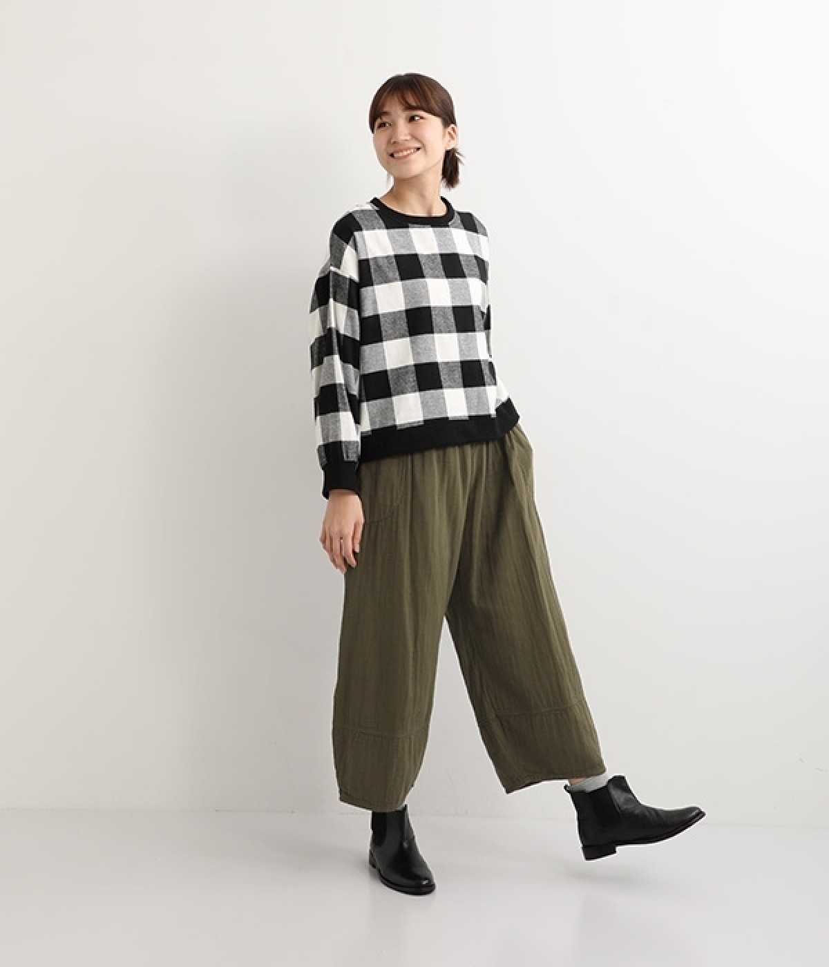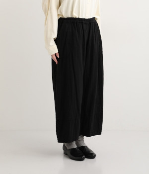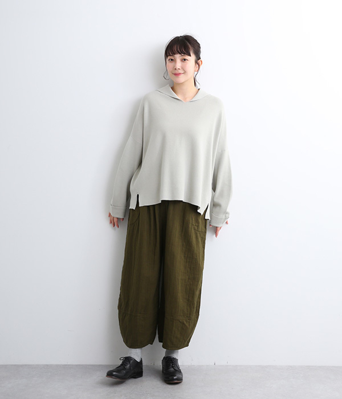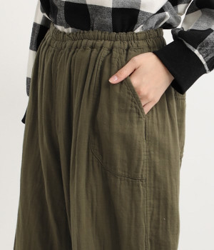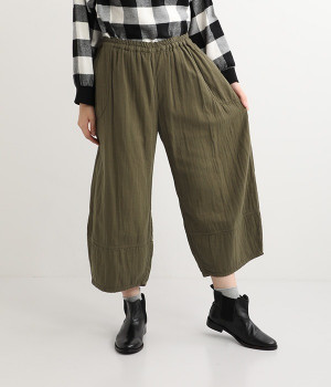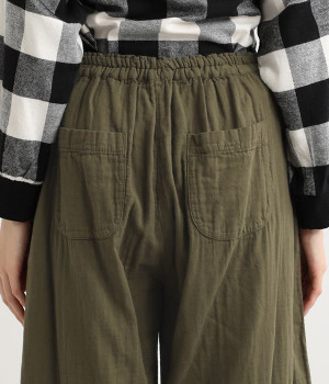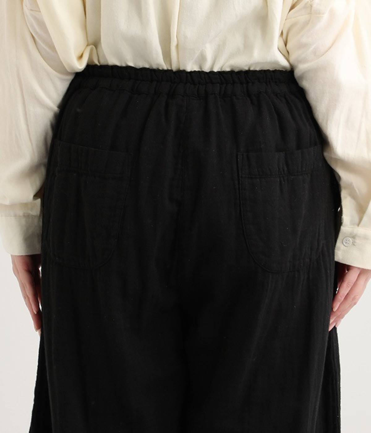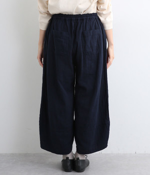 トリプルガーゼ生地使いが特徴的なピエロパンツです。ガーゼ生地を3枚重ねることで保温性があり、軽くてあたたかな機能性ある生地になっています。触り心地も柔らかながら適度にしっかりとしています。裾に向かって丸みのあるピエロパンツは、クロップド丈なので靴下見えのするコーディネートもおすすめ。ウエストは総ゴム仕様でリラックス感のある履き心地も嬉しいポイント。