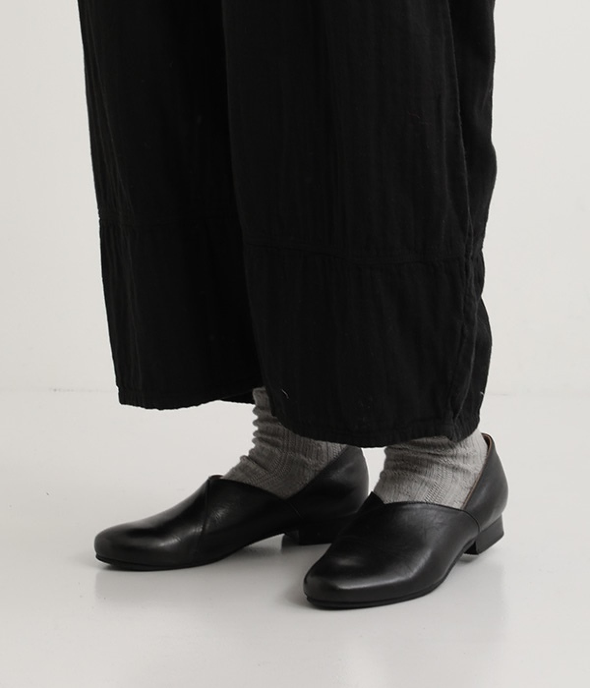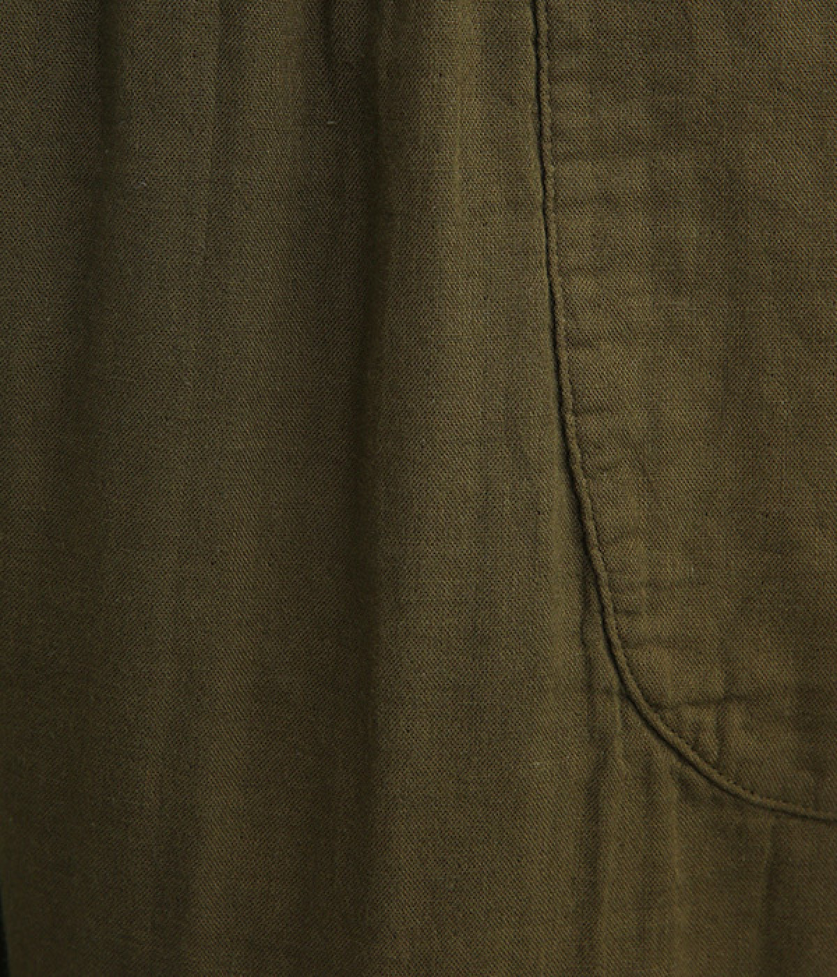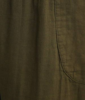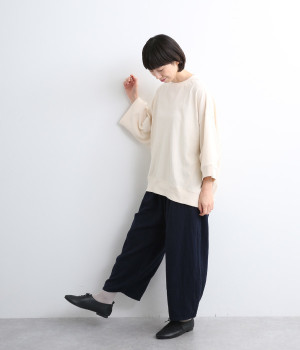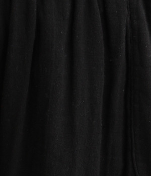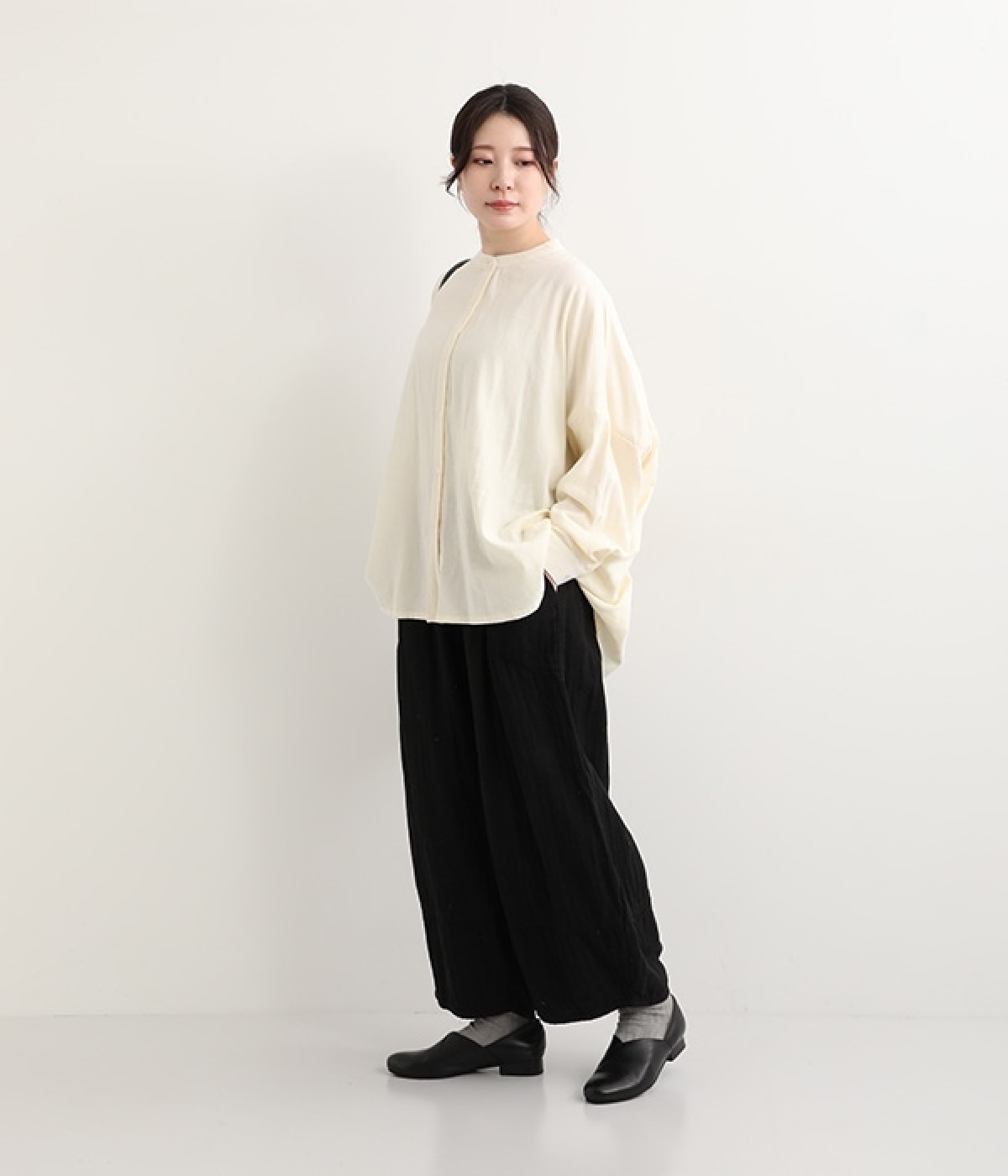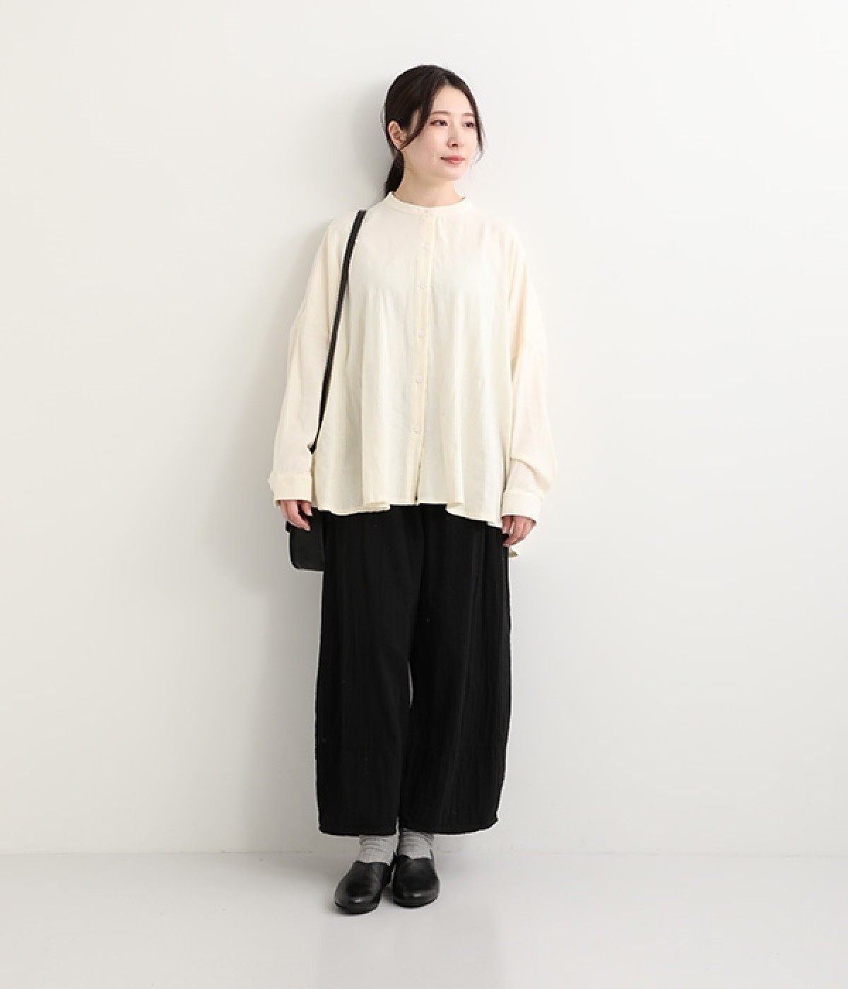 トリプルガーゼ生地使いが特徴的なピエロパンツです。ガーゼ生地を3枚重ねることで保温性があり、軽くてあたたかな機能性ある生地になっています。触り心地も柔らかながら適度にしっかりとしています。裾に向かって丸みのあるピエロパンツは、クロップド丈なので靴下見えのするコーディネートもおすすめ。ウエストは総ゴム仕様でリラックス感のある履き心地も嬉しいポイント。