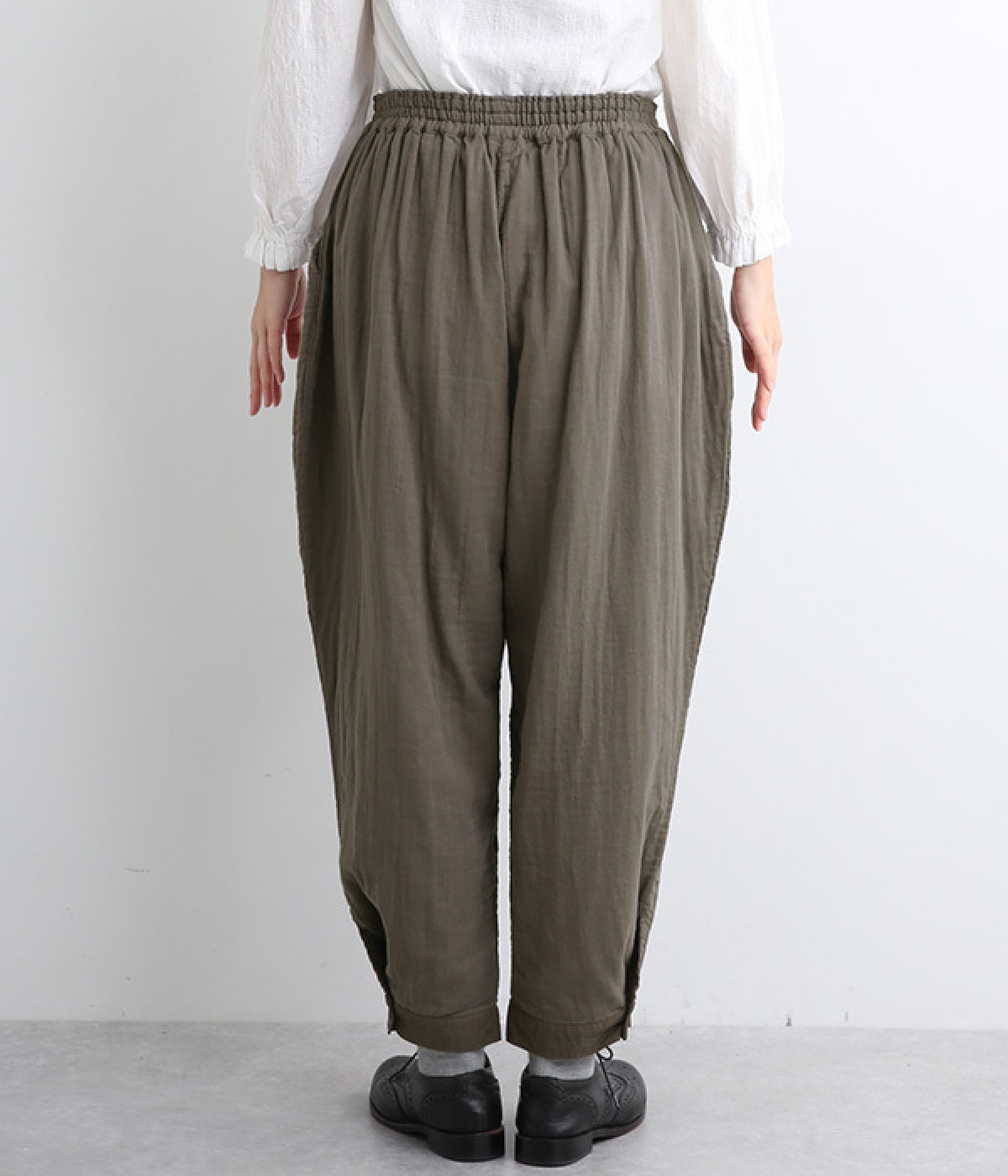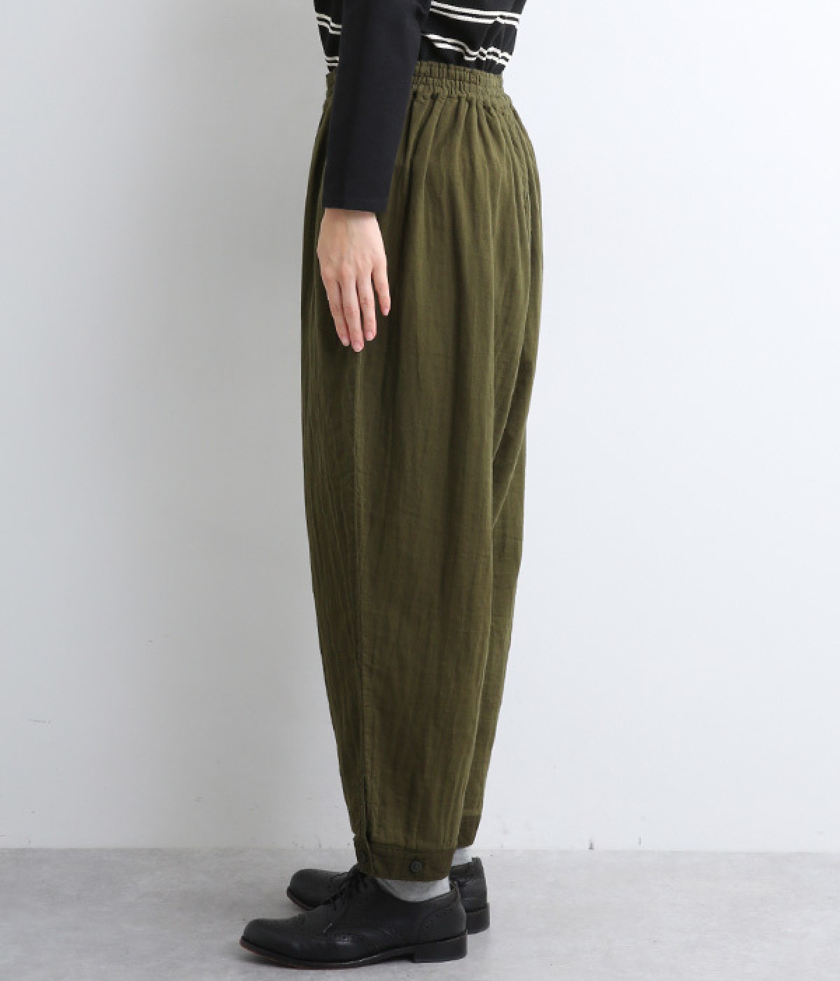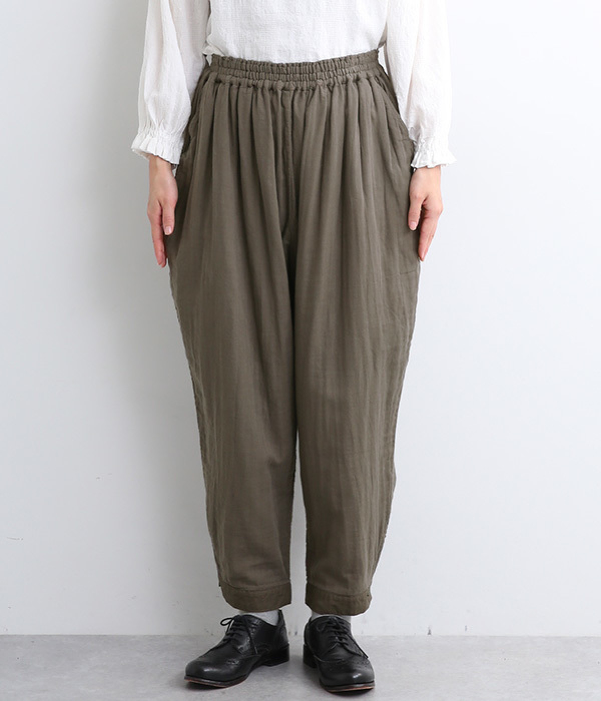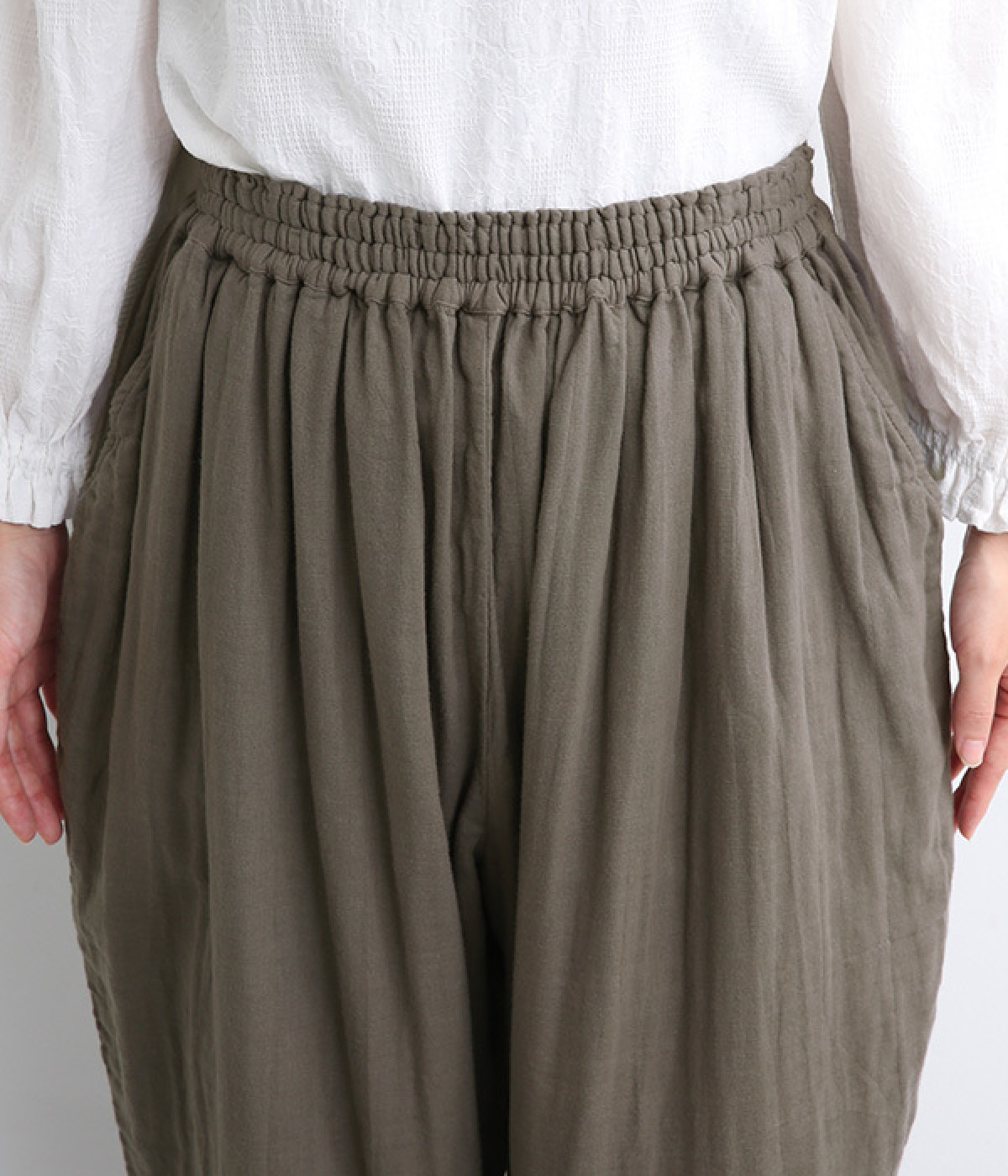 腰まわりのドレープが生むやわらかなフォルムではき心地快適に