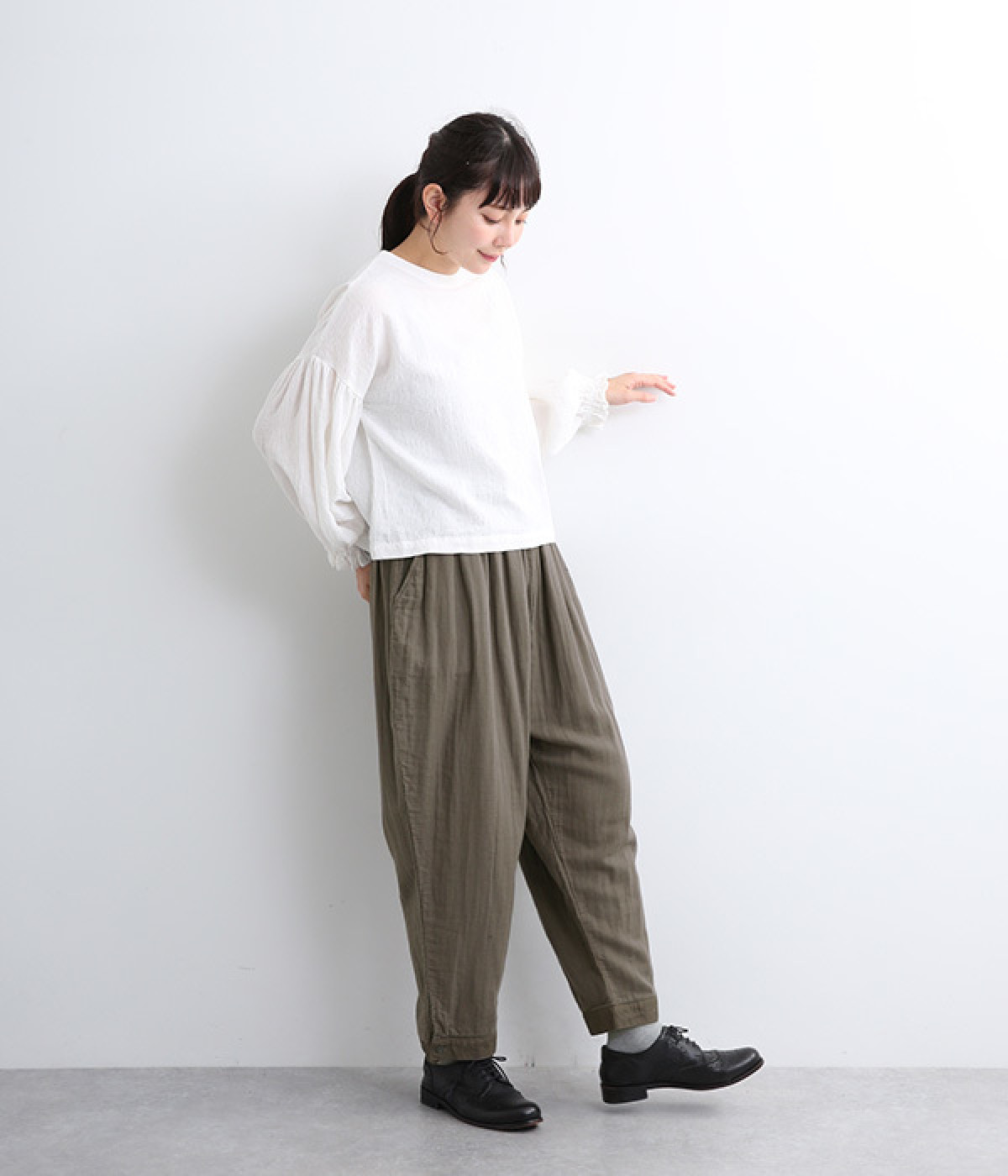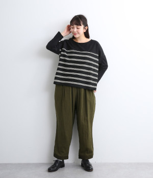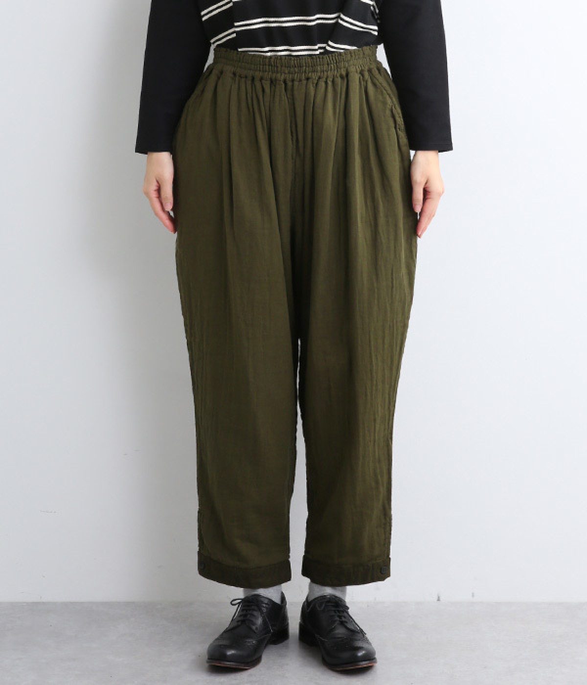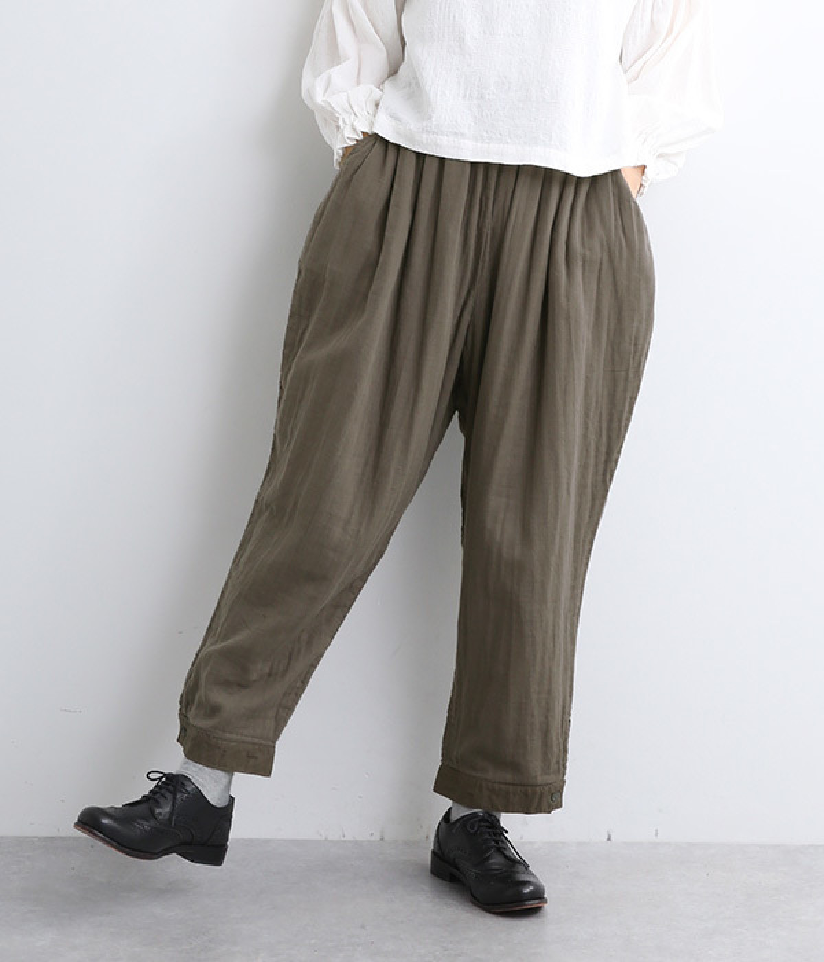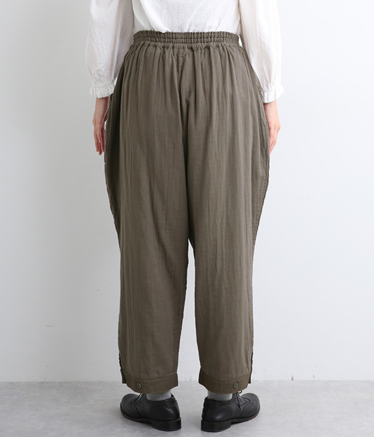 腰まわりのドレープが生むやわらかなフォルムではき心地快適に