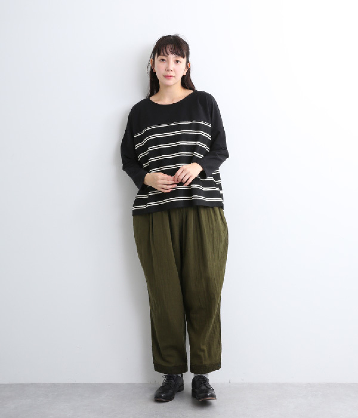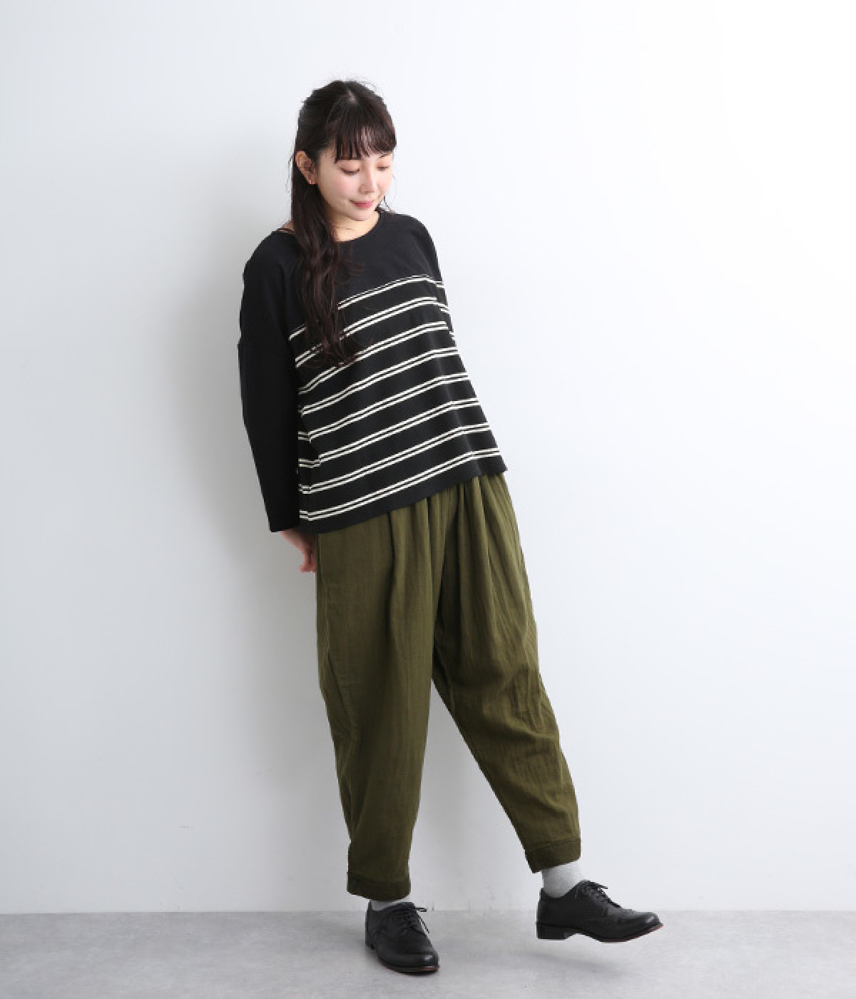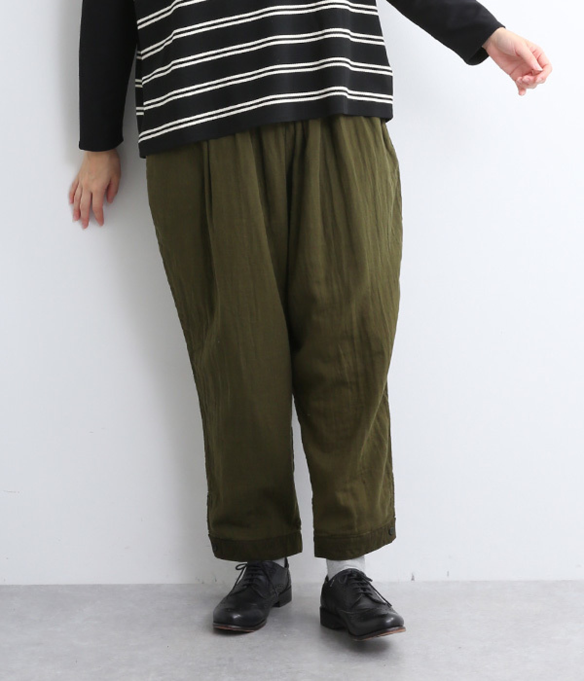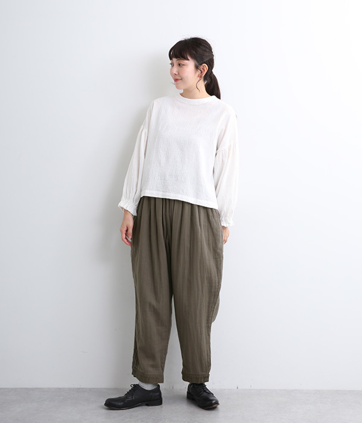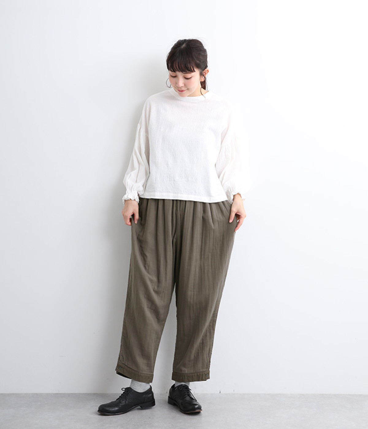 腰まわりのドレープが生むやわらかなフォルムではき心地快適に